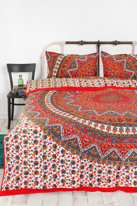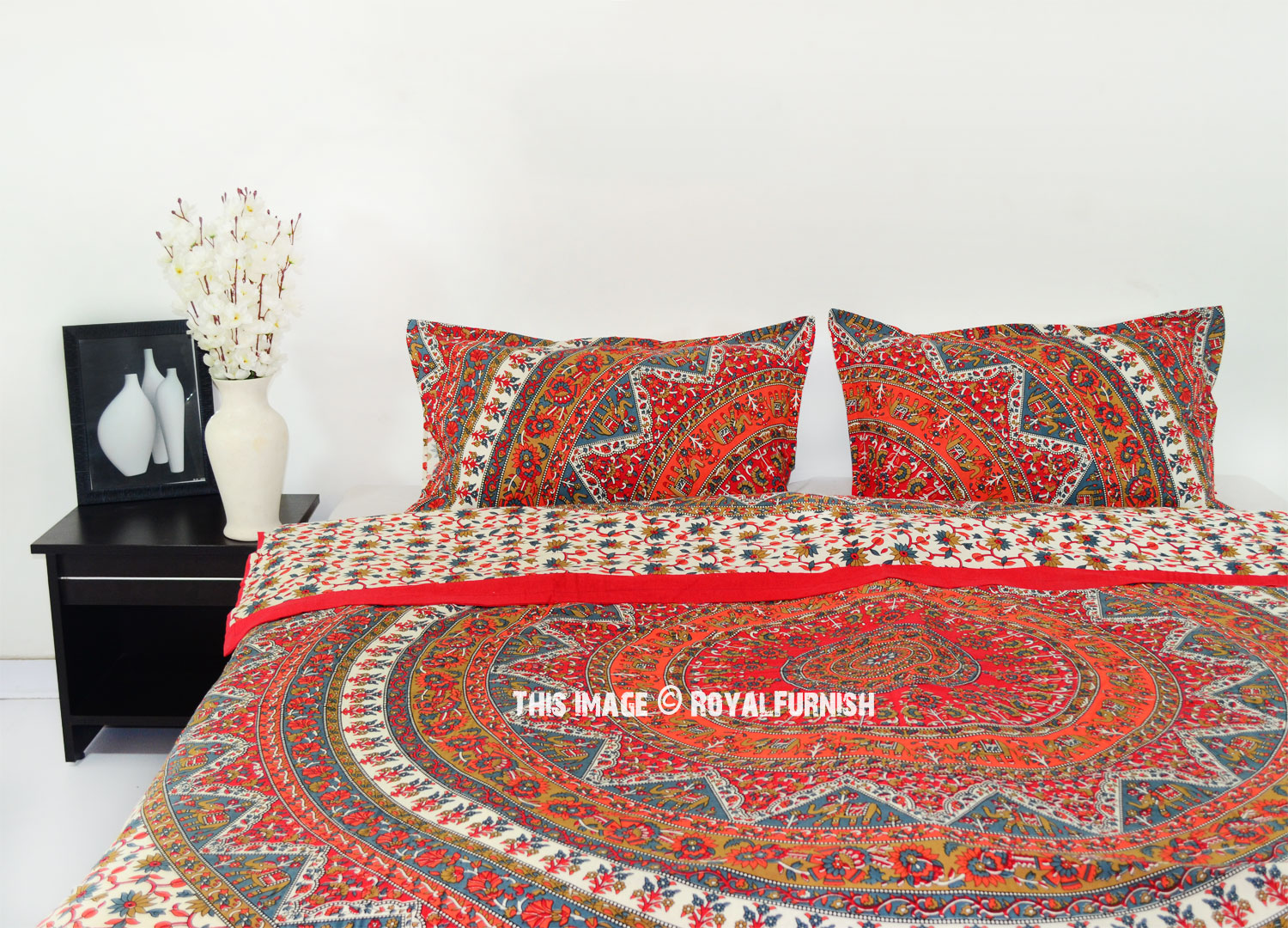 Red Bohemian Kerala Mandala Colorful Queen Size Duvet Cover with Set of Pillow Covers