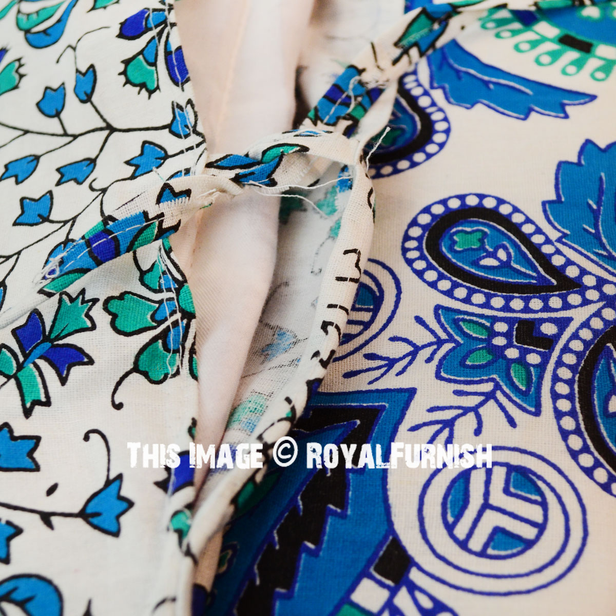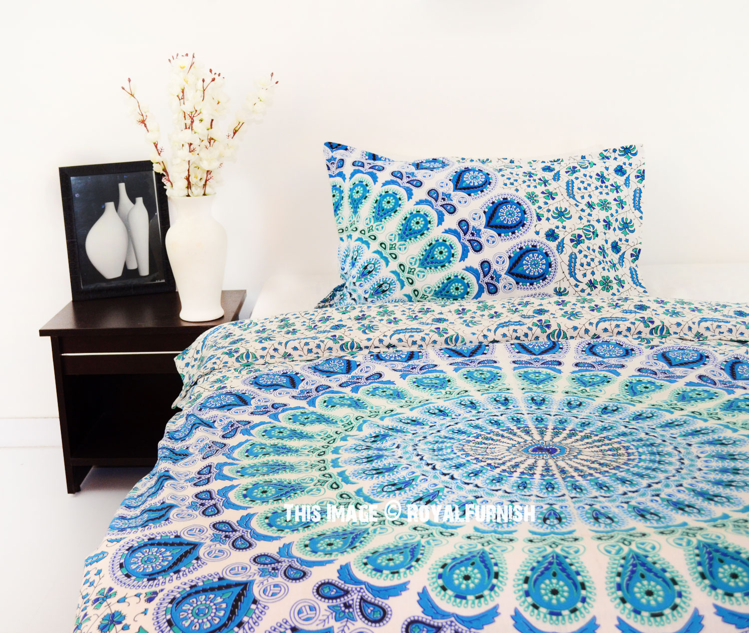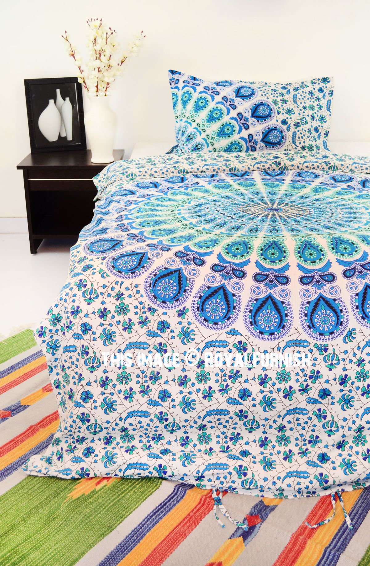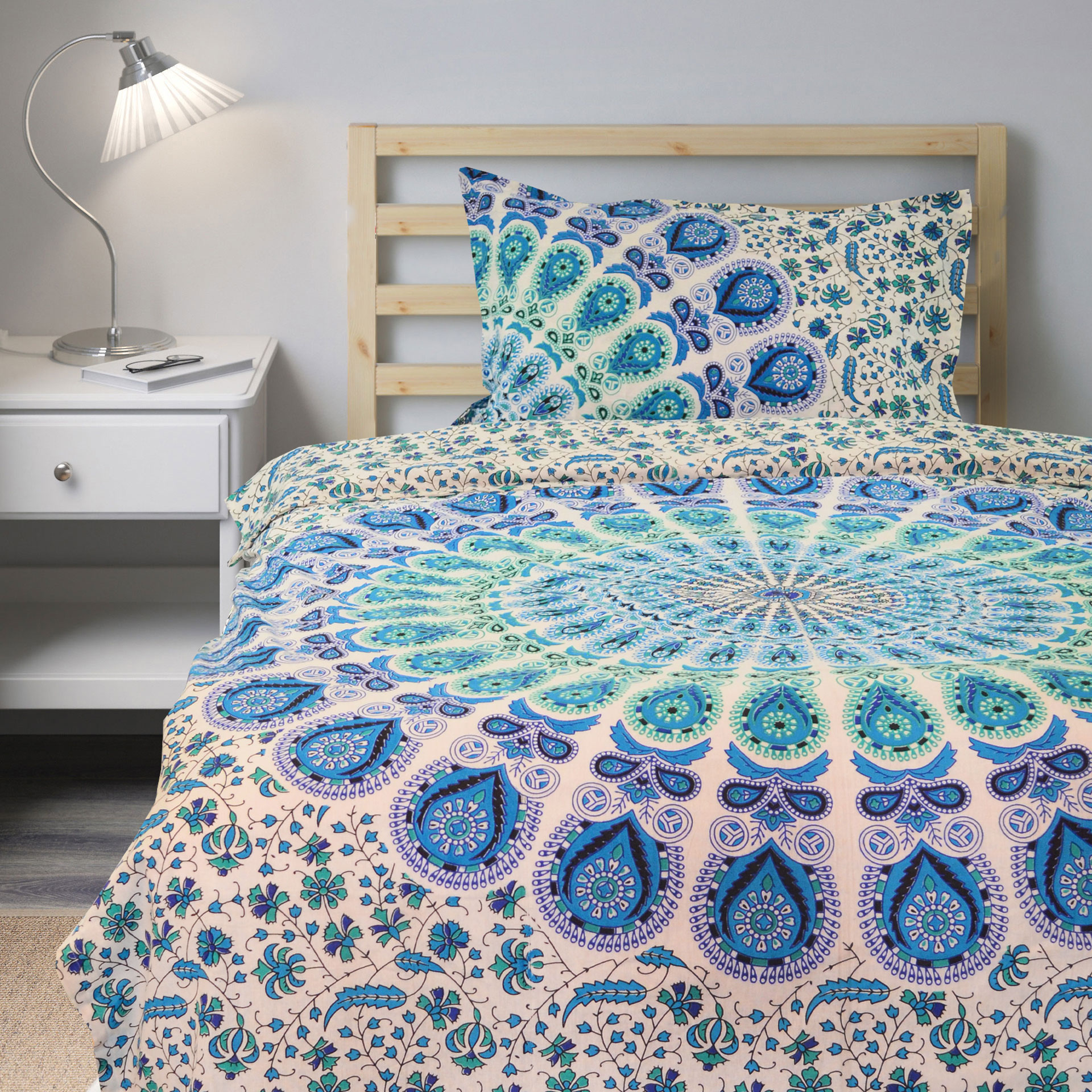 White Blue Bohemian Peafowl Mandala Twin Size Indian Duvet Cover Set with One Pillow Sham