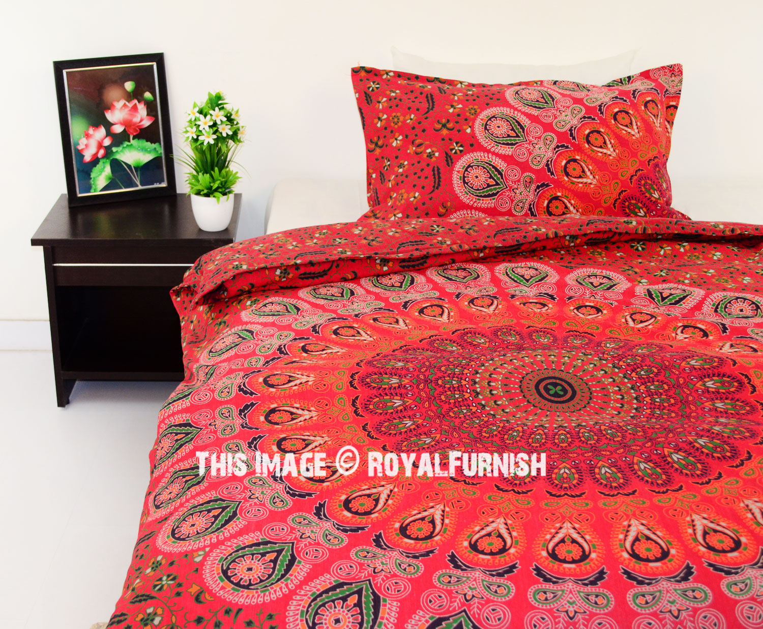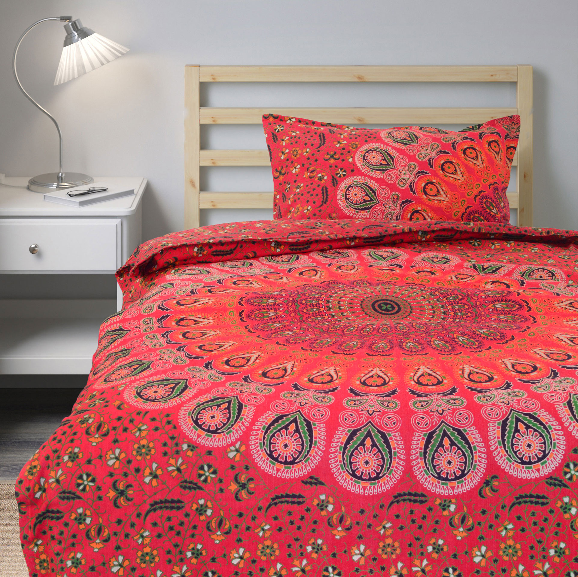 Red Multi Bohemian Peafowl Mandala Twin Size Indian Duvet Cover Set with One Pillow Sham