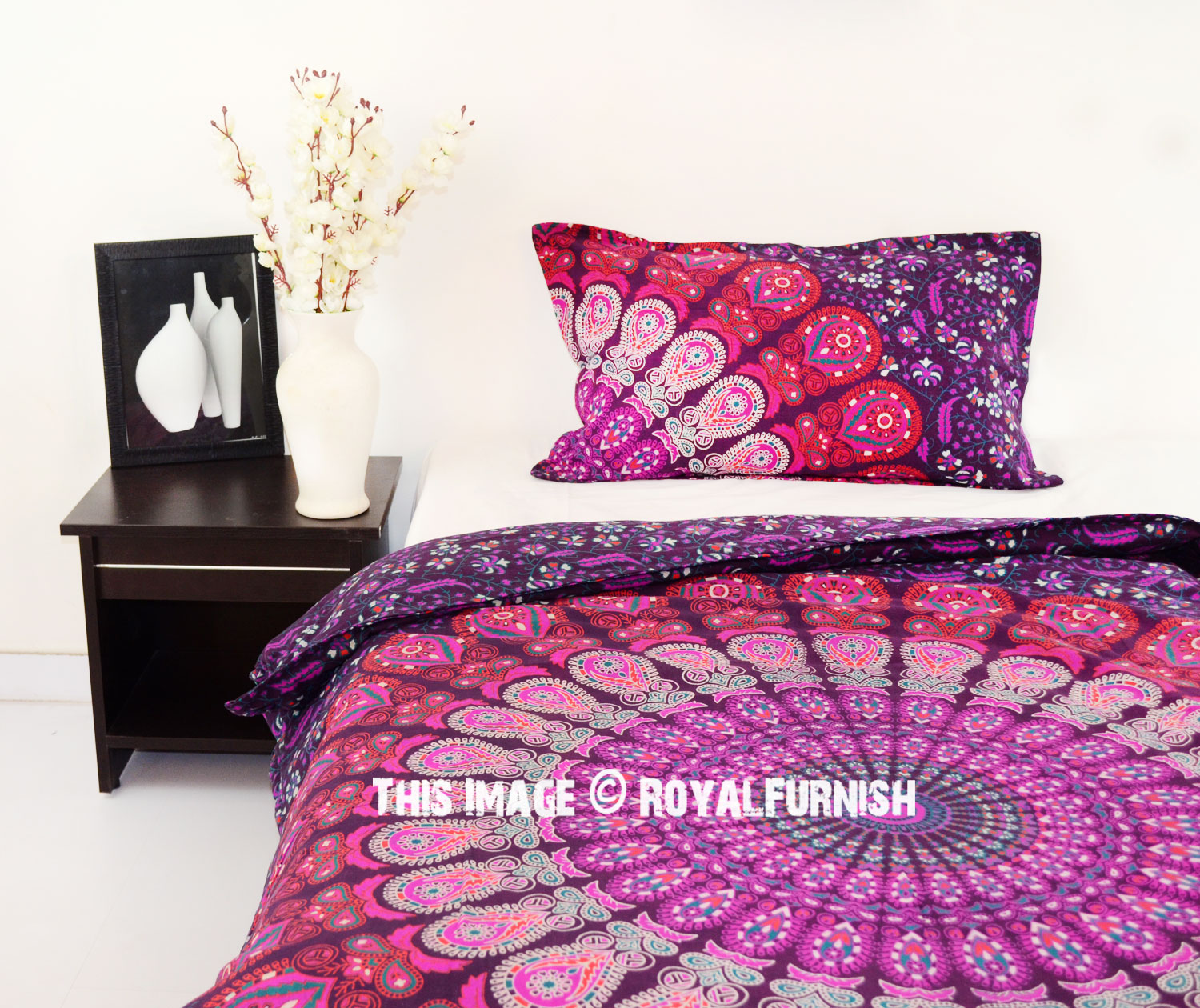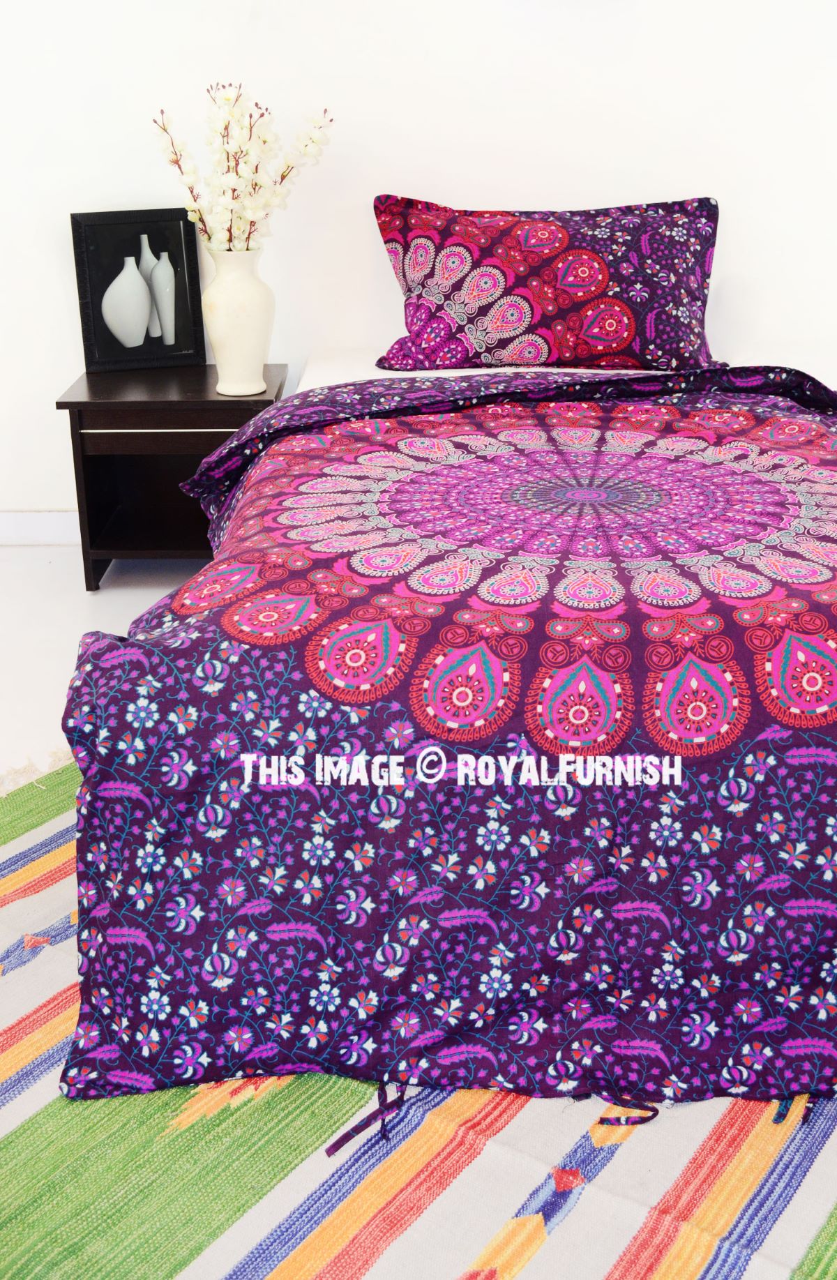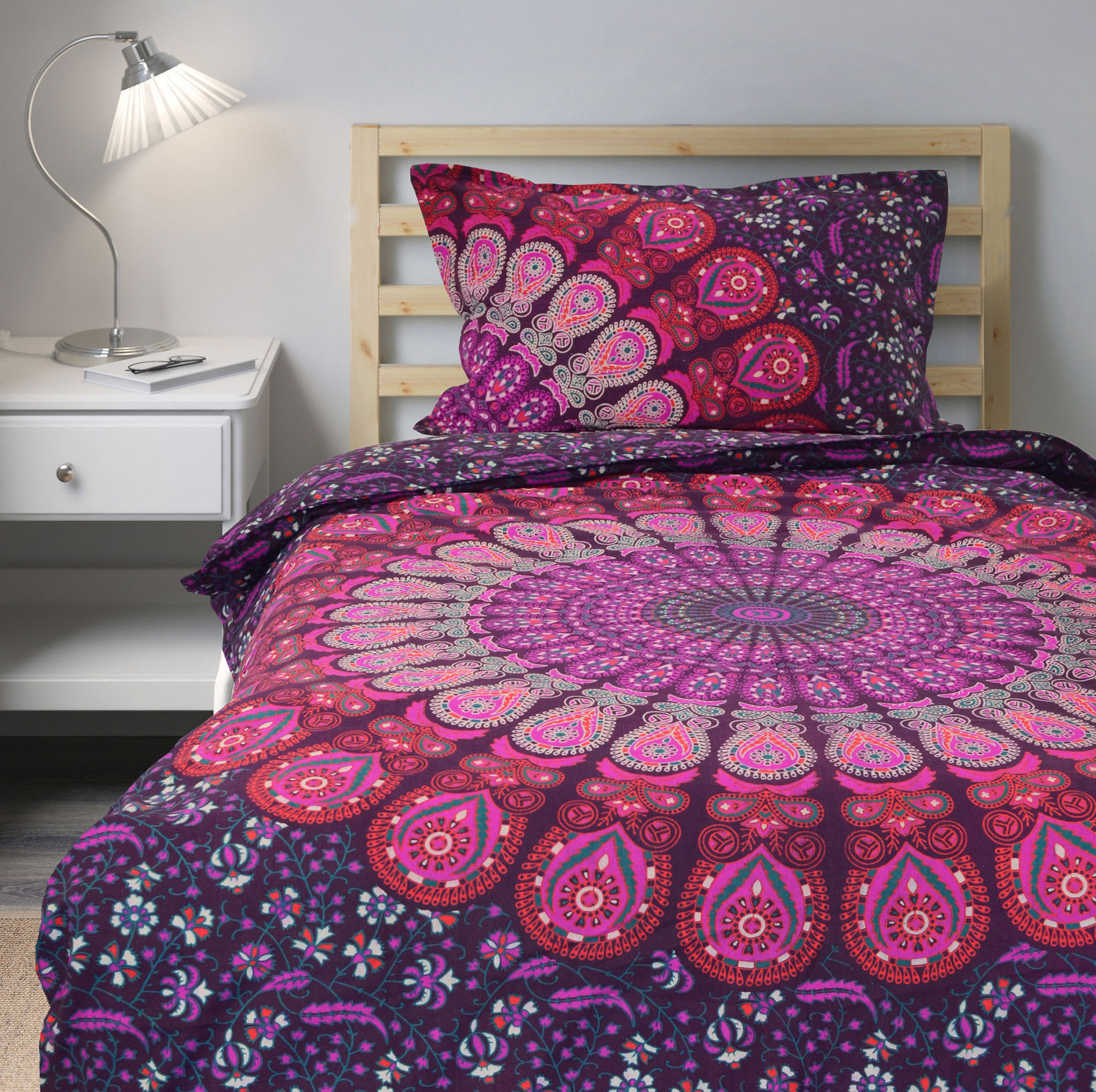 Pink Purple Bohemian Peafowl Mandala Twin Size Indian Duvet Cover Set with One Pillow Sham