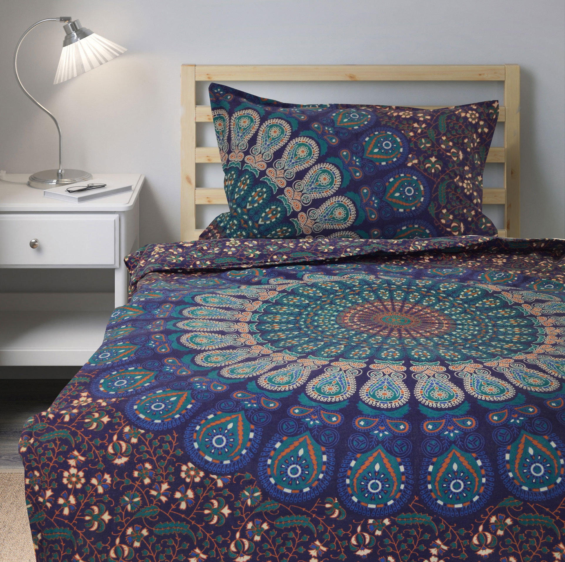 Blue Multi Bohemian Peafowl Mandala Twin Size Indian Duvet Cover Set with One Pillow Sham