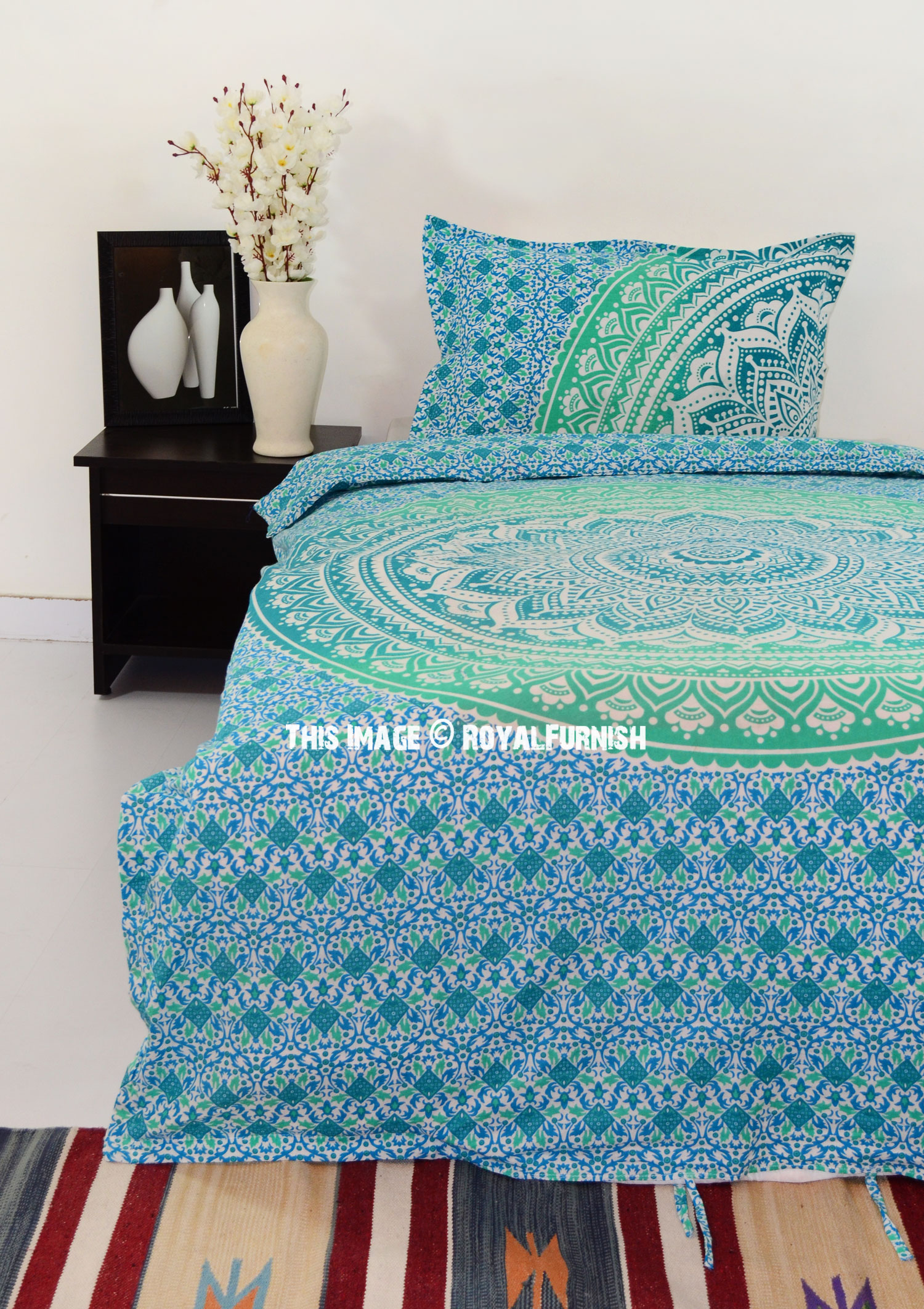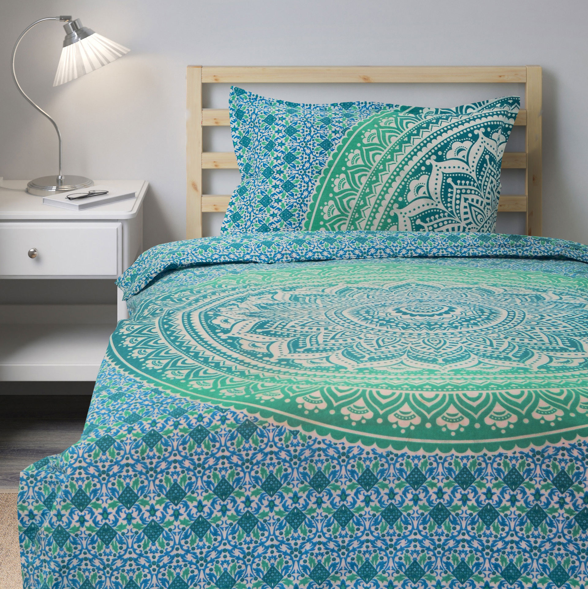 Sea Green Blue Classic Ombre Mandala Bohemian Twin Size Duvet Cover Set with One Pillow Sham