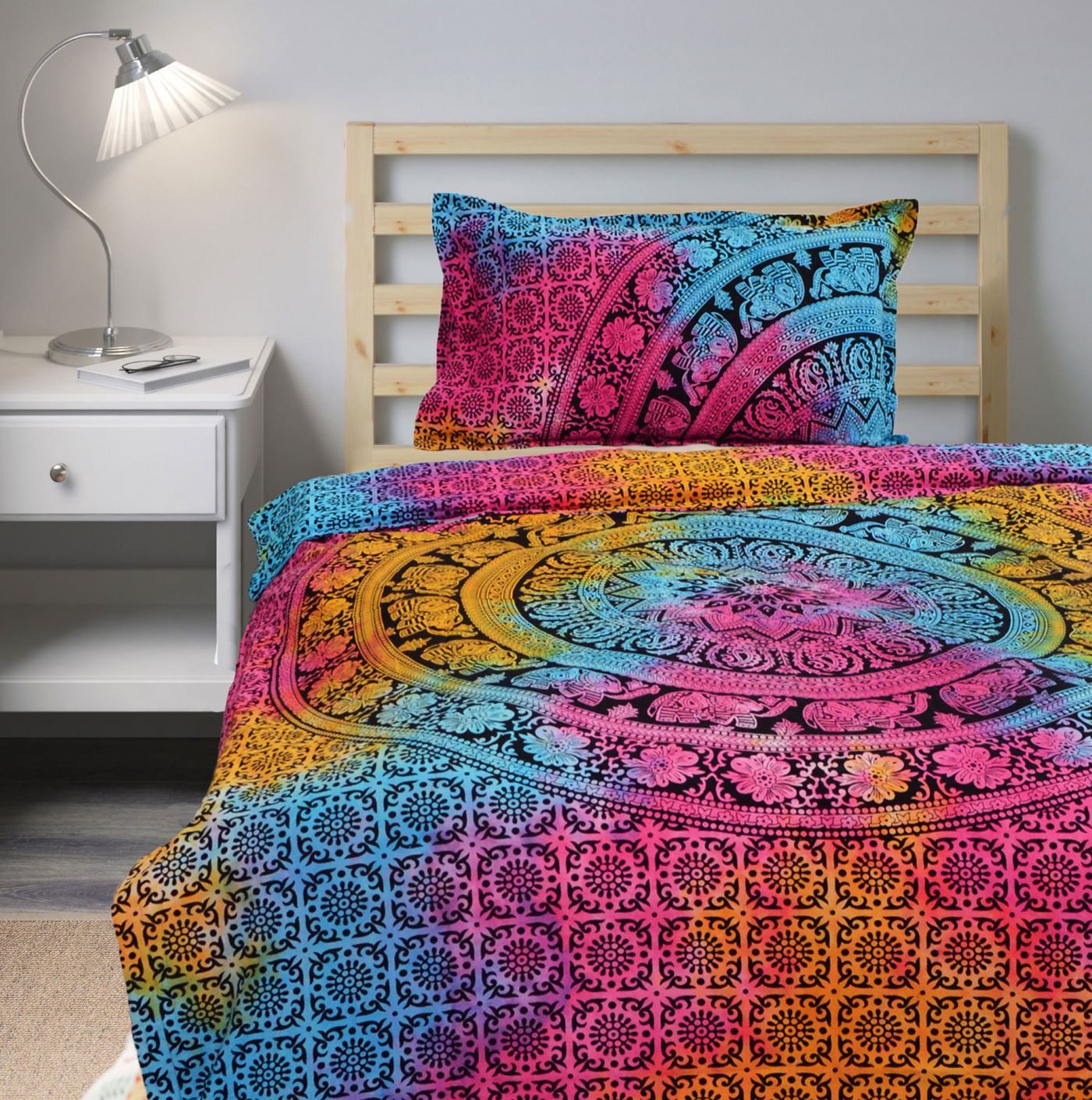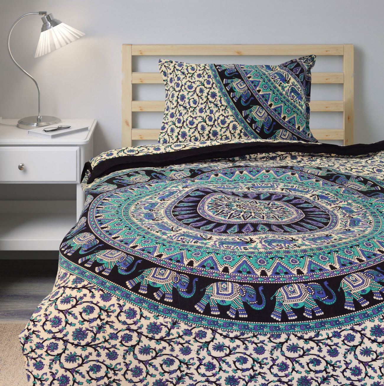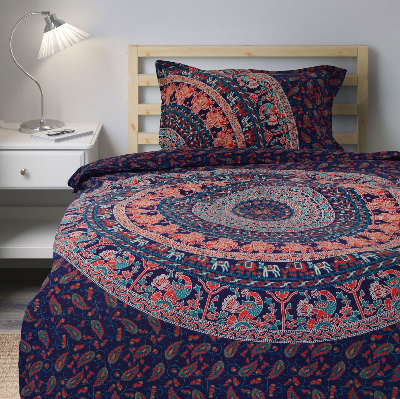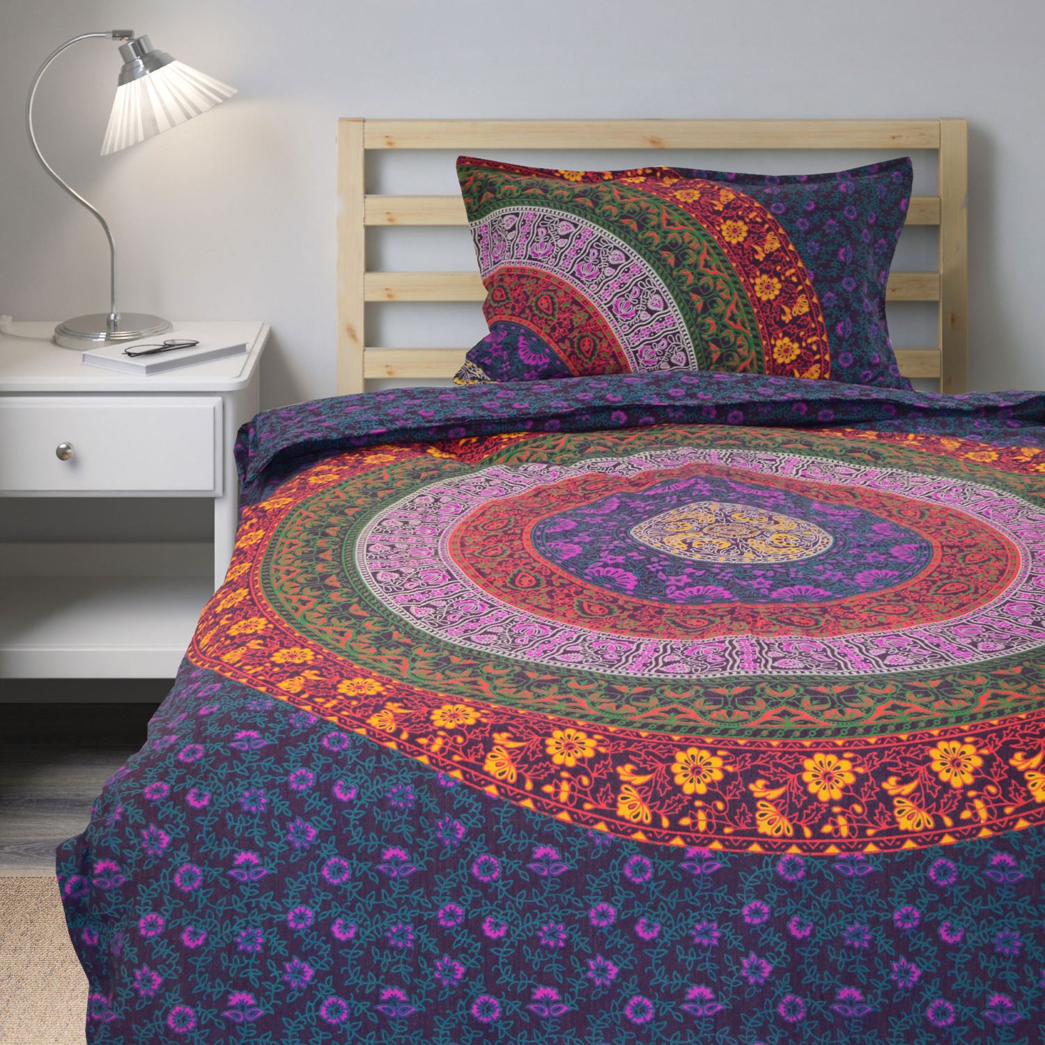 Add flare to your bedroom decor with this cotton duvet cover set in a mandala print. Constructed of 100 percent cotton, this set is machine washable for easy care and offers soft, breathable comfort. Duvet cover has tie closure and shams feature envelope closures. You can never go wrong with a solid bedding update to your room. The multi-toned color scheme easily matches with a variety of sheets.