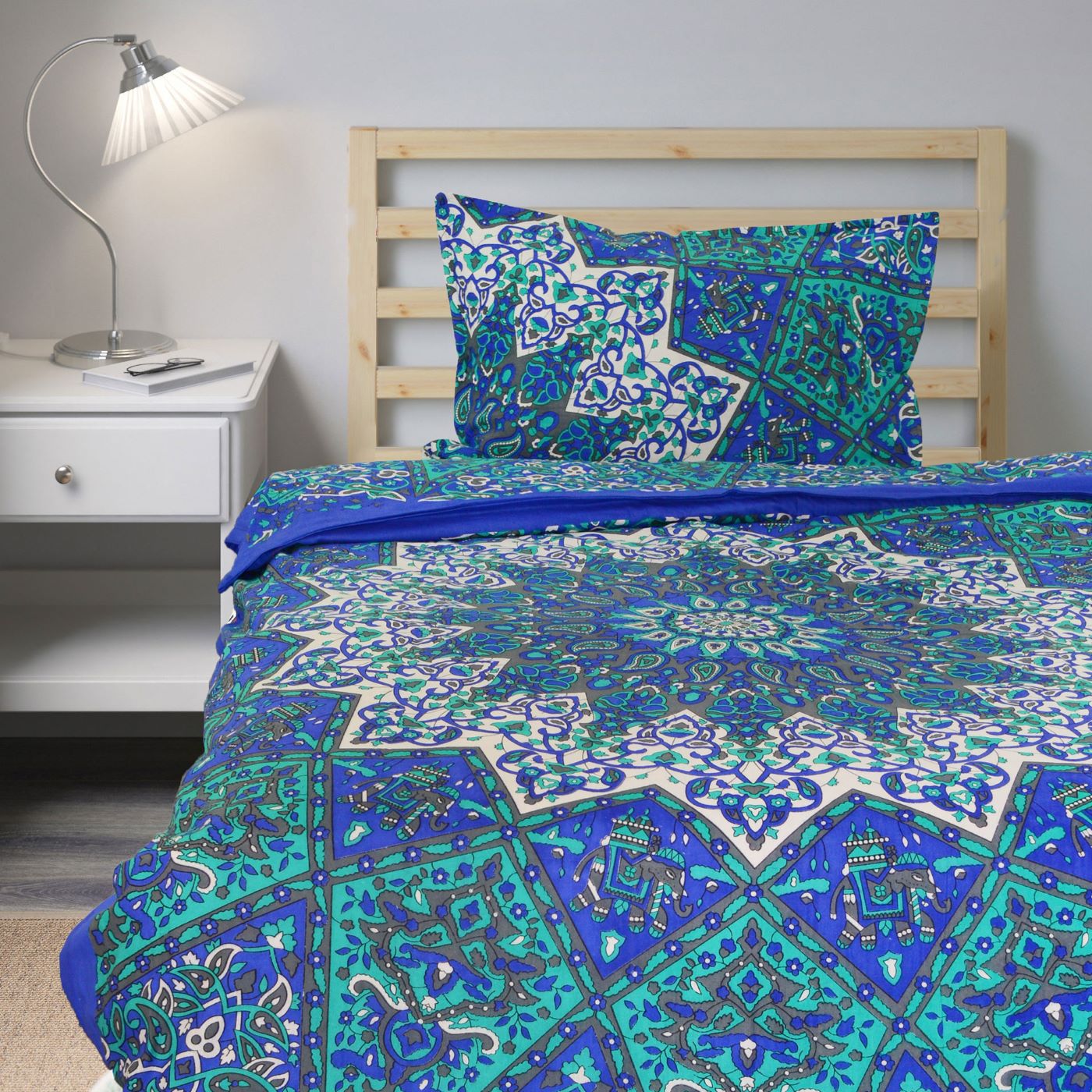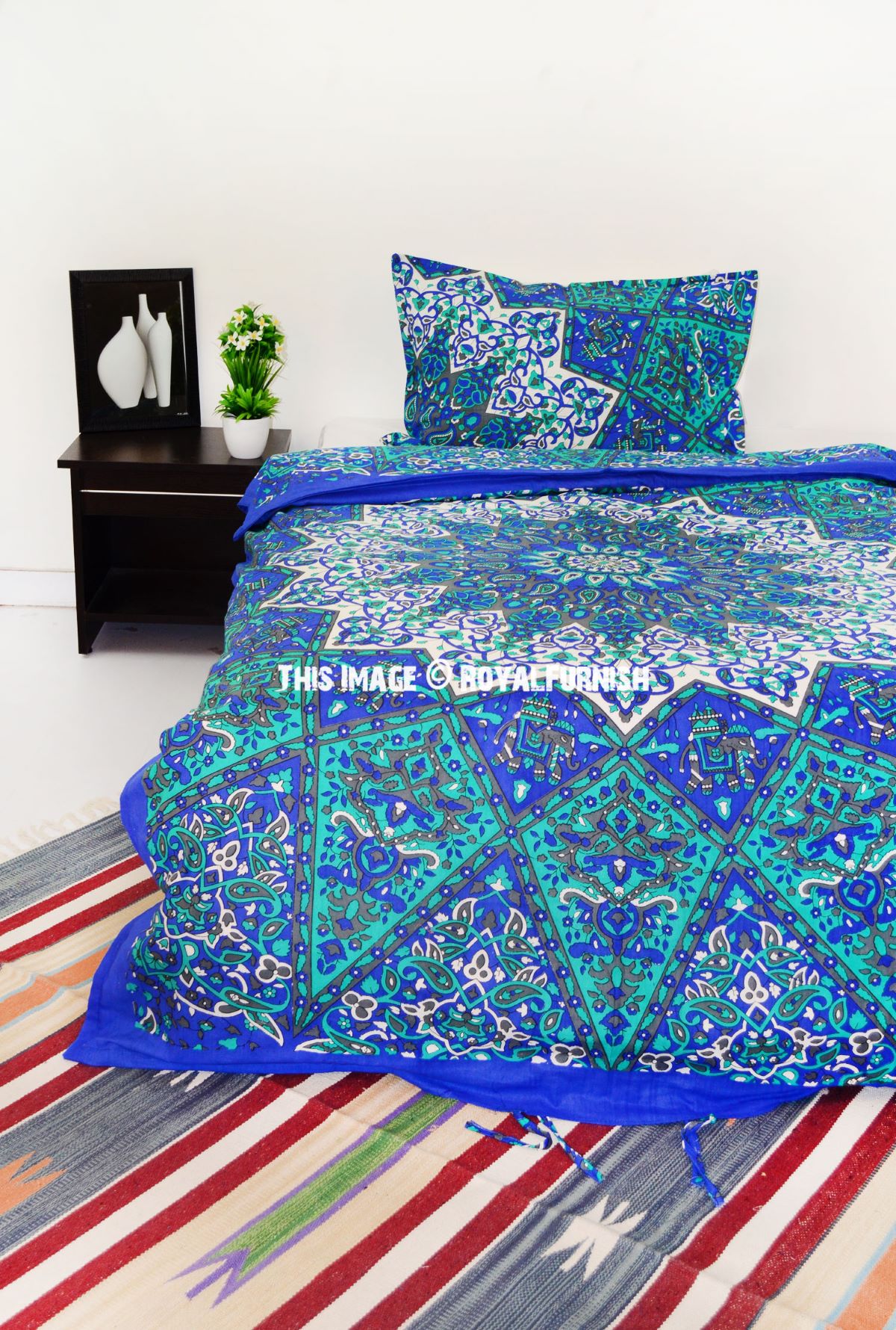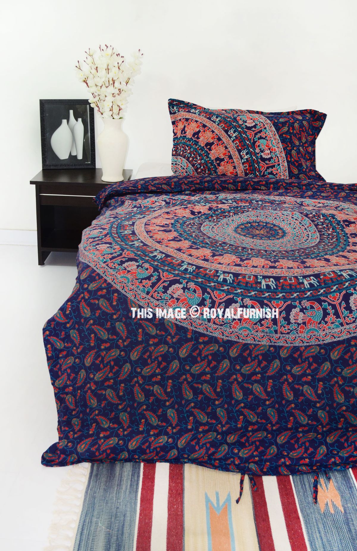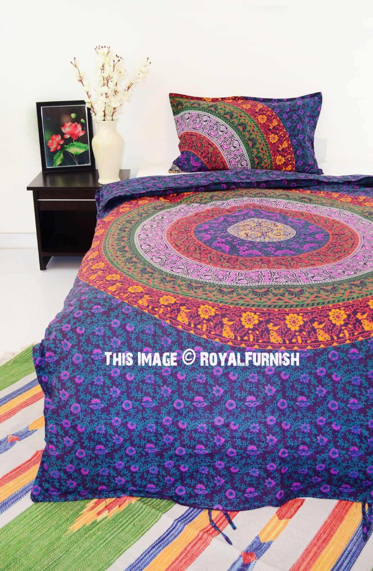 Add flare to your bedroom decor with this cotton duvet cover set in a mandala print. Constructed of 100 percent cotton, this set is machine washable for easy care and offers soft, breathable comfort. Duvet cover has tie closure and shams feature envelope closures. You can never go wrong with a solid bedding update to your room. The multi-toned color scheme easily matches with a variety of sheets.