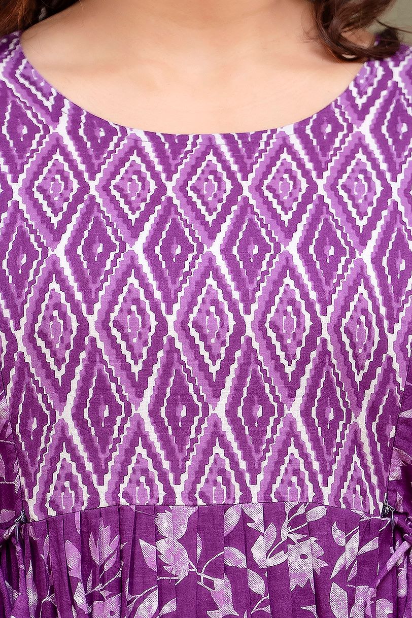 Purple Baby Feeding Gown Floral Printed Maternity Kurti Round Neck Anarkali Kurta with Hidden Feeding Zip