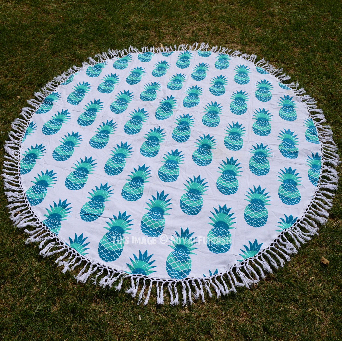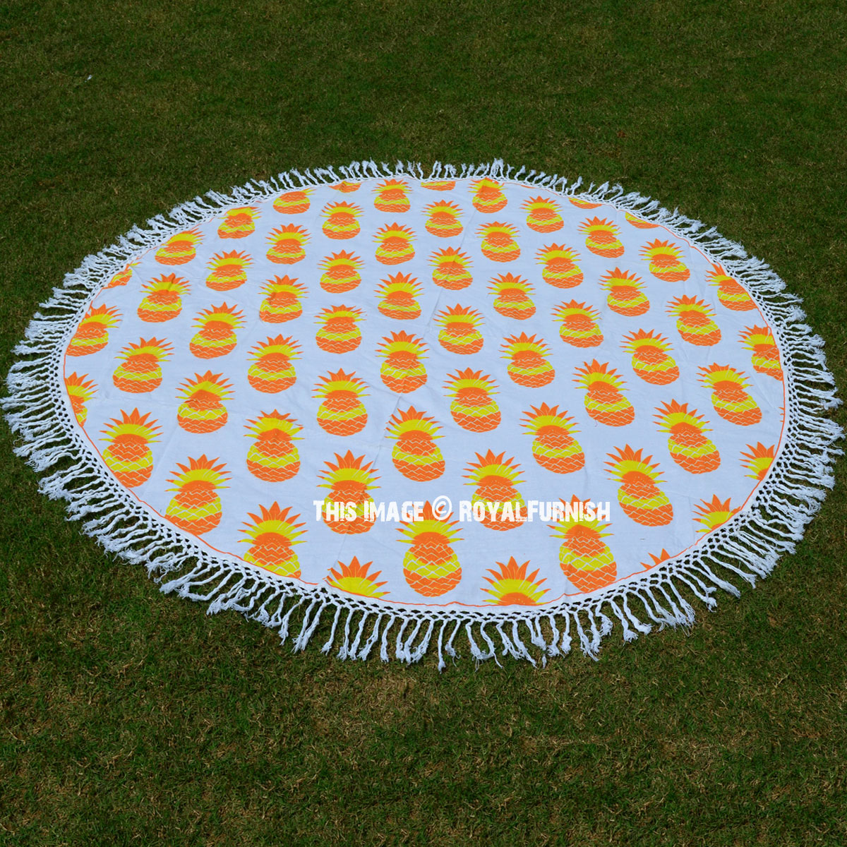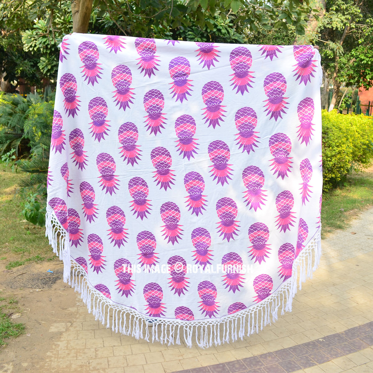Are you planning to spend entire day at beach? We bring you gorgeous, big size, soft and light weighted round beach throw which features pineapple fruit print that is also known as “Mandala roundies”. It is 100% cotton round sheet and light weighted beach throw. The colors are very bright and vibrant as shown into the picture. It can also be used as a round tablecloth.