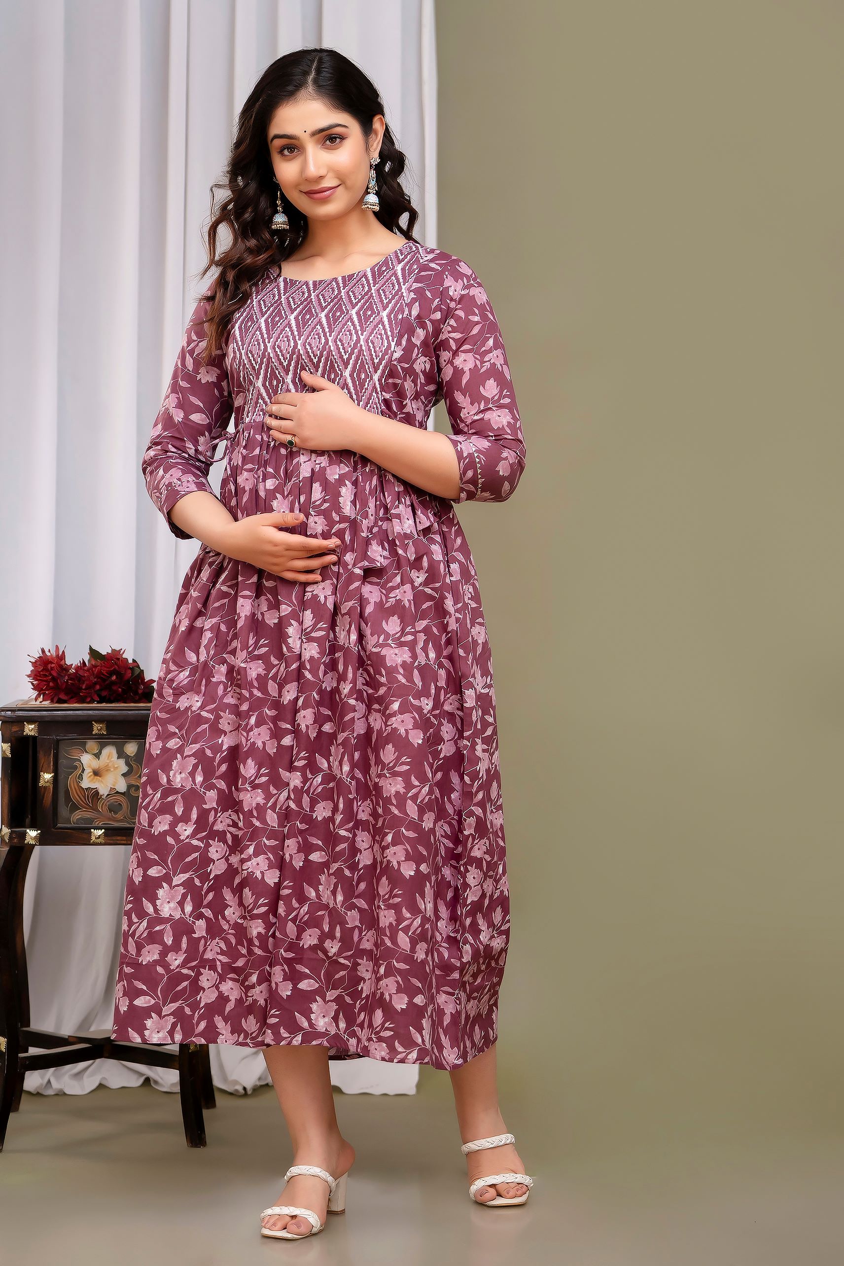 Wine Cotton Baby Feeding Gown Floral Printed Maternity Kurti Anarkali Kurta with Hidden Feeding Zip