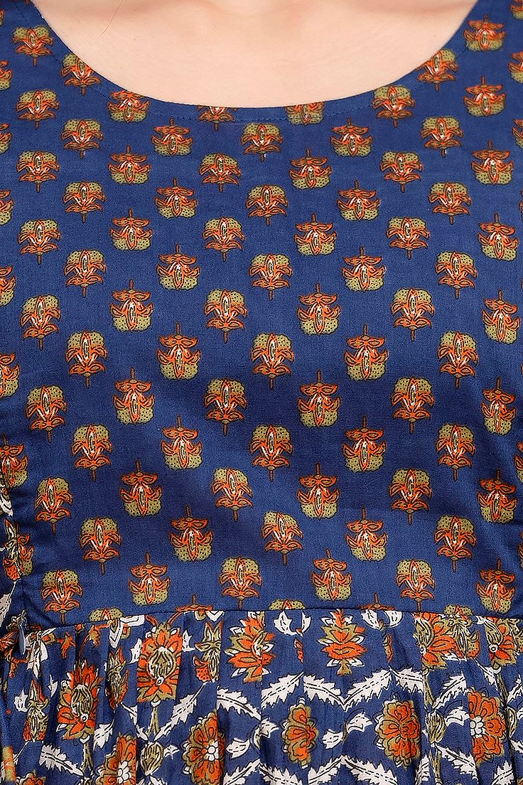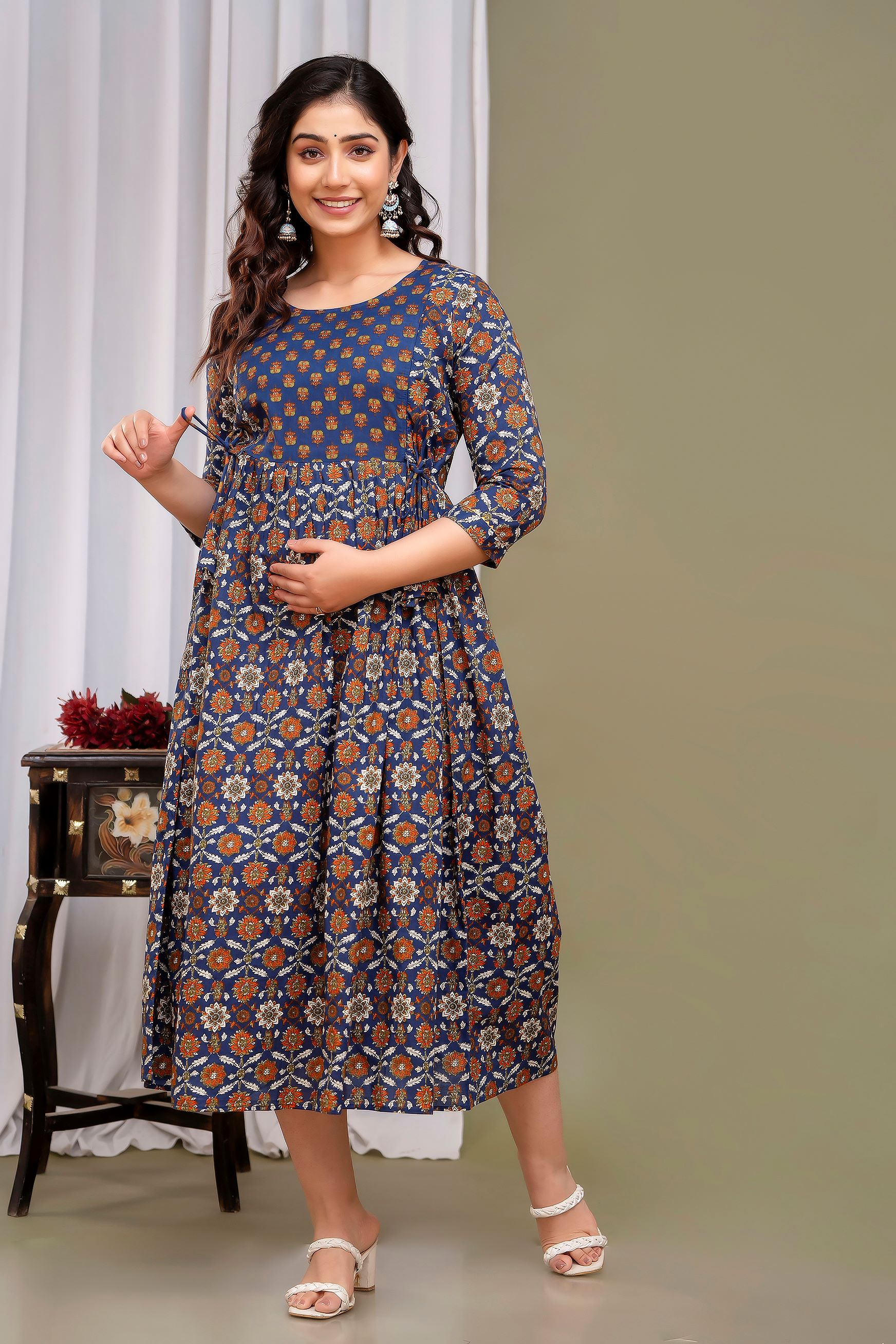 Blue & Red Floral Print Soft Cotton Maternity Kurti Gown for Baby Feeding Anarkali Kurti with Hidden Feeding Zip