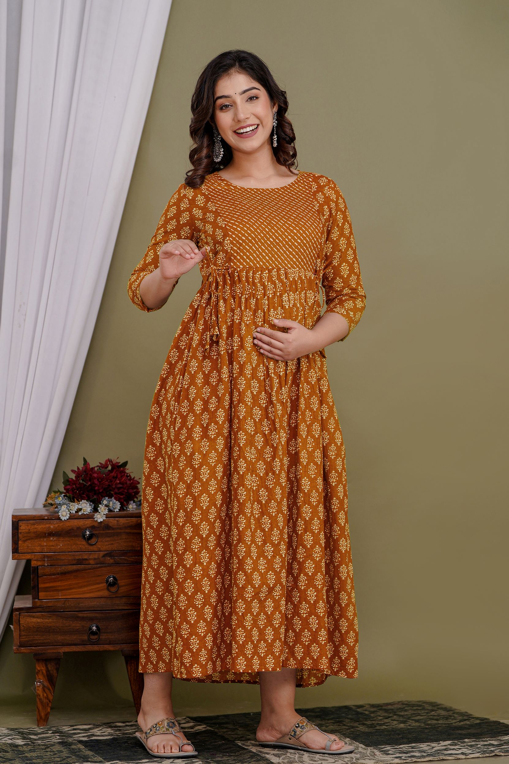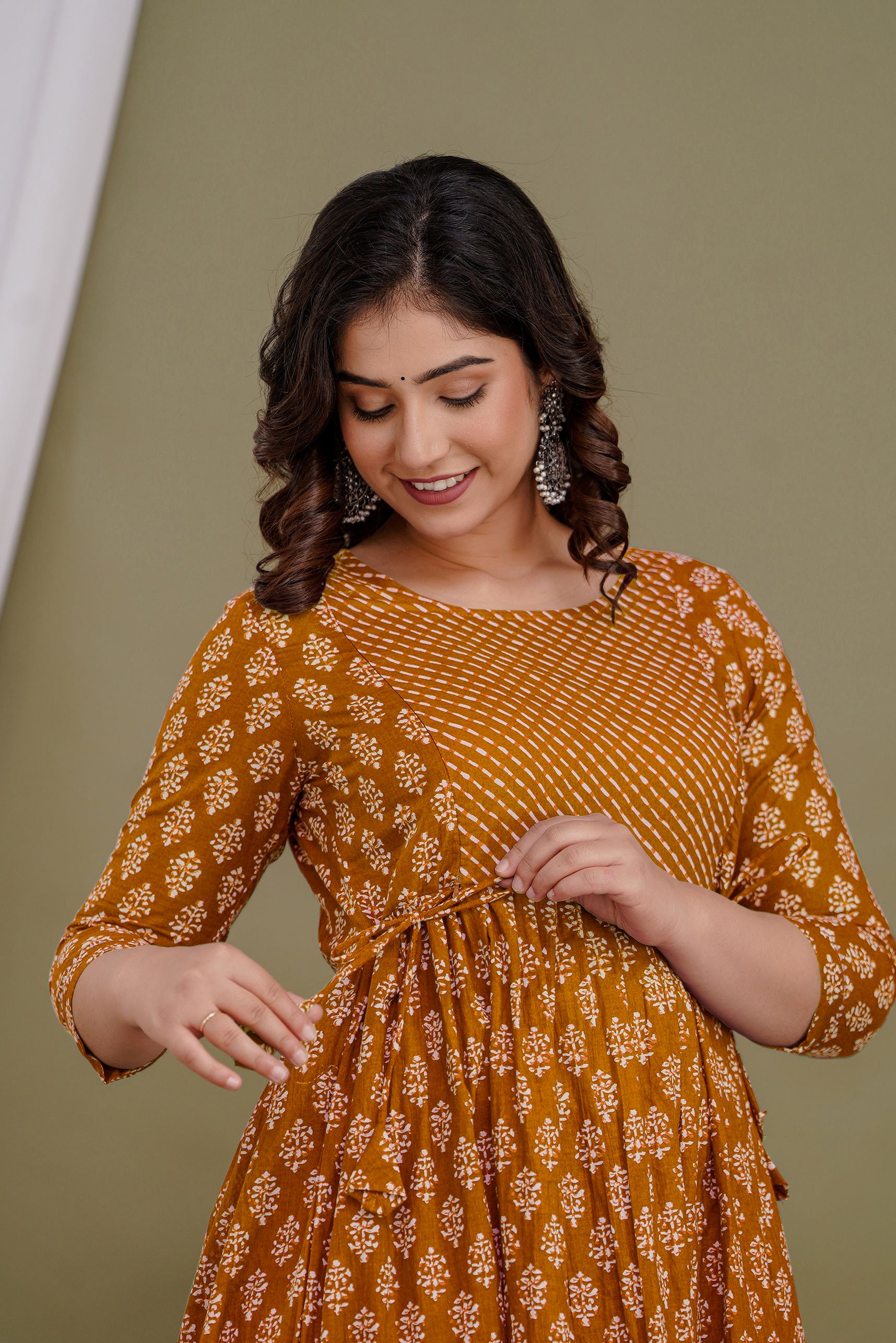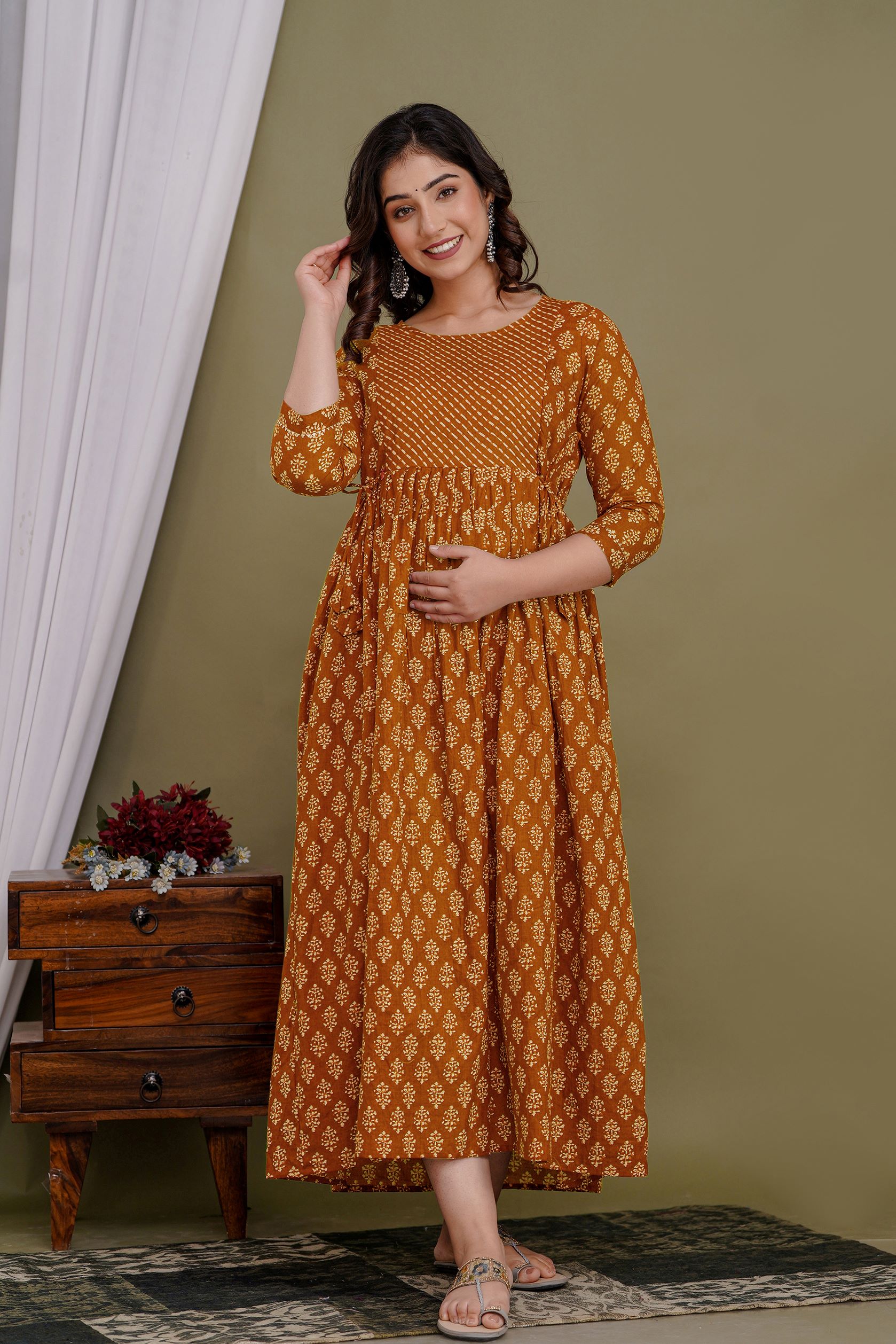 Mustard Printed Soft Cotton Maternity Kurti Gown for Baby Feeding Anarkali Kurti with Hidden Feeding Zip