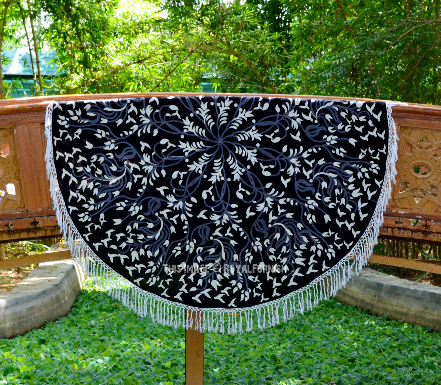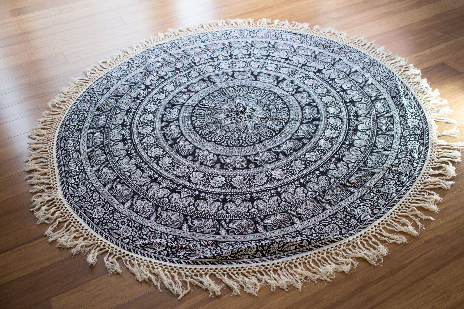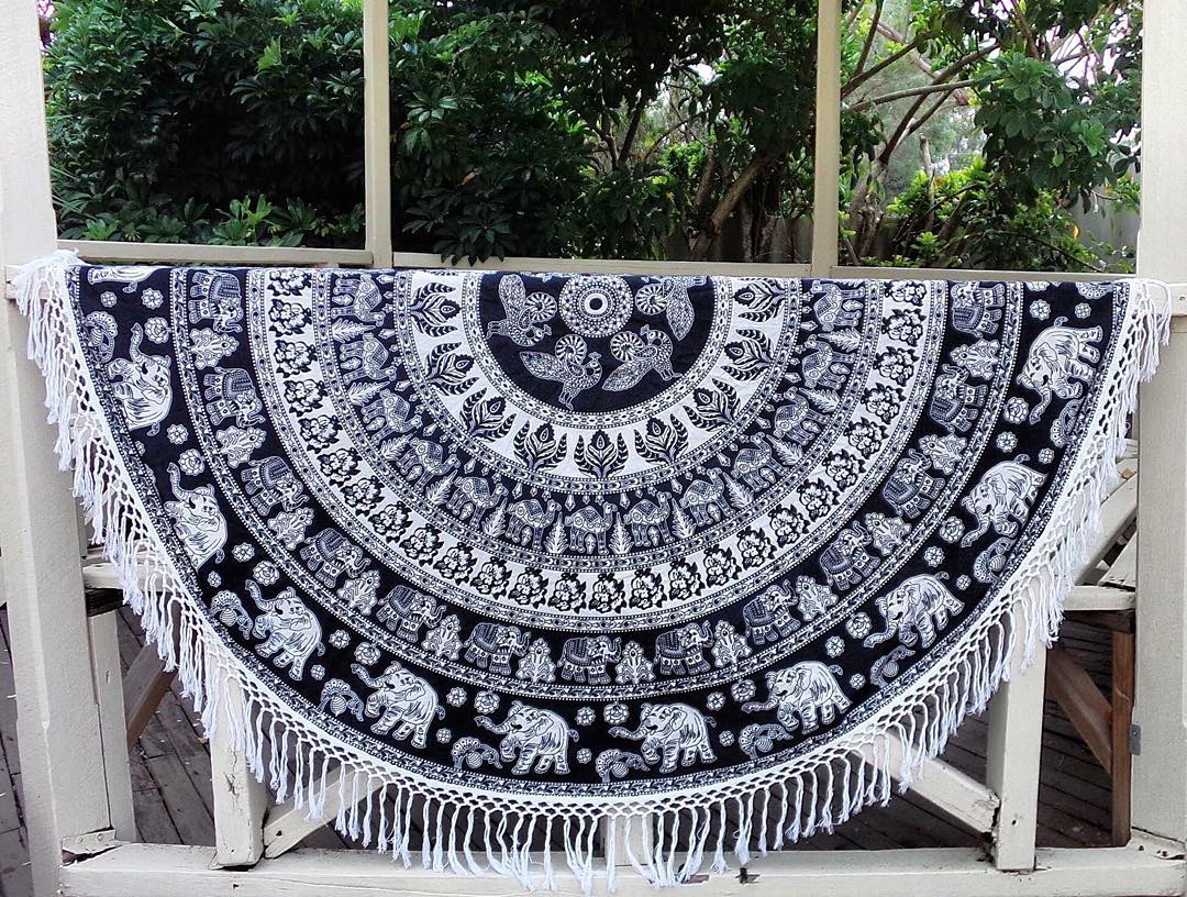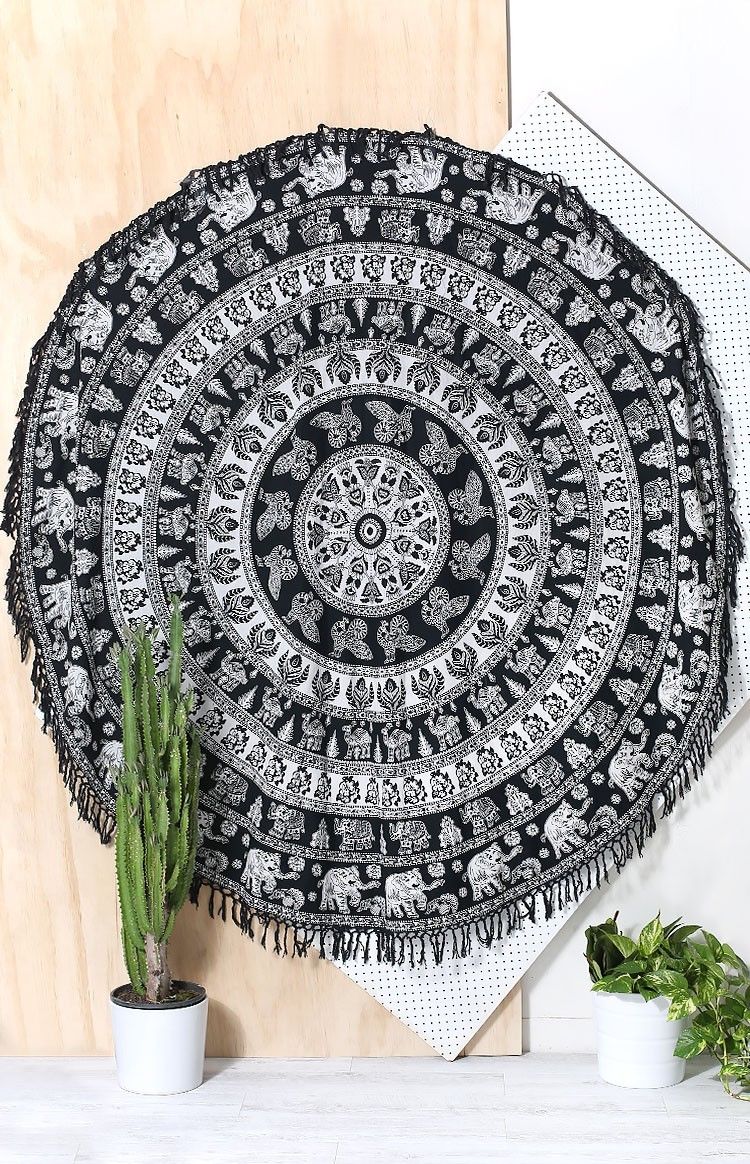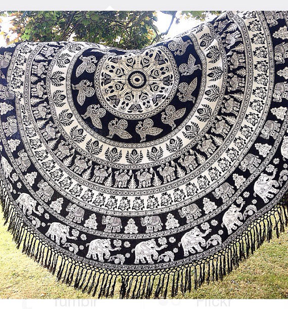 Black & White Bohemian Elephant Mandala Roundie Beach Throw, Fringed Round Table Cloth