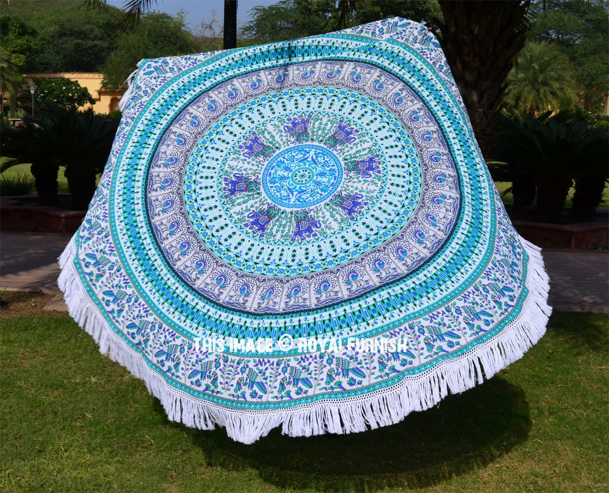 Design 7 Bohemian Elephant Mandala Roundie Beach Throw, Hippie Fringed Round Table Cloth