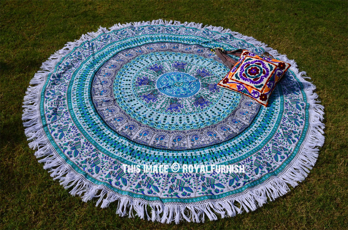 Design 4 Bohemian Elephant Mandala Roundie Beach Throw, Hippie Fringed Round Table Cloth