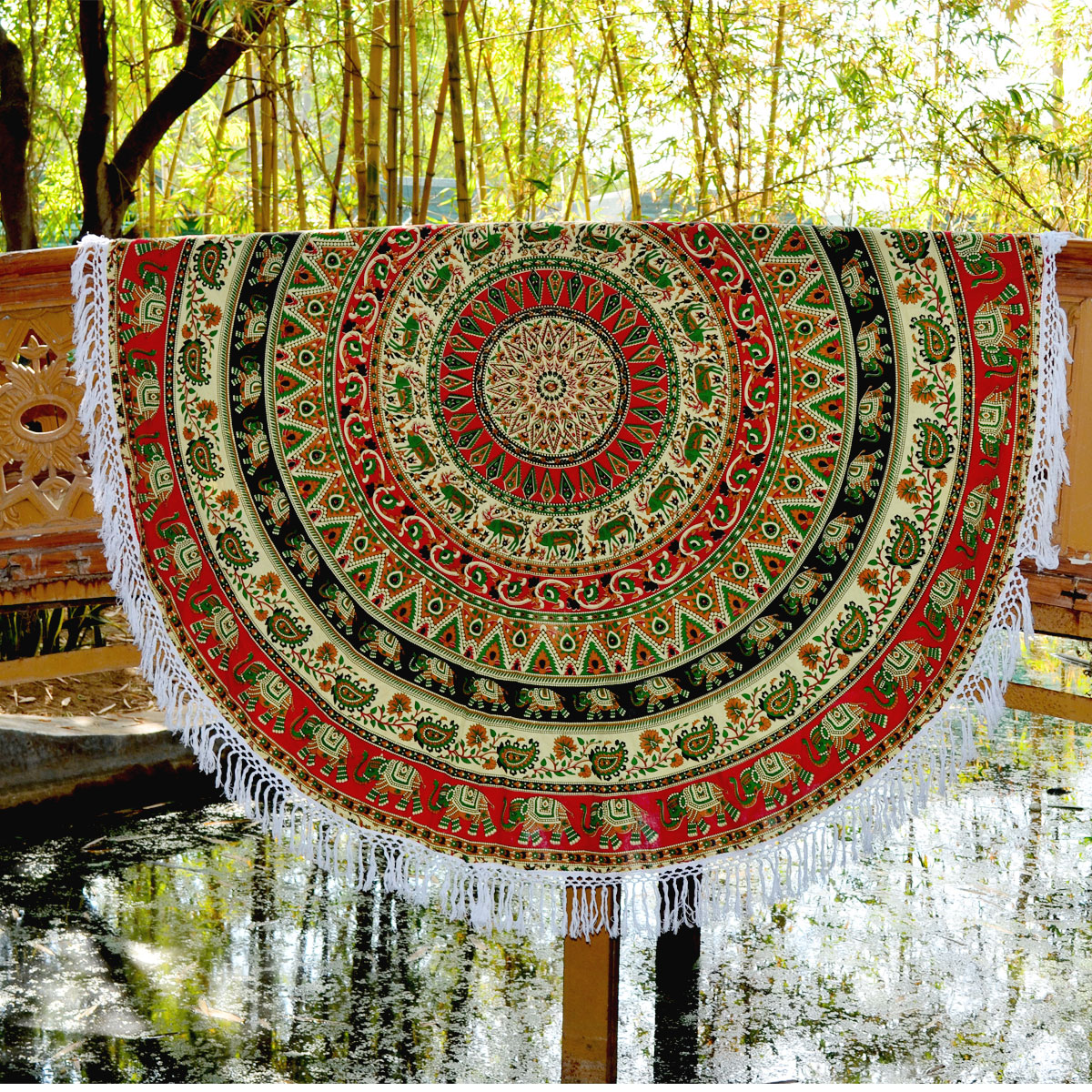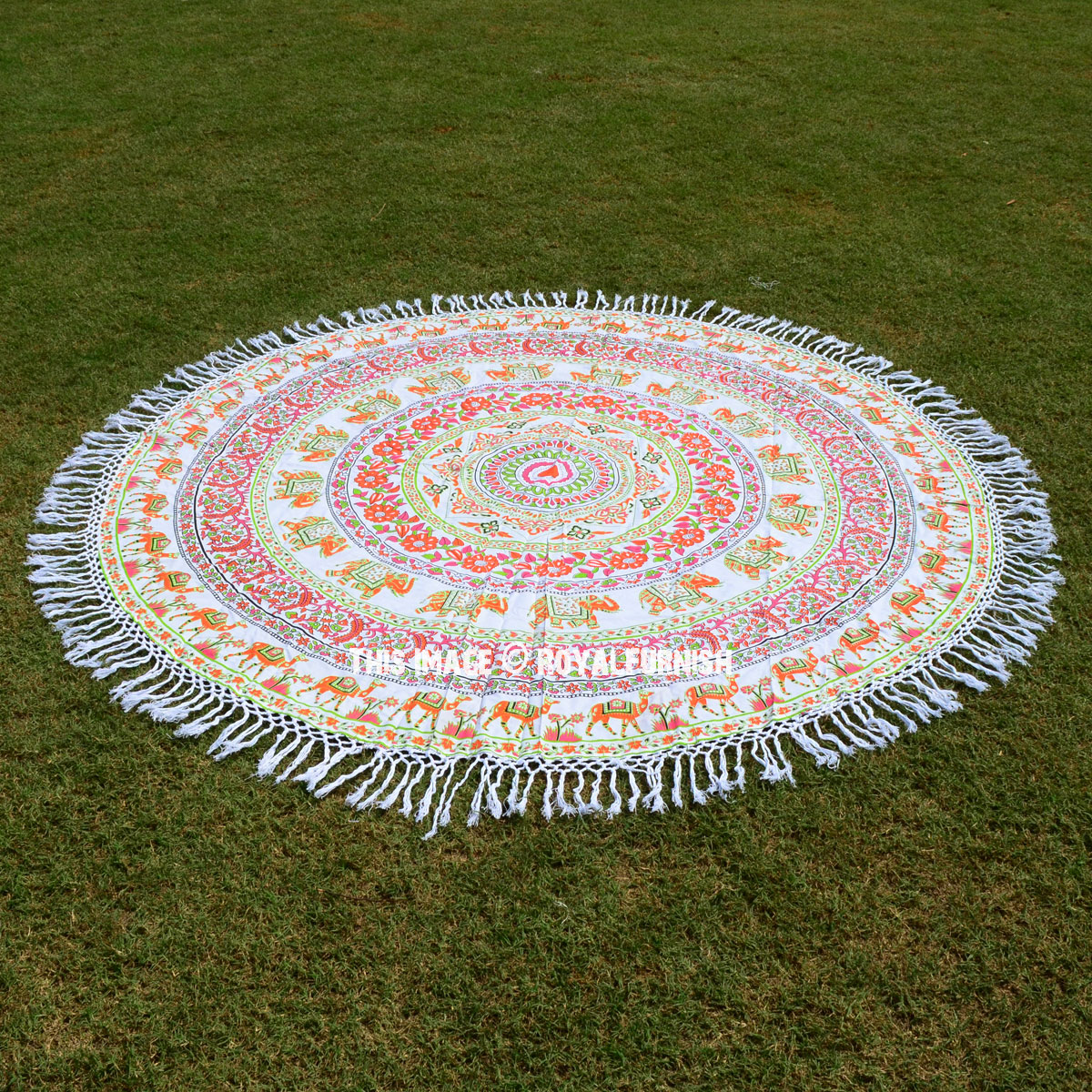 Are you planning to spend entire day at beach? We bring you gorgeous, big size, soft and light weighted round beach throw which features mandala circle that is also known as “Mandala roundies”. It is 100% cotton round sheet and light weighted beach throw. The colors are very bright and vibrant as shown into the picture. It can also be used as a round tablecloth.