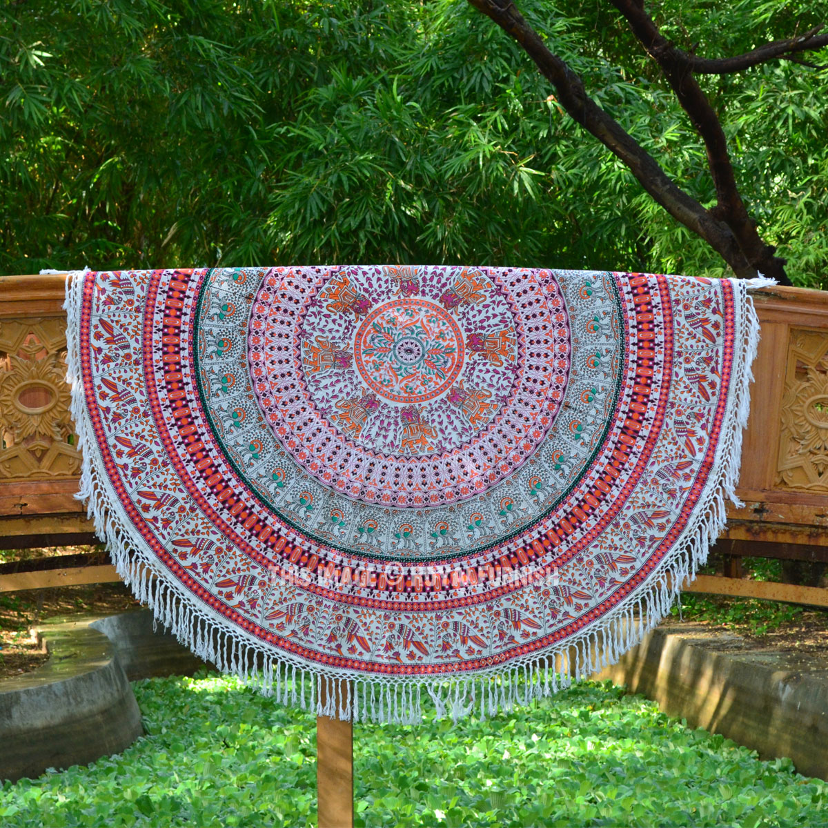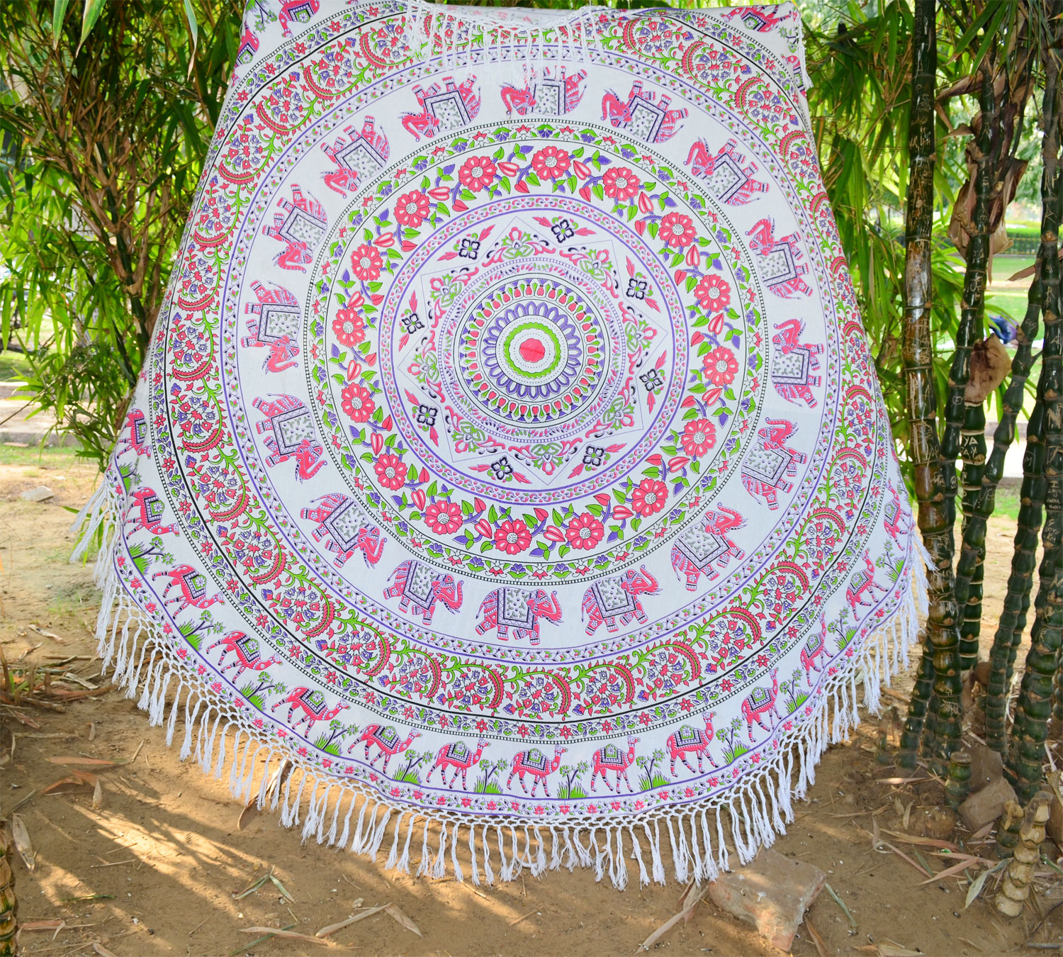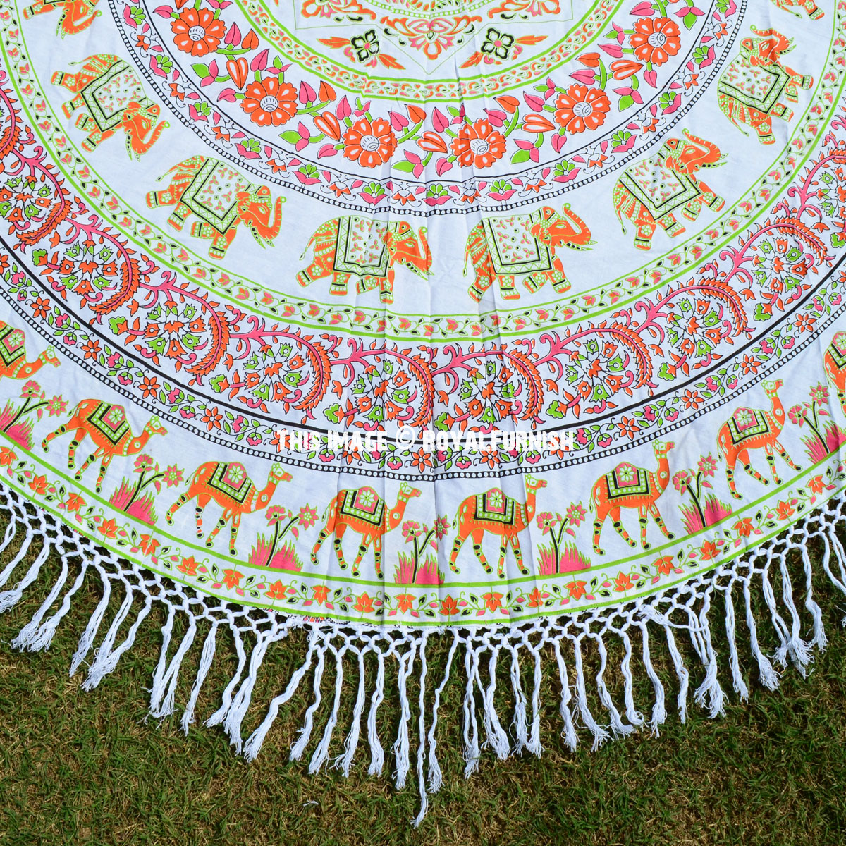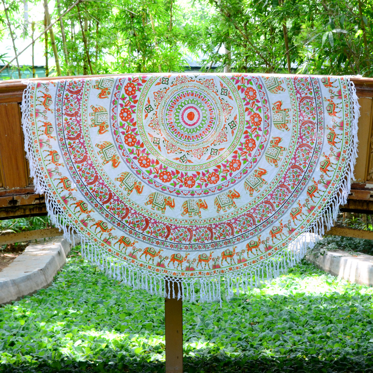 Bohemian Elephant Mandala Roundie Beach Throw, Hippie Fringed Round Table Cloth