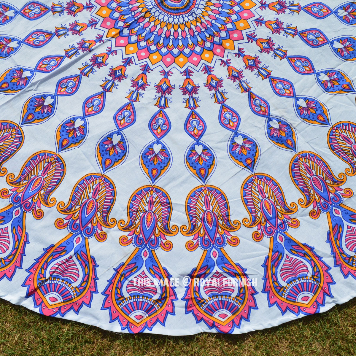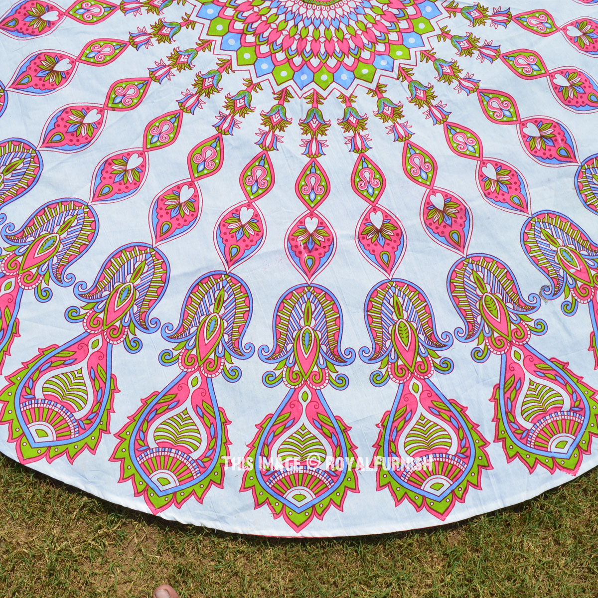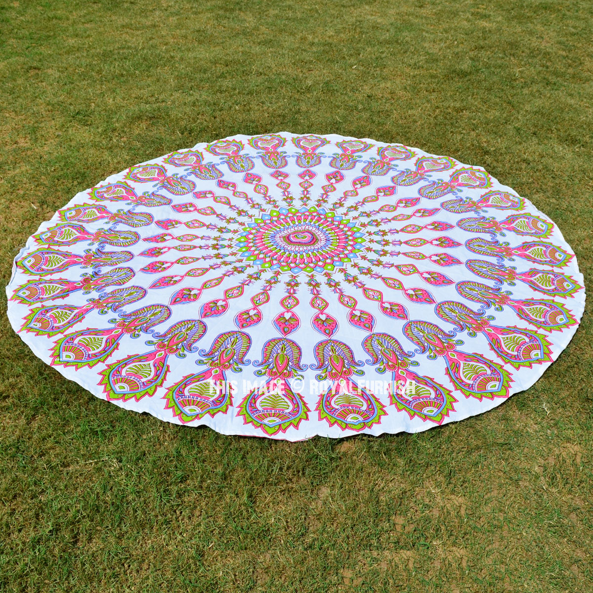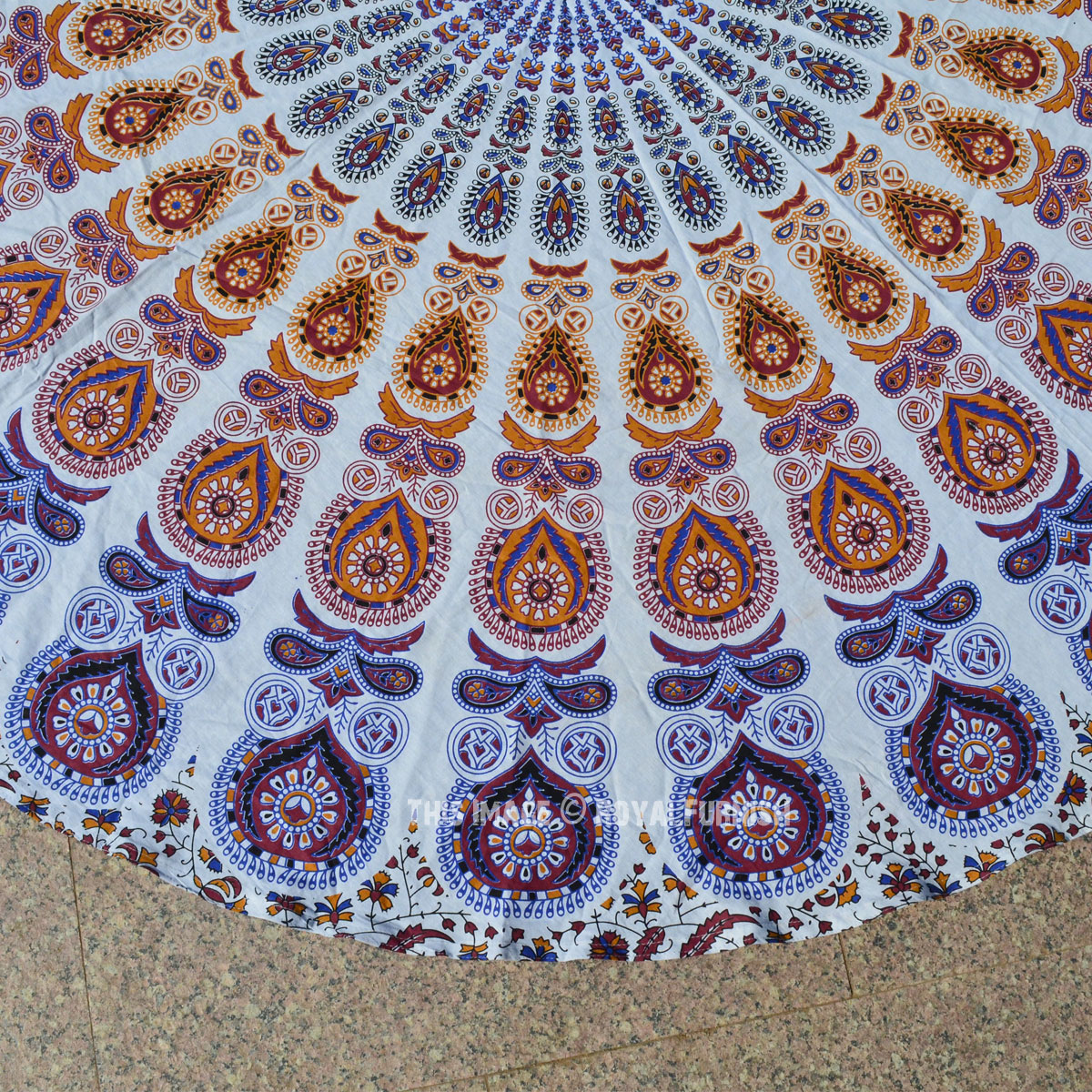 Design 4 White Multi Colorful Hippie Mandala Roundie Beach Throw, Boho Round Table Cloth