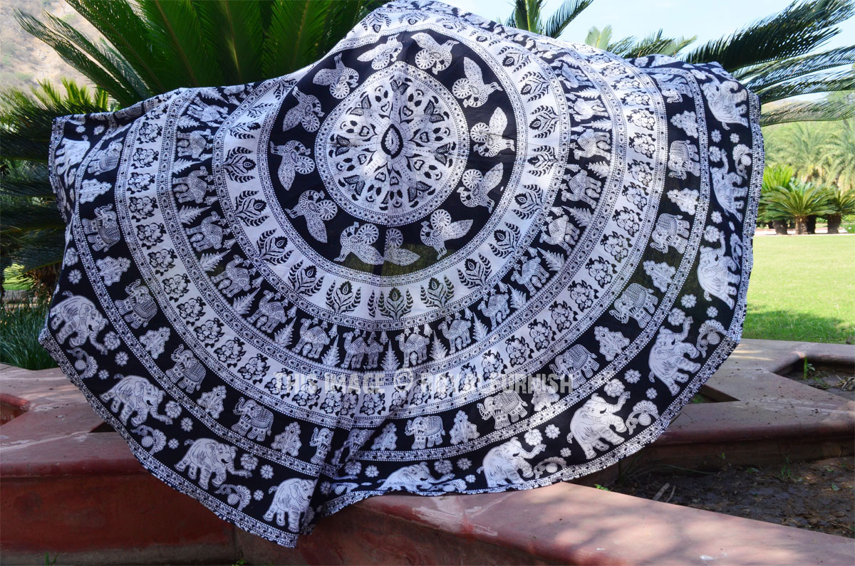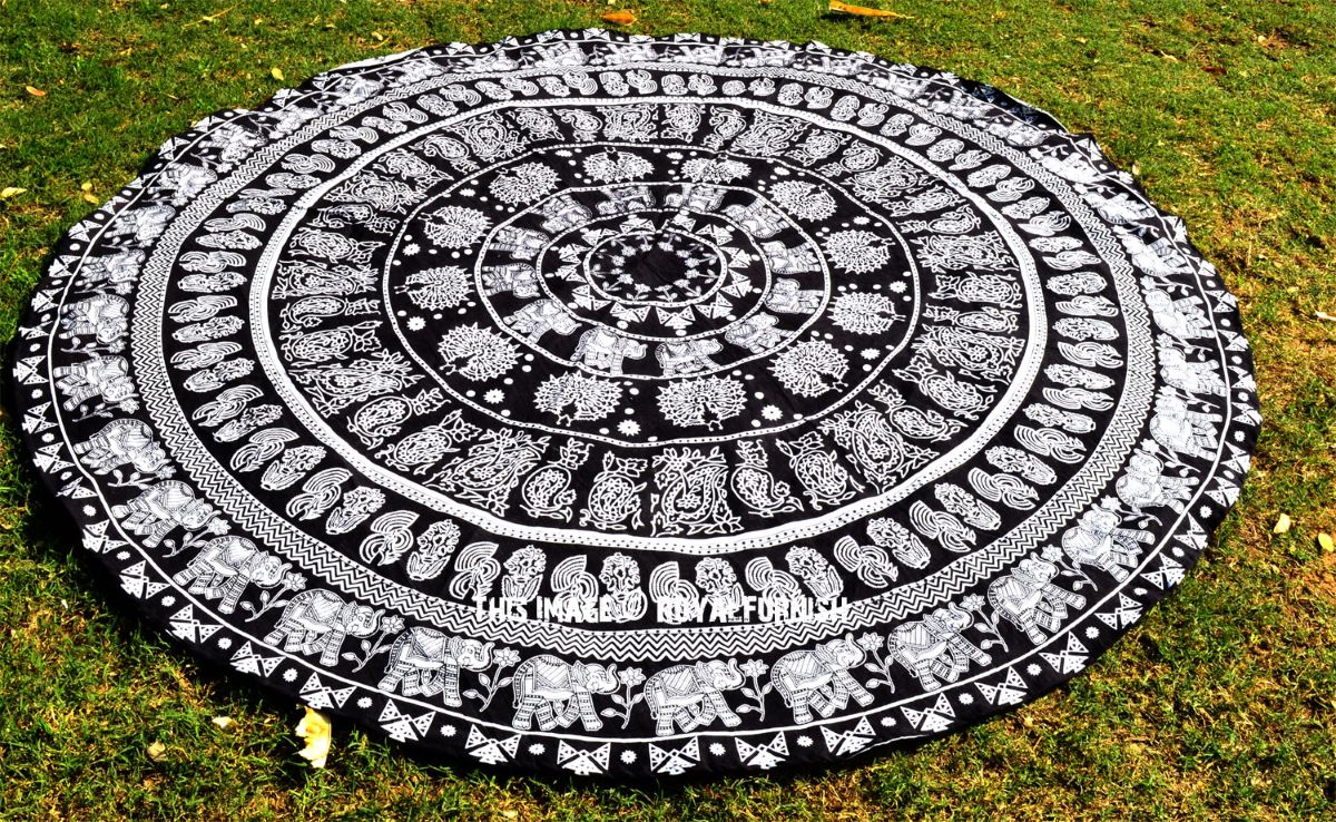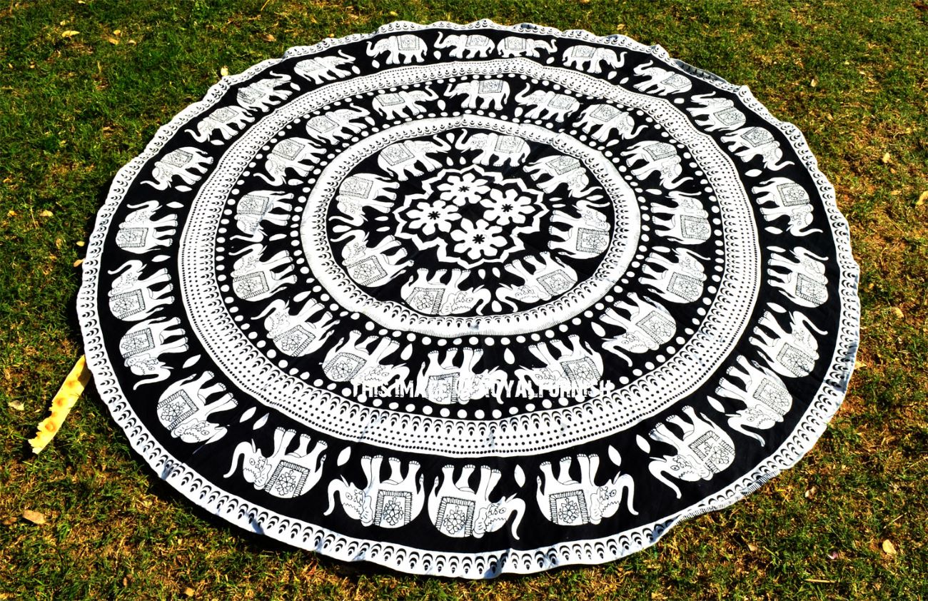 Black & White Bohemian Elephant Mandala Roundie Beach Throw, Round Table Cloth