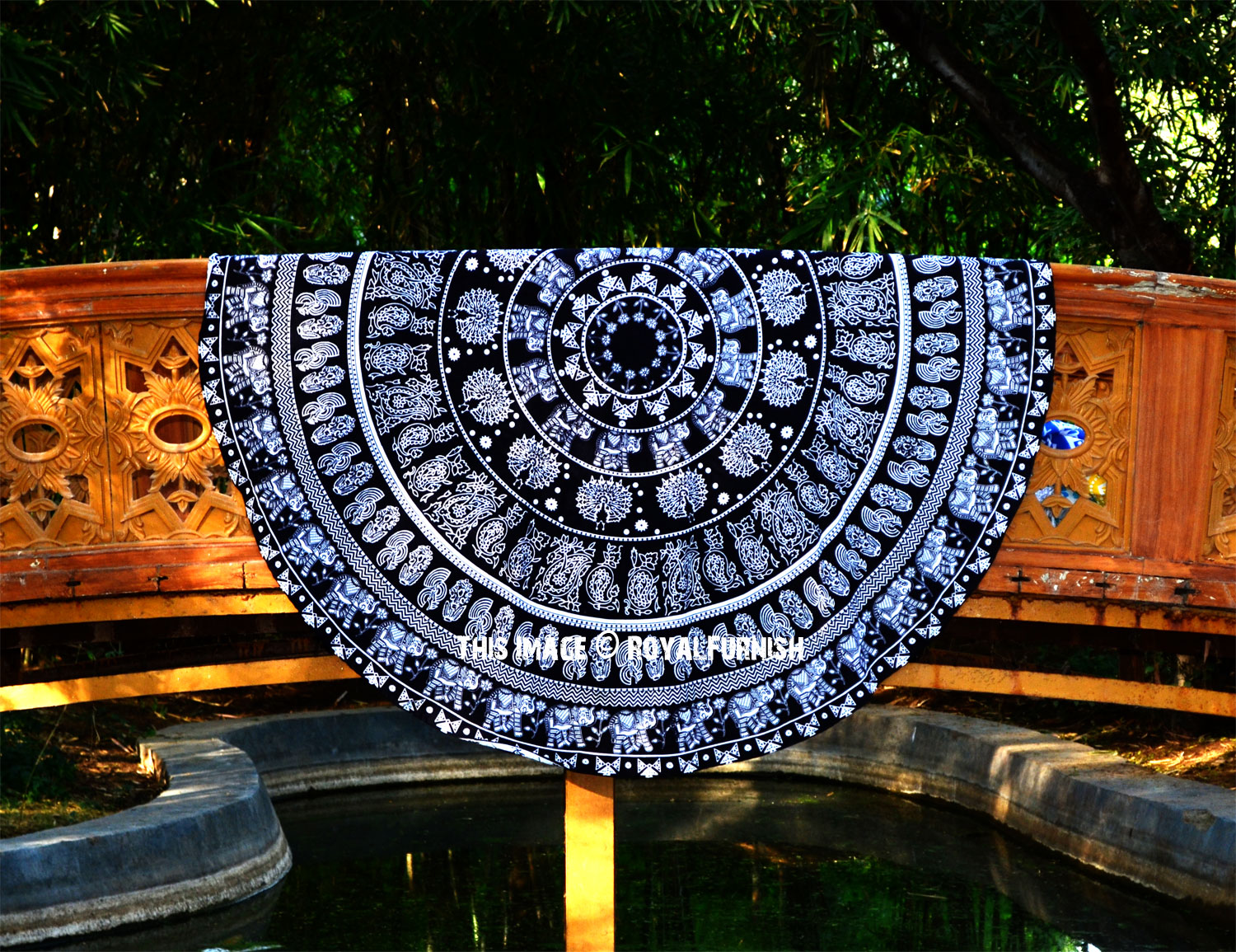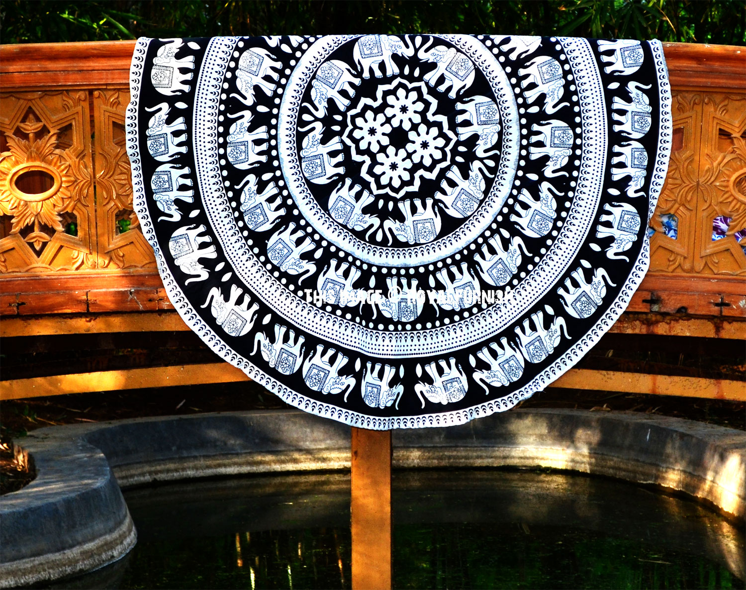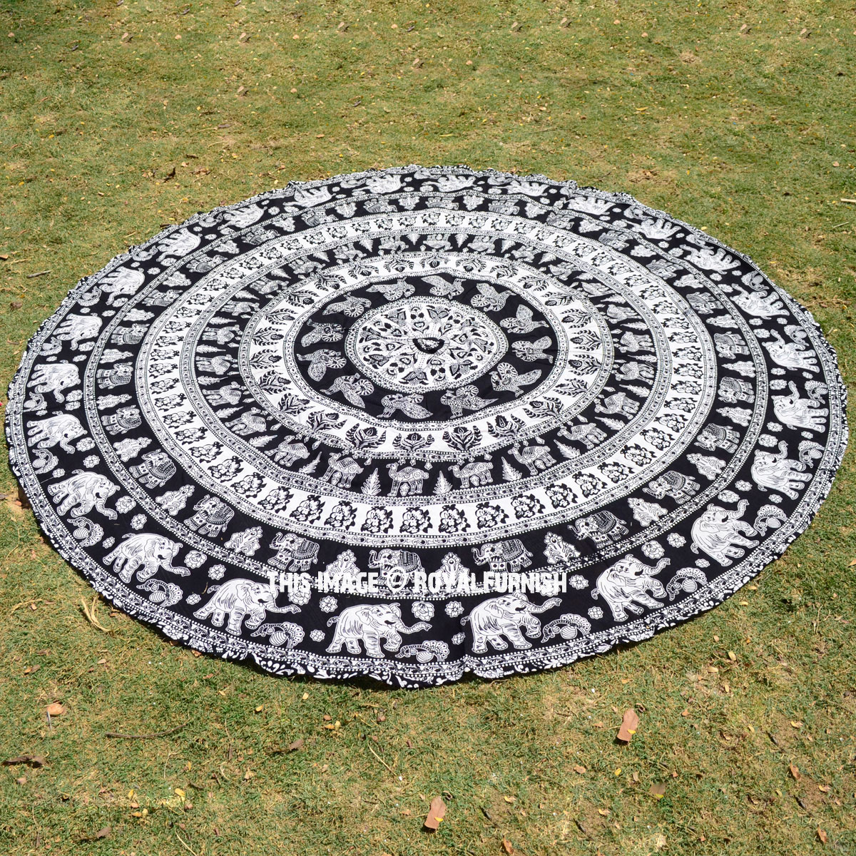 Black & White Bohemian Elephant Mandala Roundie Beach Throw, Round Table Cloth