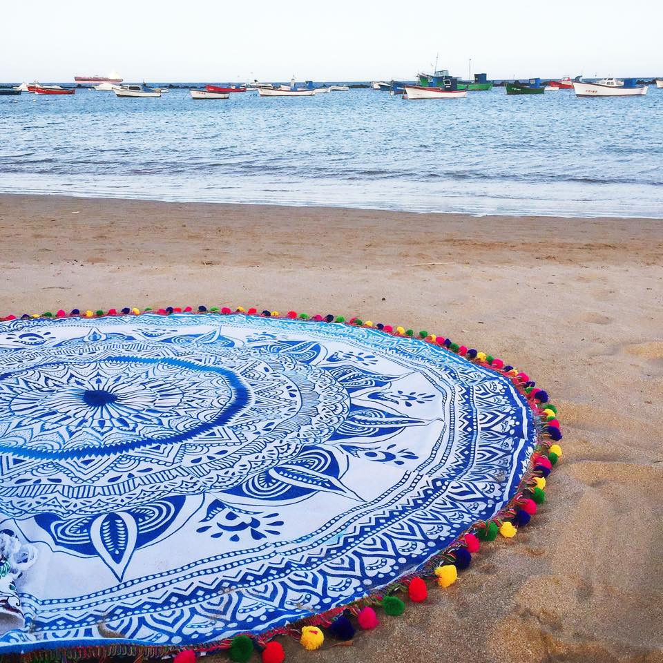 Bohemian Medallion Mandala Roundie Beach Throw, Pom Pom Round Table Cloth