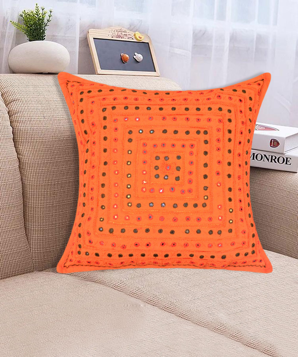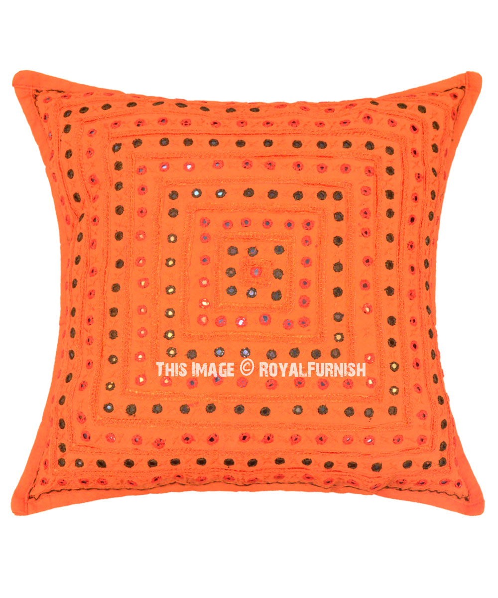 Orange 24" Unique Handmade Mirror Work Embroidered Bohemian Square Decorative Throw Pillow Case