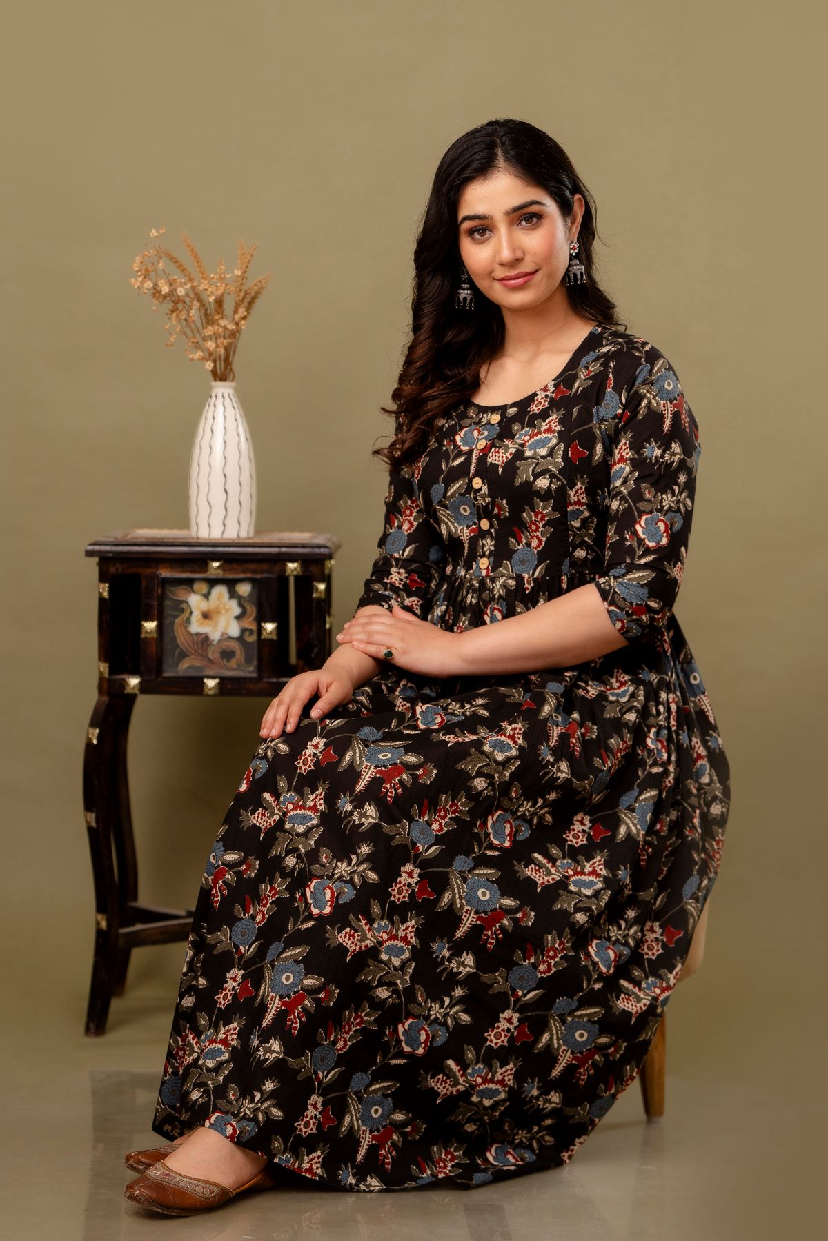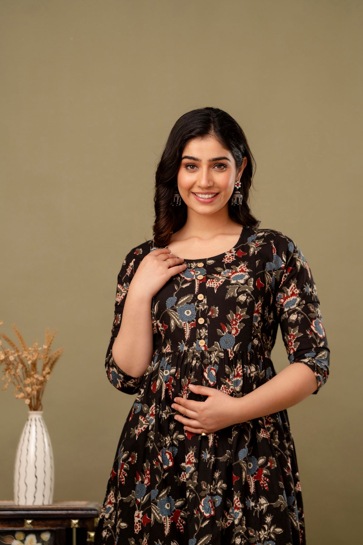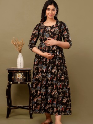 Black Floral Printed Baby Feeding Gown Cotton Maternity Anarkali Kurti with Both Side Hidden Feeding Zip