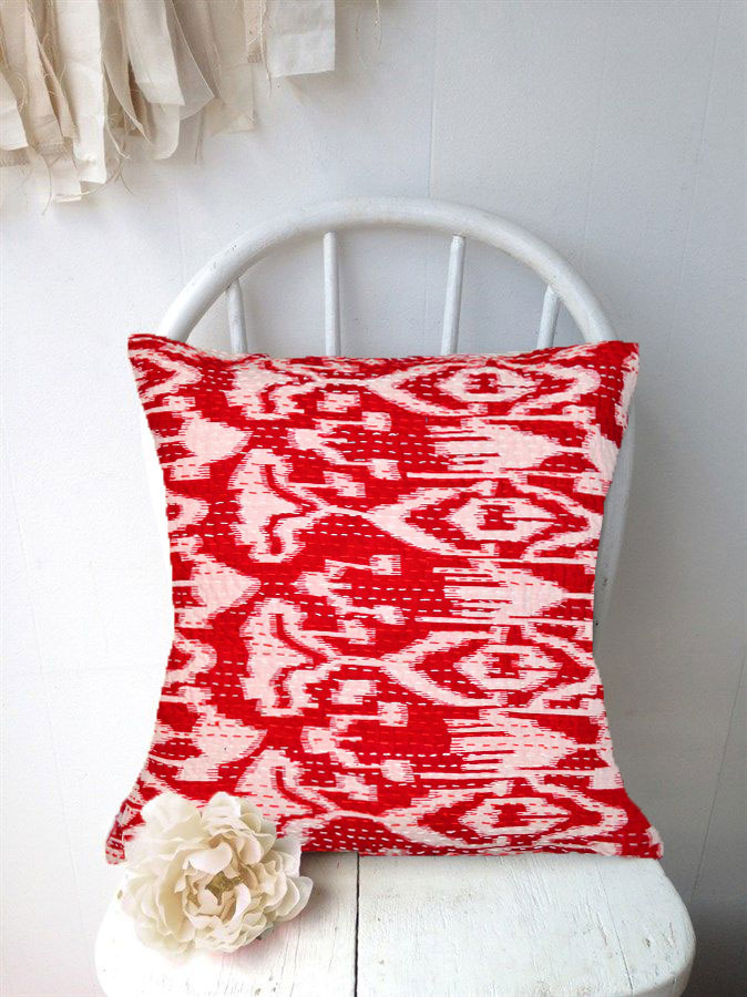 Red 20" Handmade Kantha Cushion Cover Colorful Bohemian Decorative Throw Pillow Case