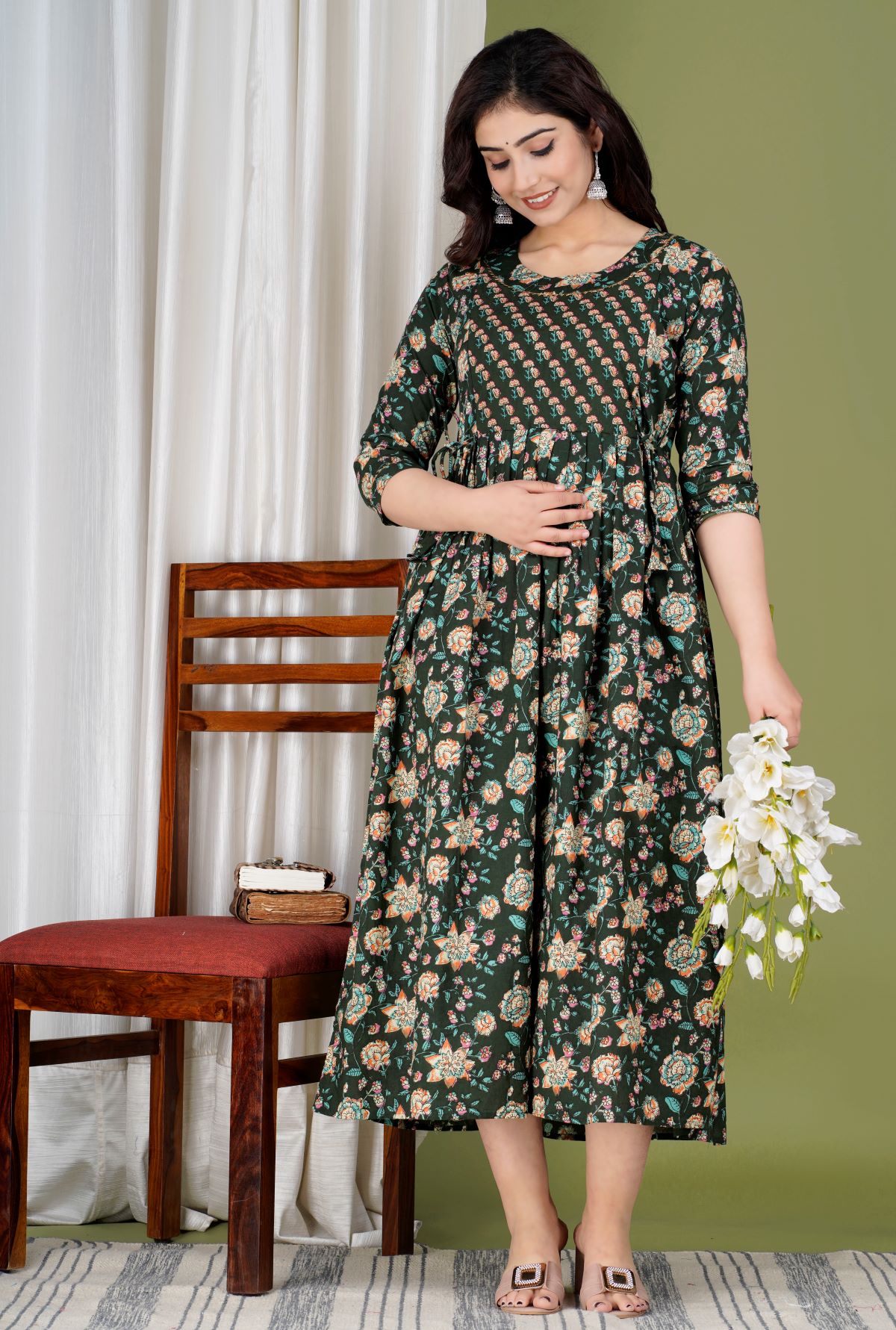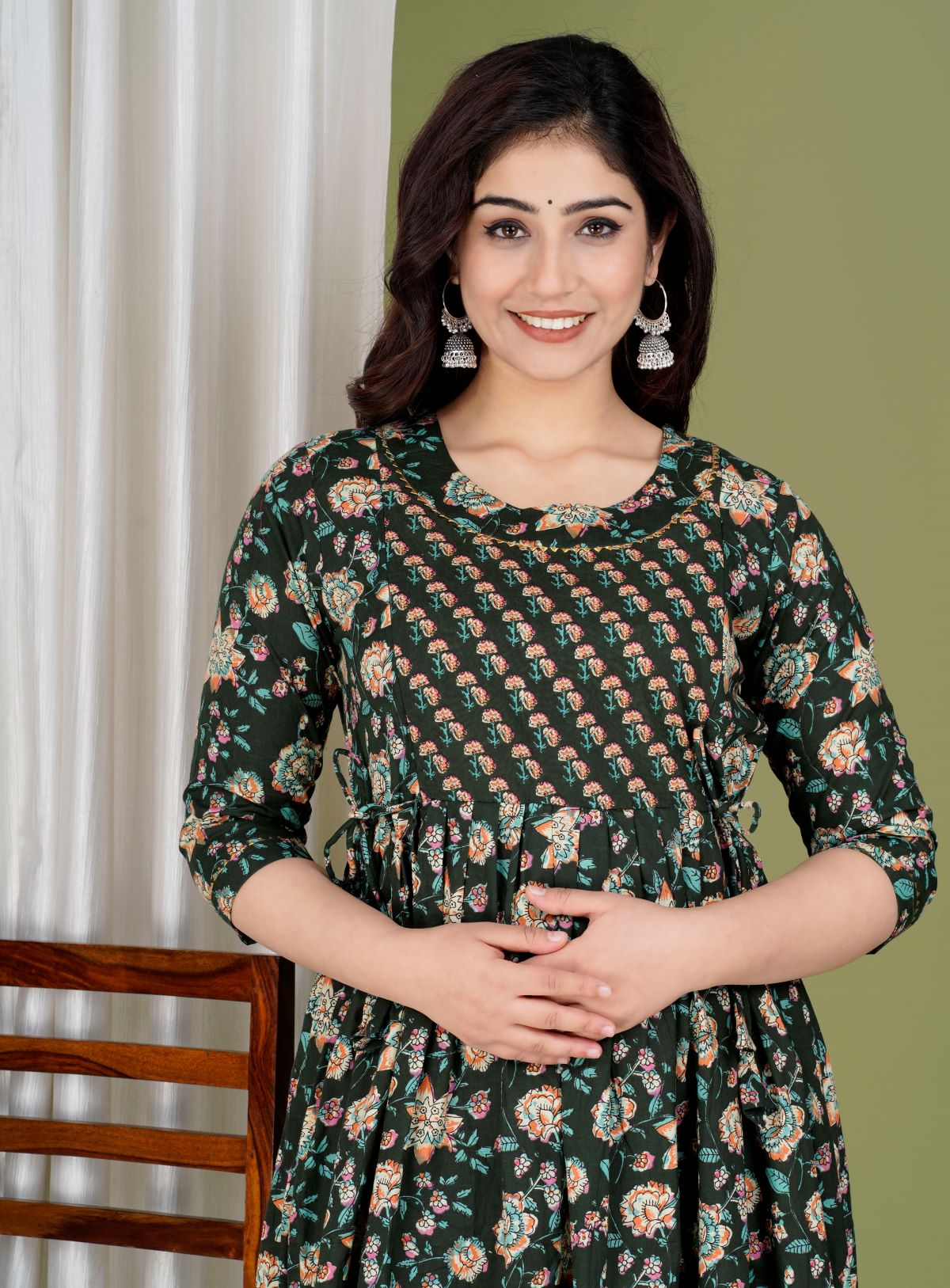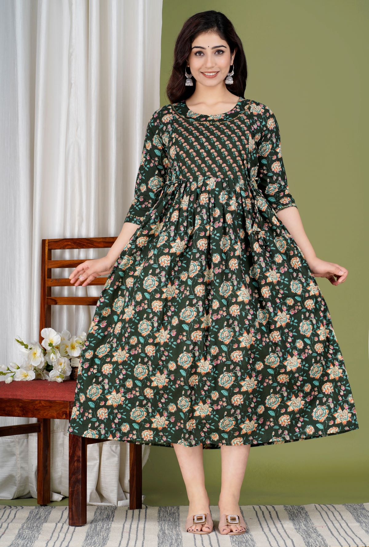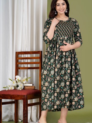 Dark Green Floral Print Soft Cotton Maternity Gown for Baby Feeding Anarkali Kurti with Discreet Zip for Pre and Post Pregnancy Kurti