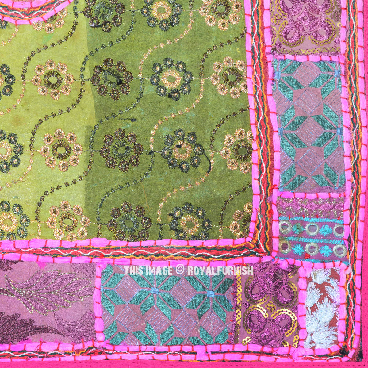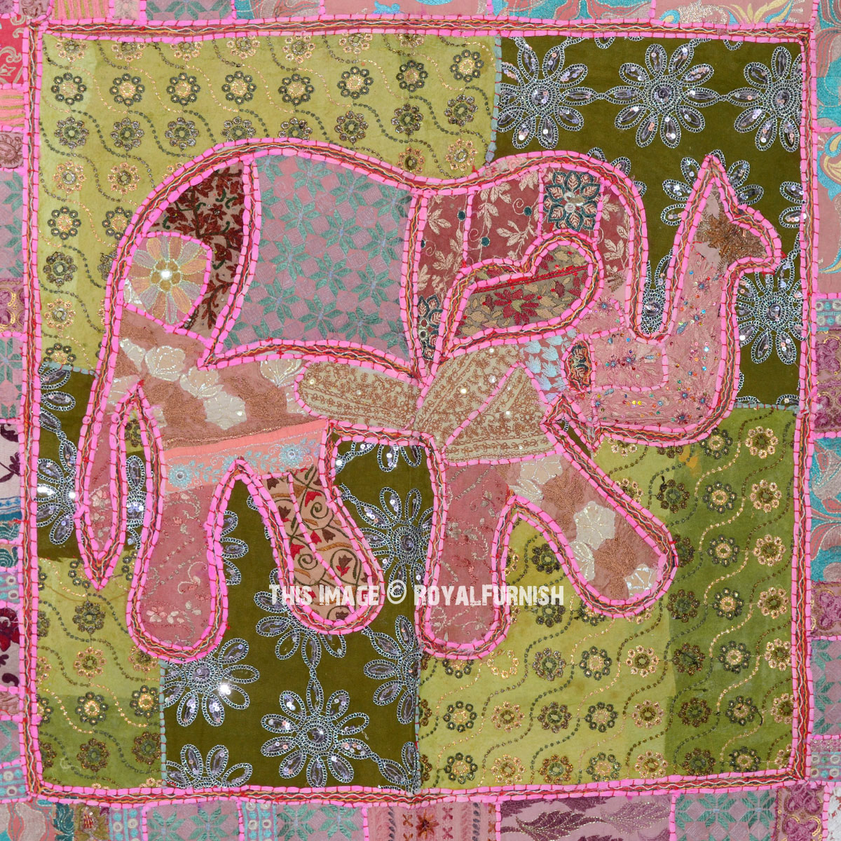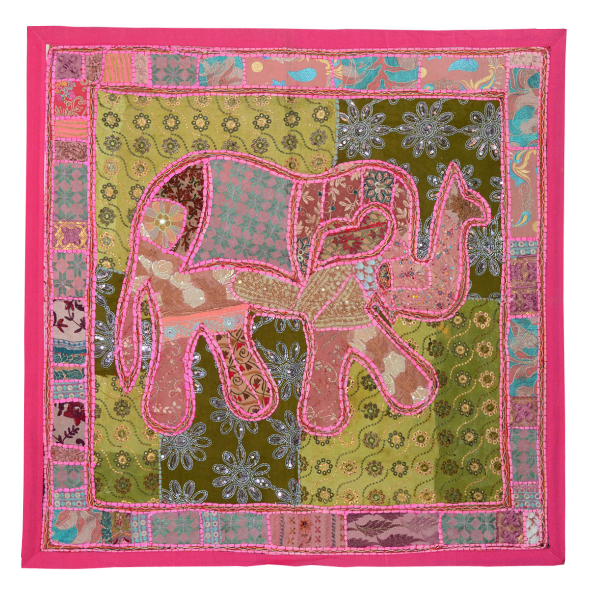 Eye-catching India vintage elephant wall tapestry made with recycled fabrics Indian suit, sari. Multi color patches are hand sewn and stitiched perfectly together with hand embroidery and backed with cotton stuff. The tapestry features multiple elements which makes it attractive and adorable. Hang it on any room living room or bed room wall to add vibrant, refresh and traditional royal look to your home.