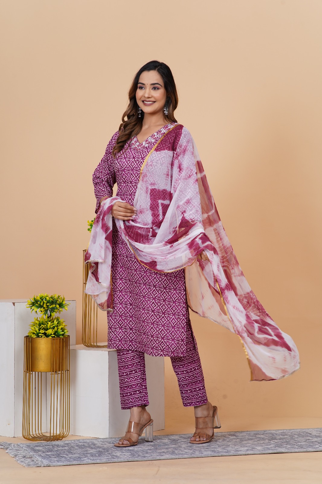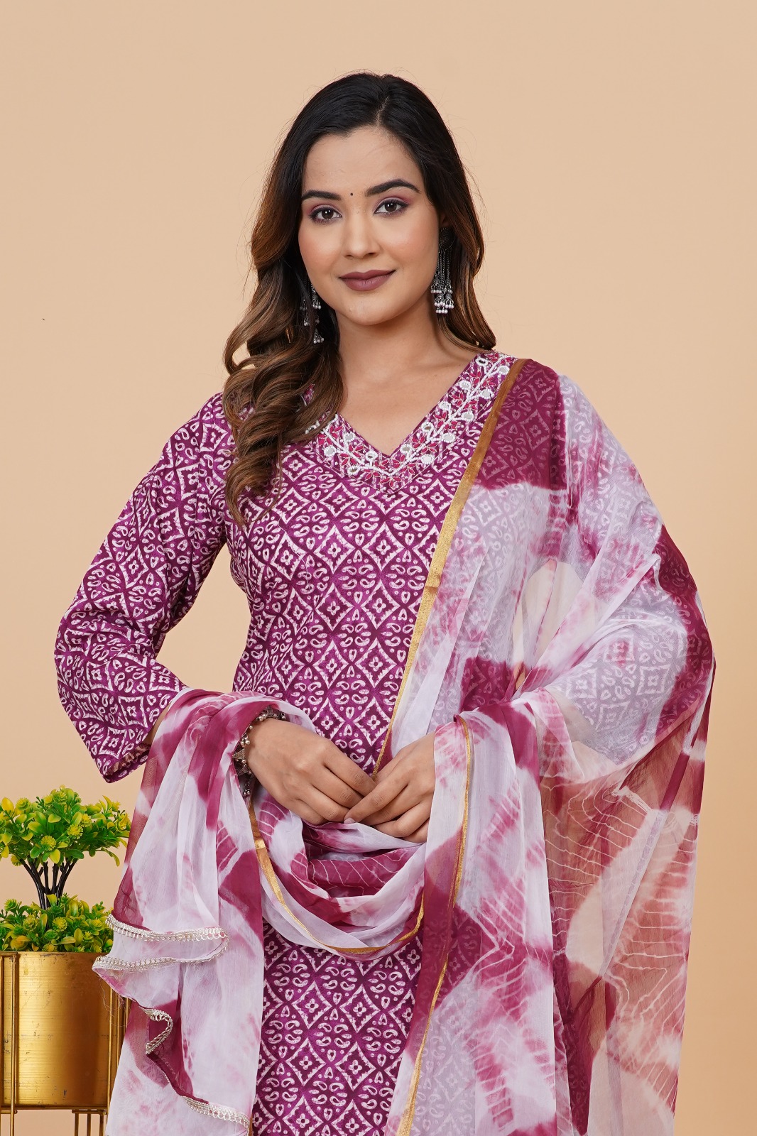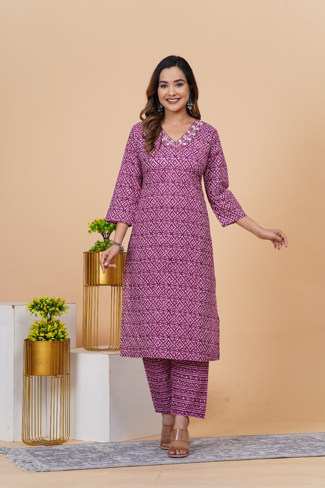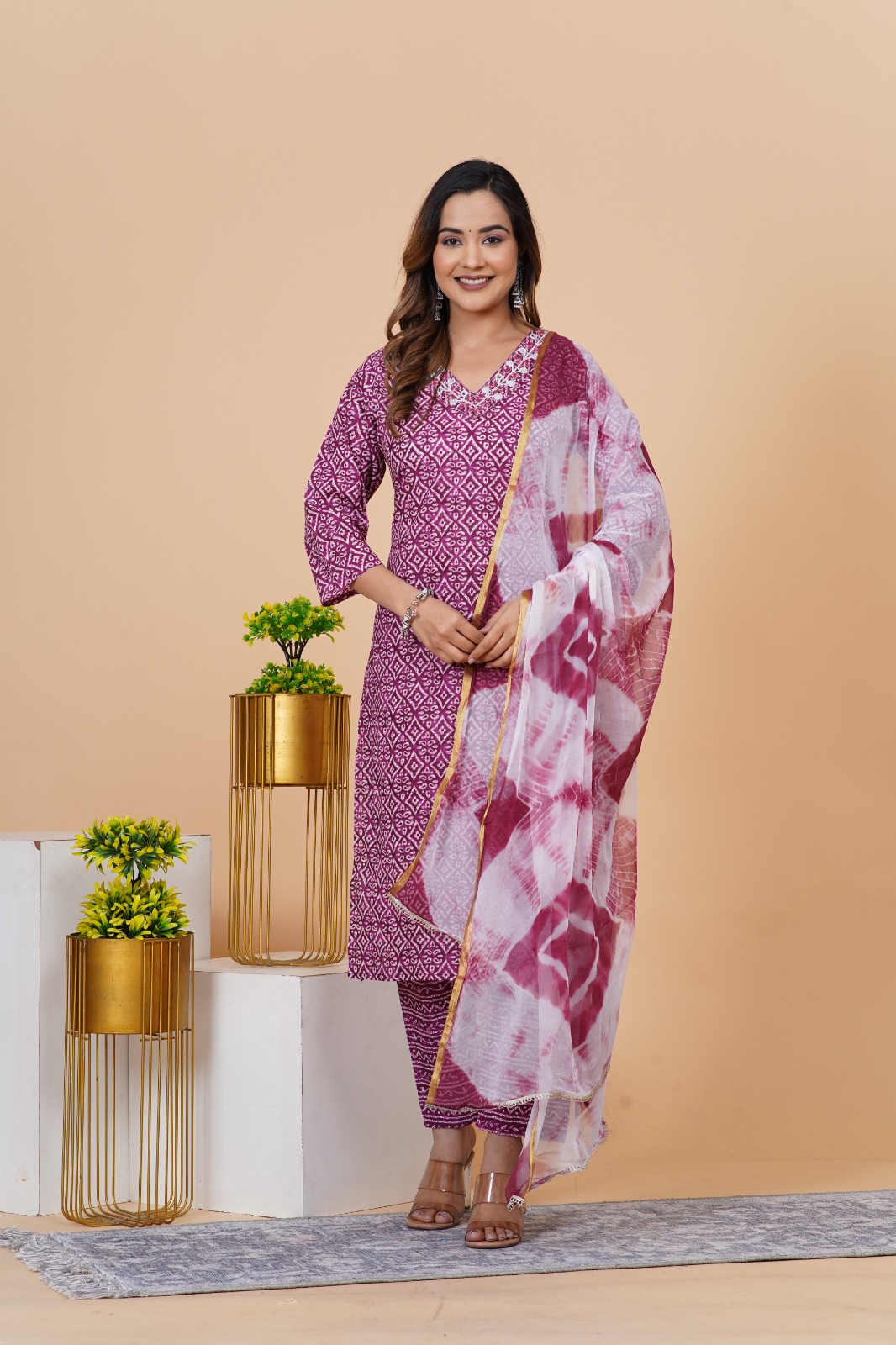 Preety Purple Cotton Kurti Pant Tie Dye Dupatta Shalwar Kameez Hand work Suit