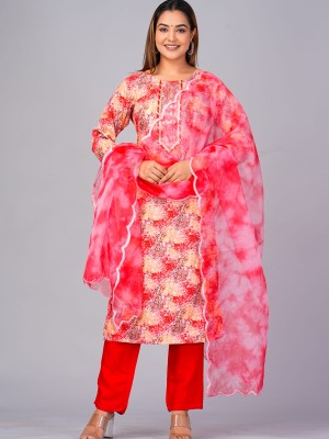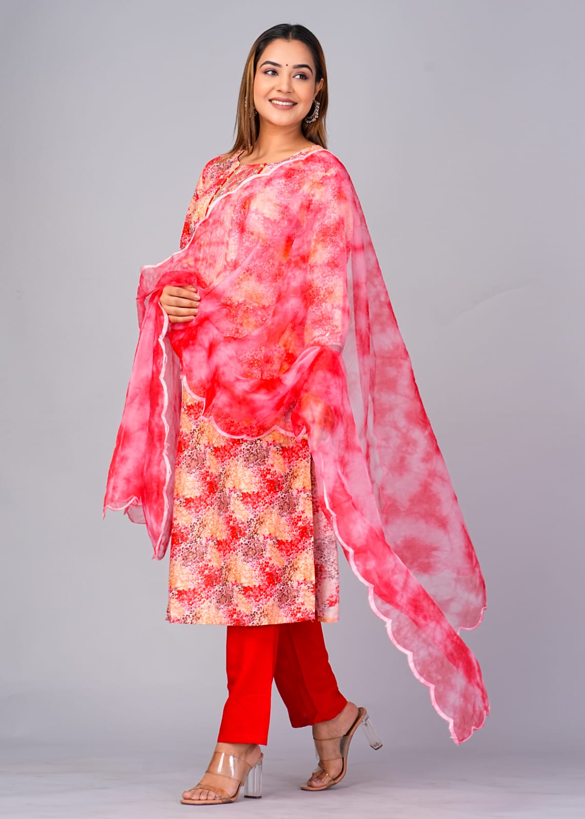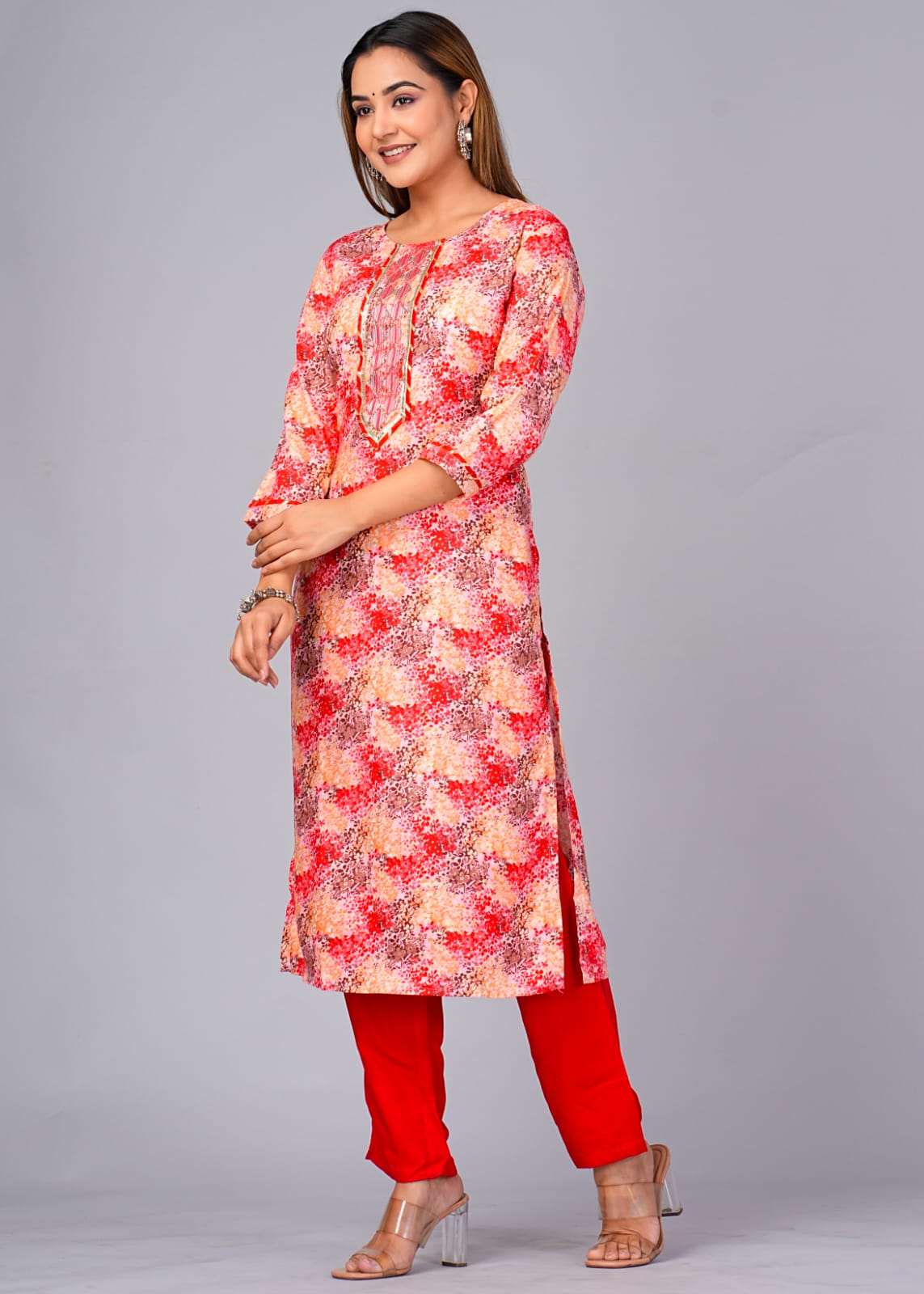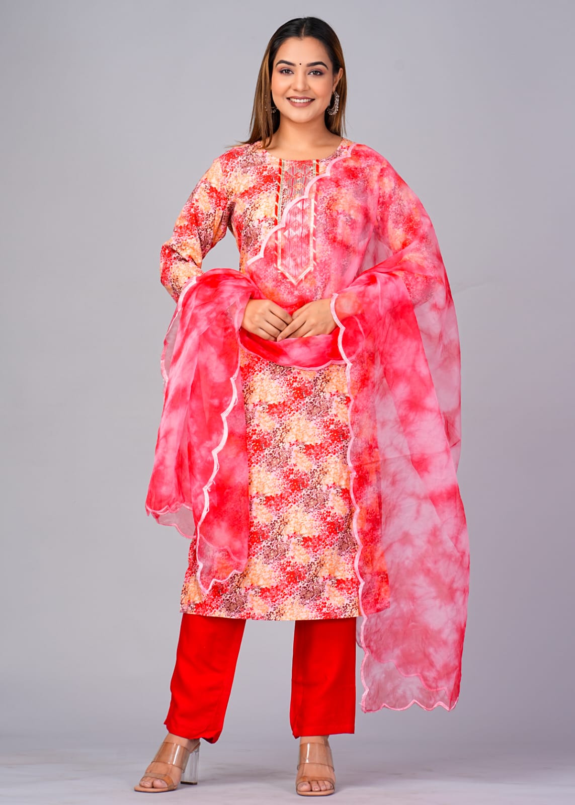 Red Plus Size Floral Embroidered Cotton Long Kurti Pant Dupatta Readymade Casual Salwar Kameez Suit