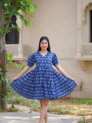 Blue Rayon Printed Frock Style Kurti Indian Anarkali Partywear V-Neck Dress for Women
