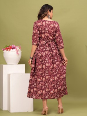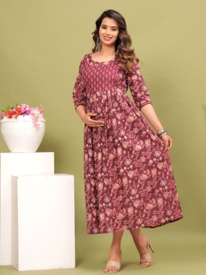 Pink Printed Soft Maternity Gown for Women Baby Feeding Anarkali Kurti Gown with Discreet Zip