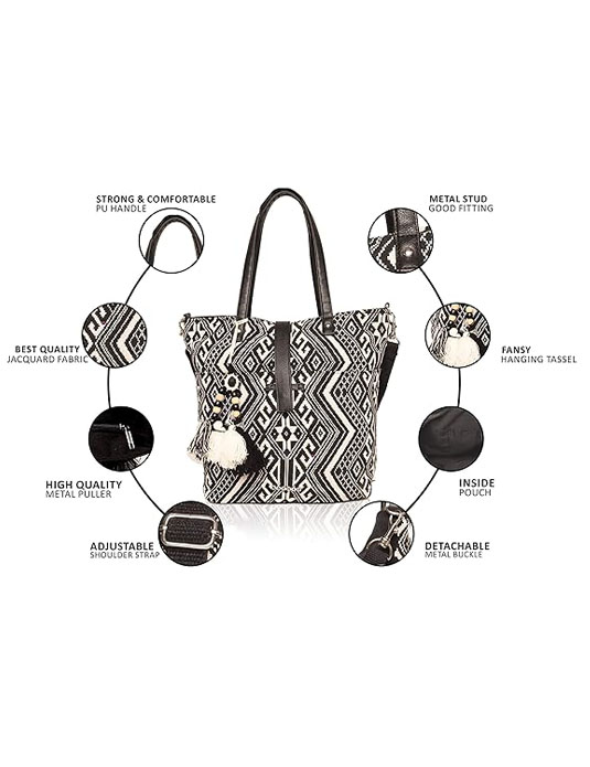 Stylish And Elegant Tote Shoulder Bag For Decoration. Great For Casual Or Many Other Occasions Such As Travel, Business, Work, Gym, Beach, Etc. TOTE BAGS FOR WOMEN AND GIRLS - This cotton handbag for women with detachable sling is lightweight and comfortable to carry. This cloth handbag for women, made with beautiful cotton canvas dhurrie, measuring 35x40x12 cm, with 10 kg capacity, zipper closure this college bag for women is perfect for any outfit and occasion.