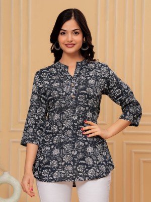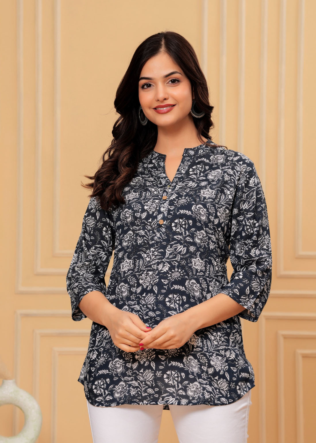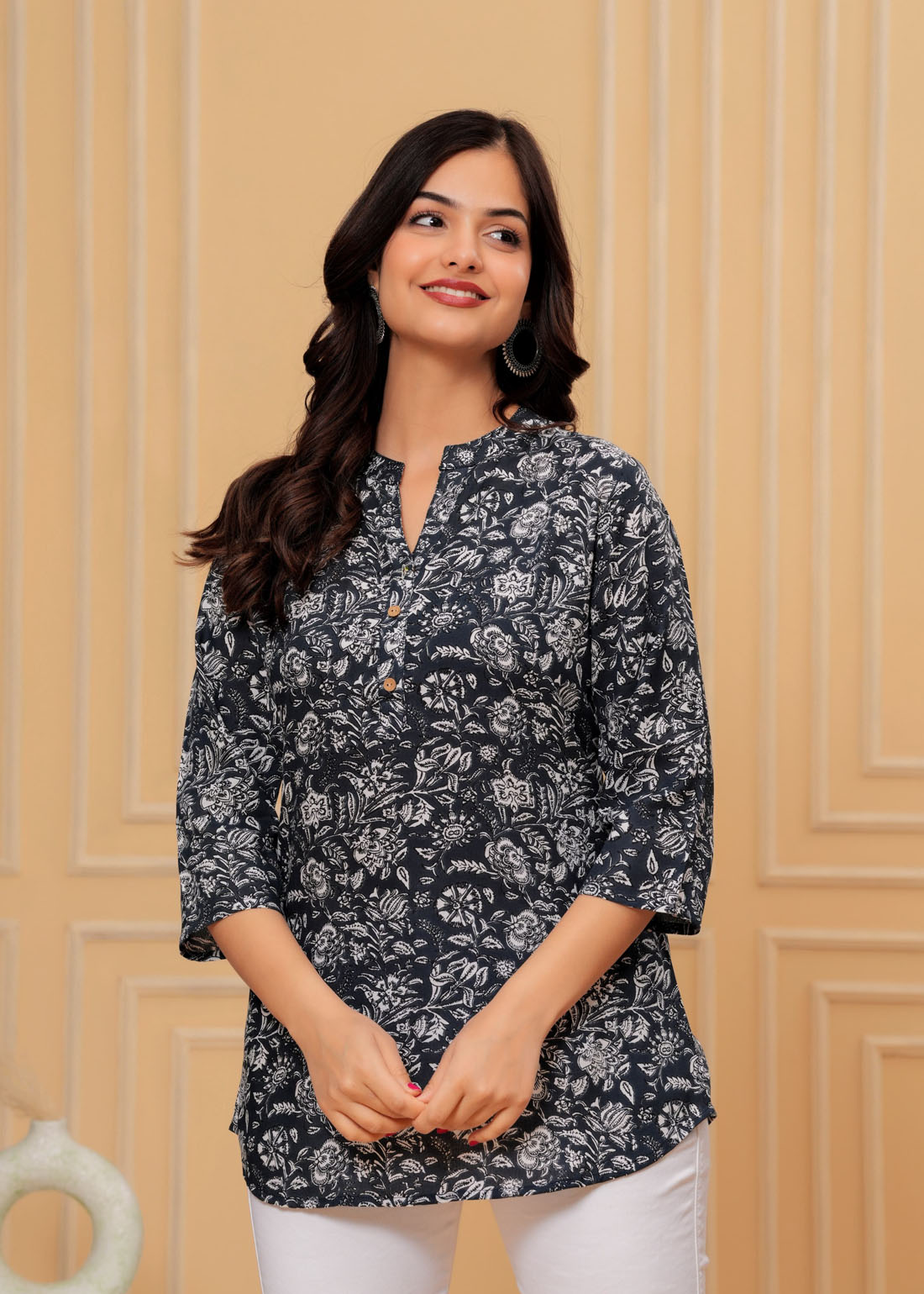 Black Floral Printed Short Style Kurti Tunic Top for Women Sanganeri Print Short Kurta