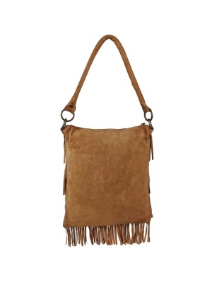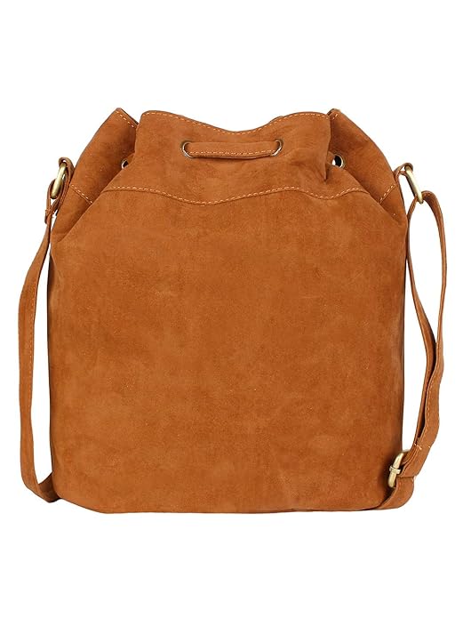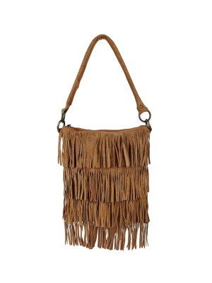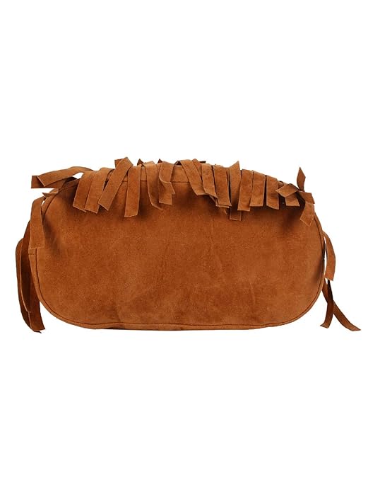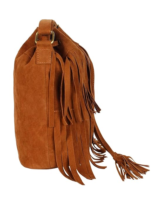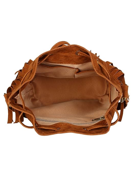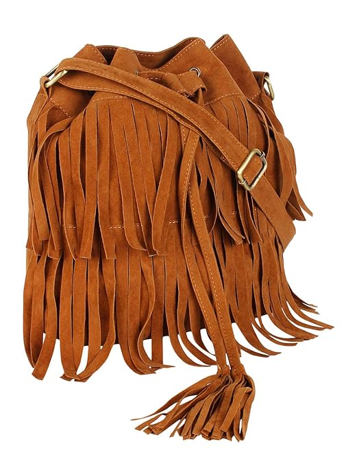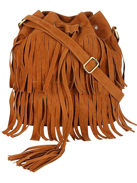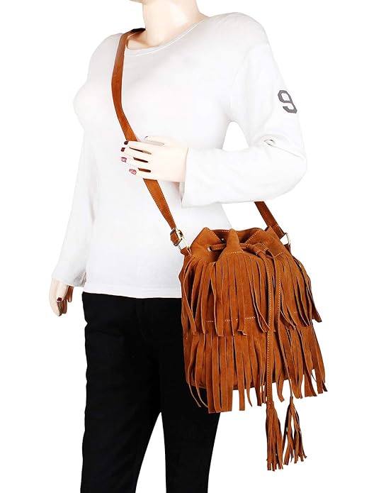 Tan Women Faux Suede Tassel Fringe Bucket Bag Hippie Shoulder Bag Crossbody Bag with Drawstring Closure