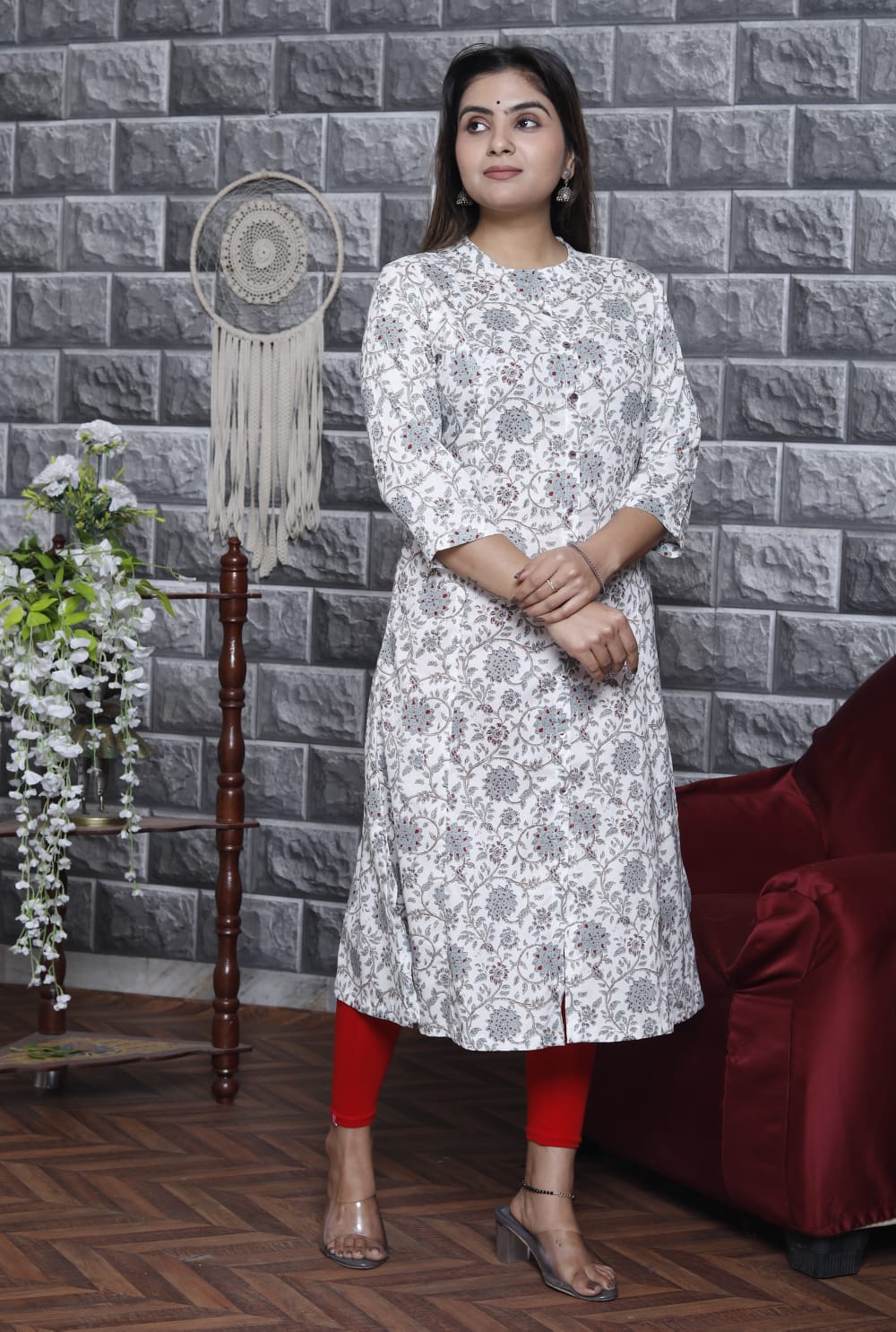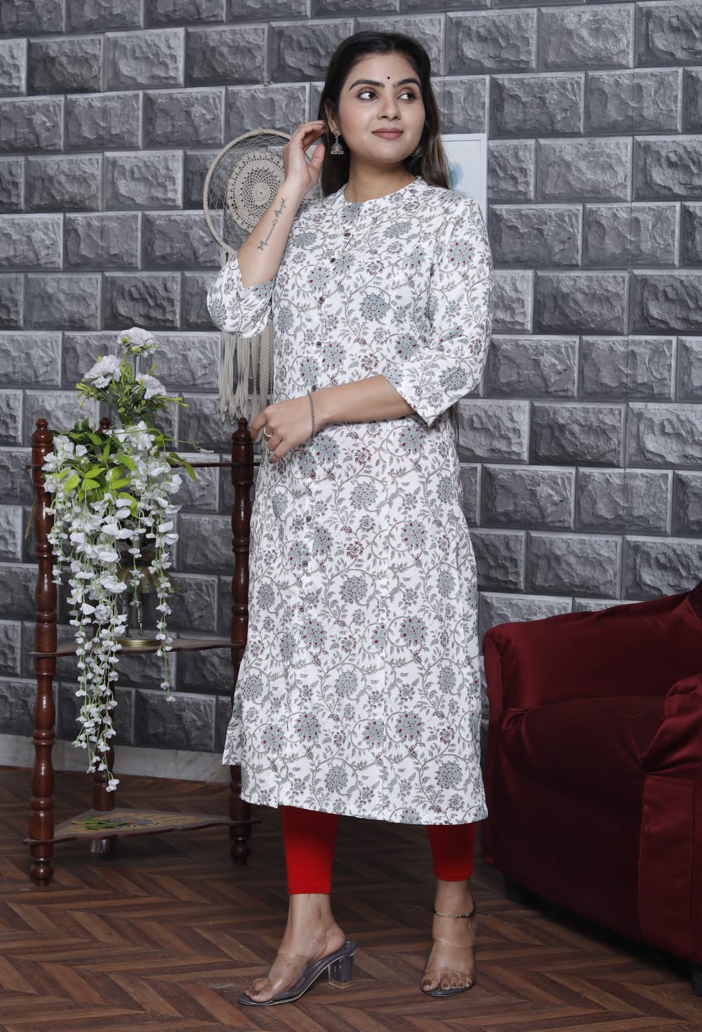 Grey White Floral Print Long Straight Kurti Printed Casual Top Tunic
