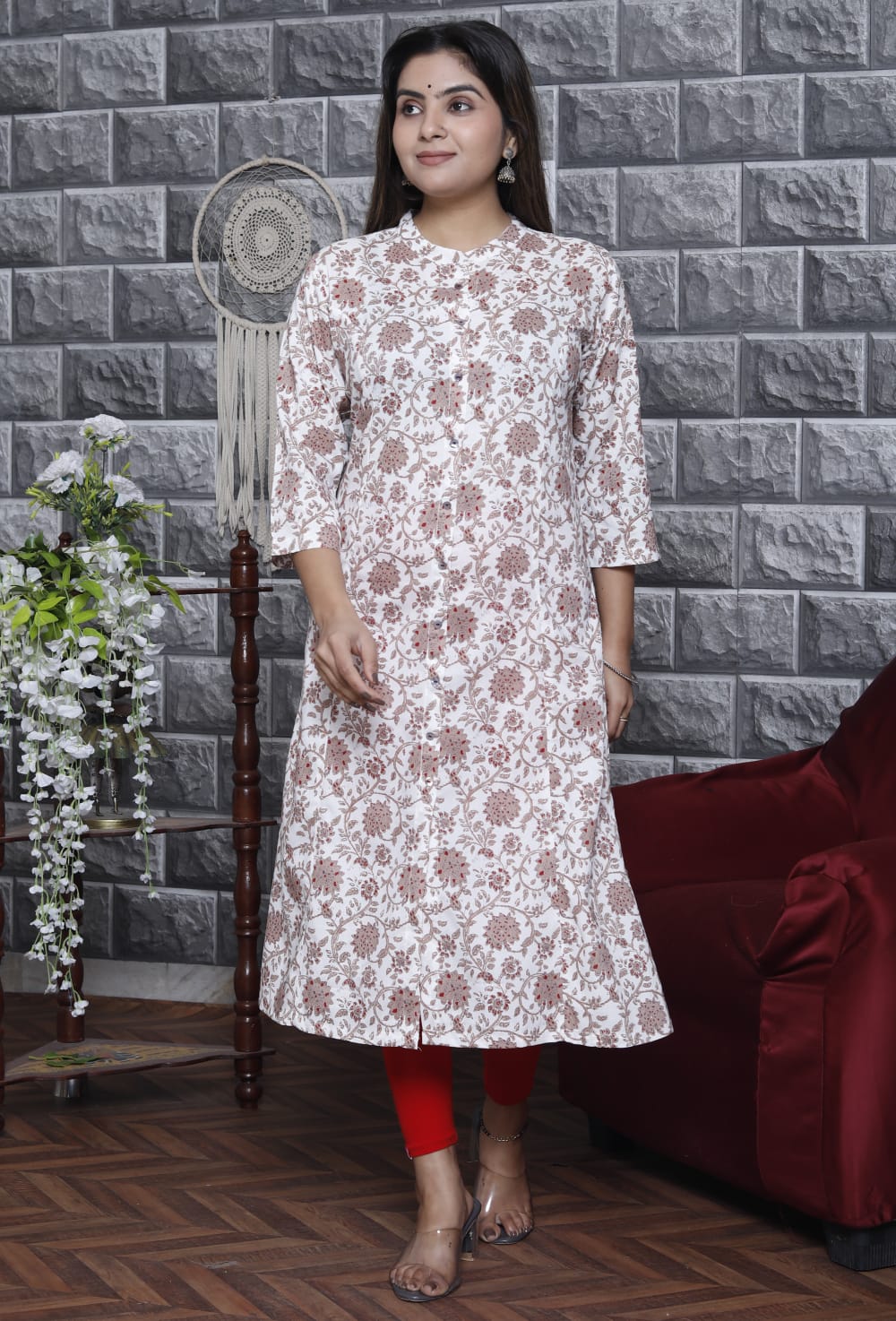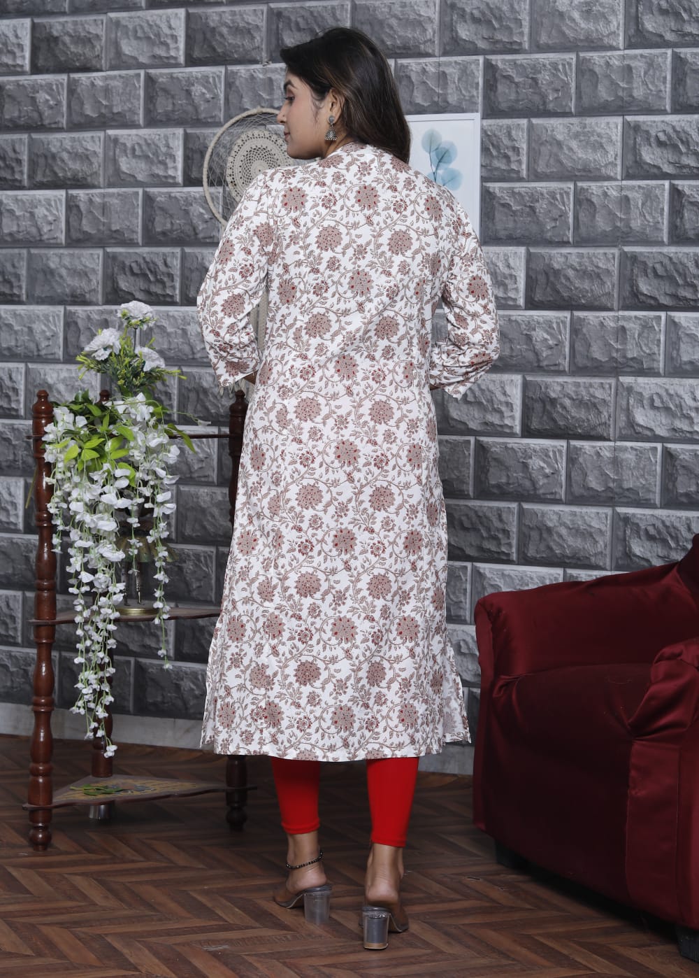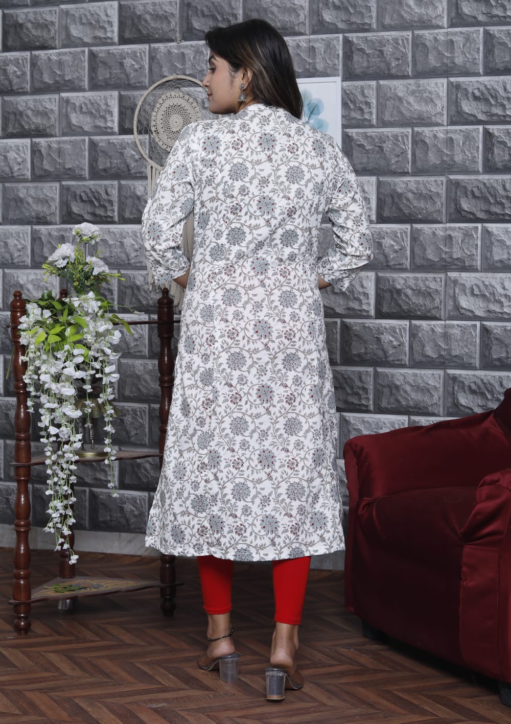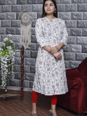 White Floral Print Long Straight Kurti Printed Casual Top Tunic