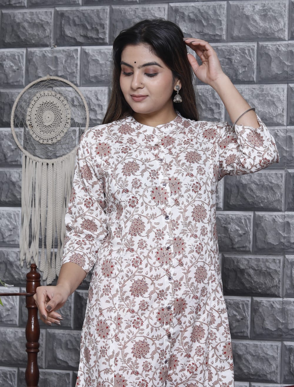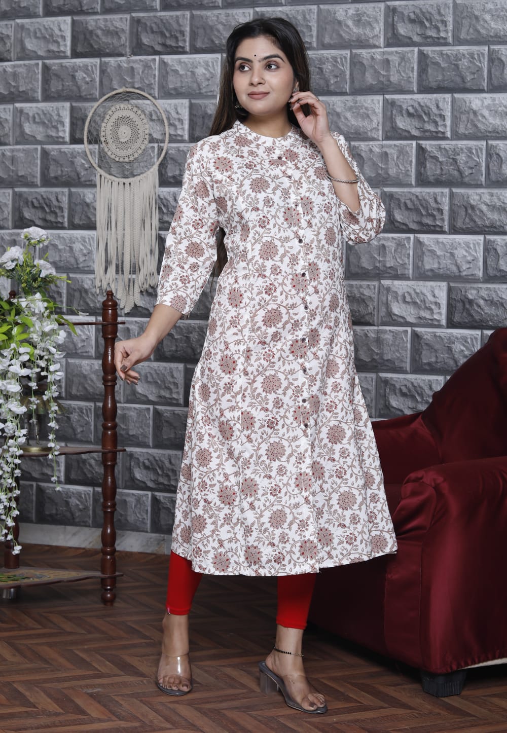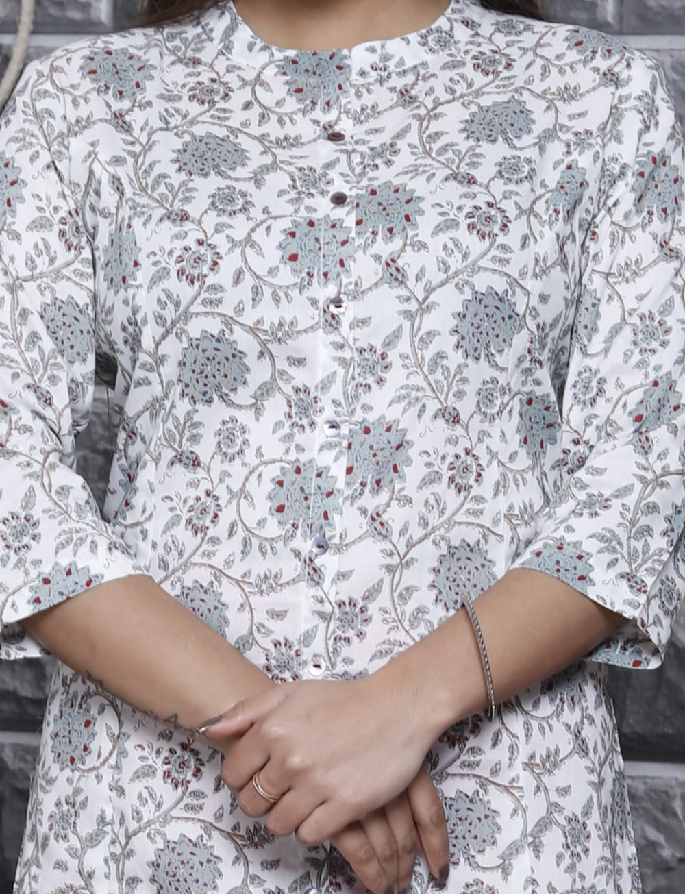 White Floral Print Long Straight Kurti Printed Casual Top Tunic