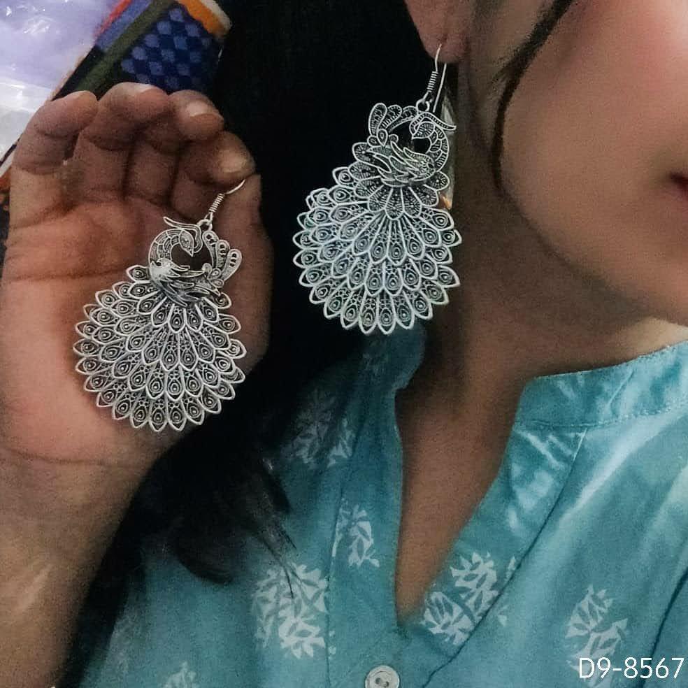 Indian Bollywood Oxidized Silver Long Peacock Feather Drop Earrings - 1 Pair