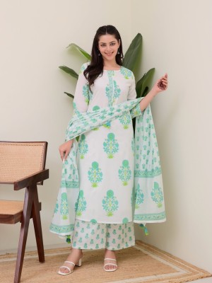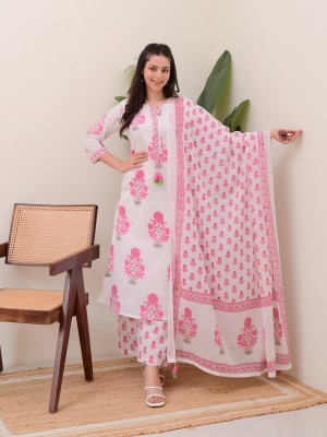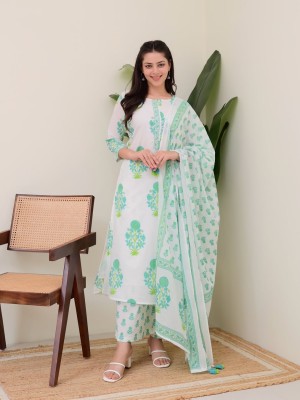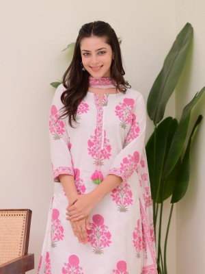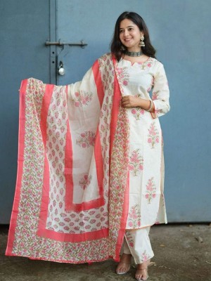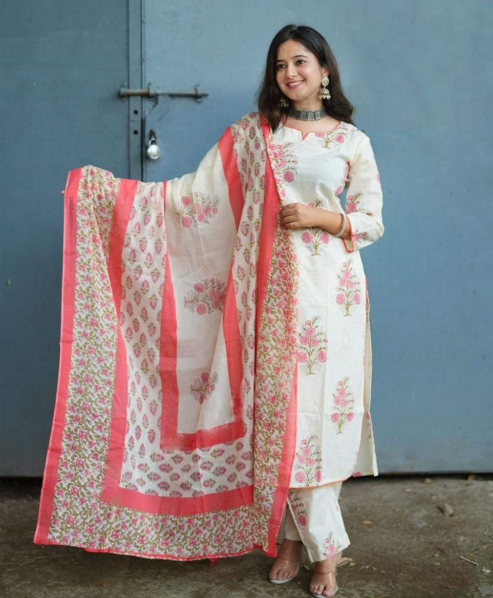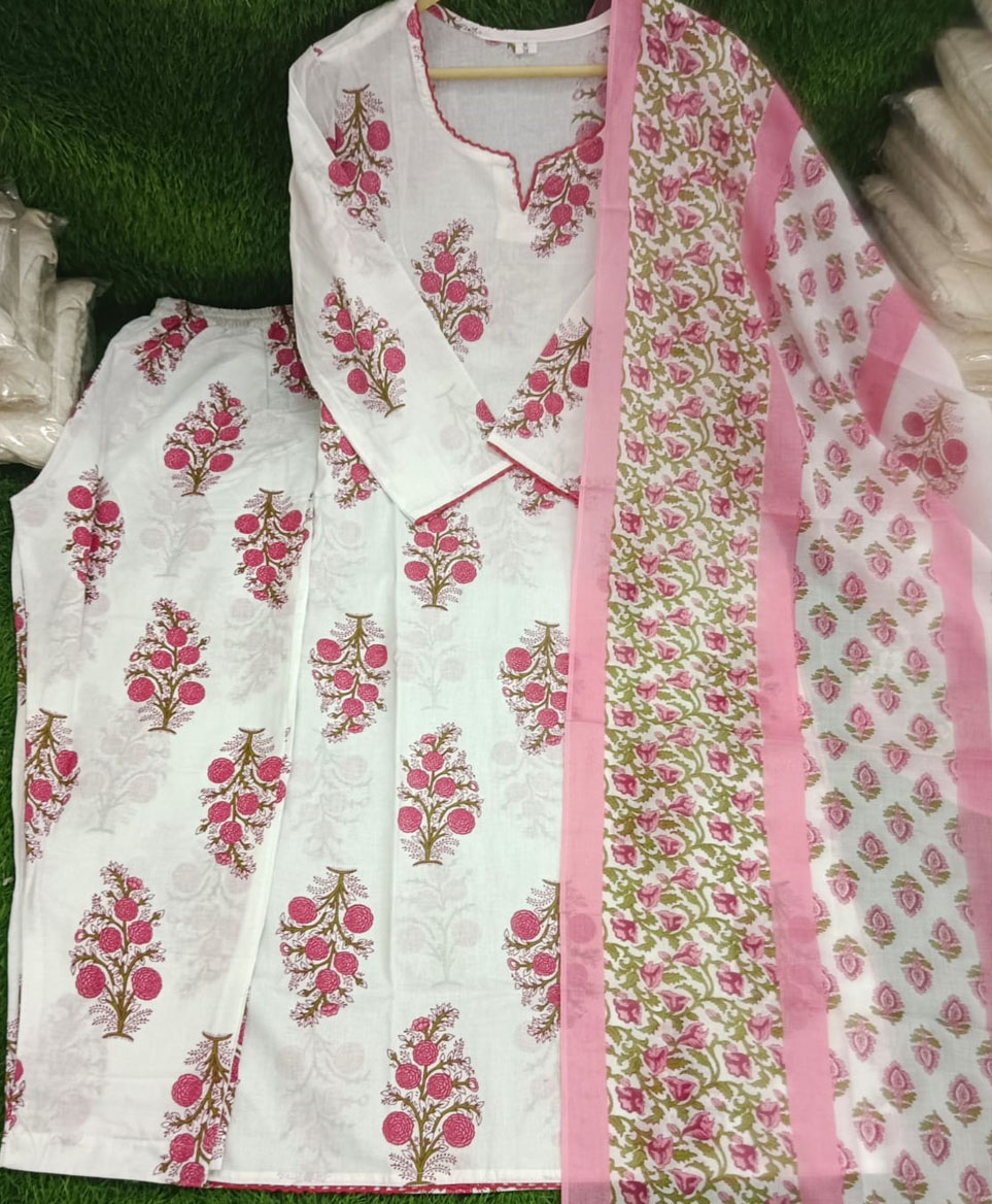 White Floral Block Print Kurti Set Ethnic Kurti Pant Dupatta Cotton Shalwar Kameez Suit