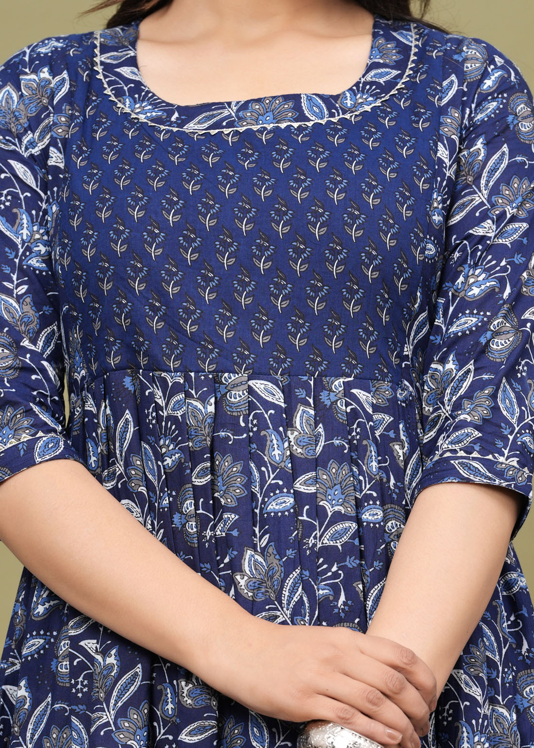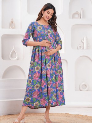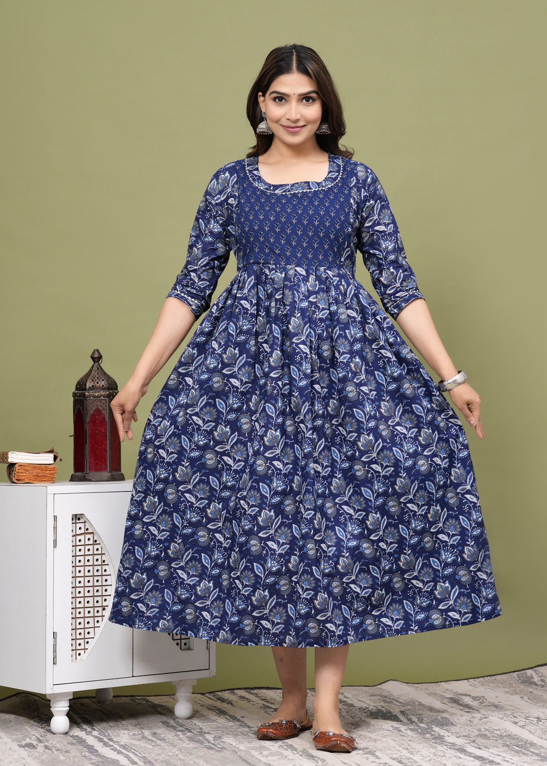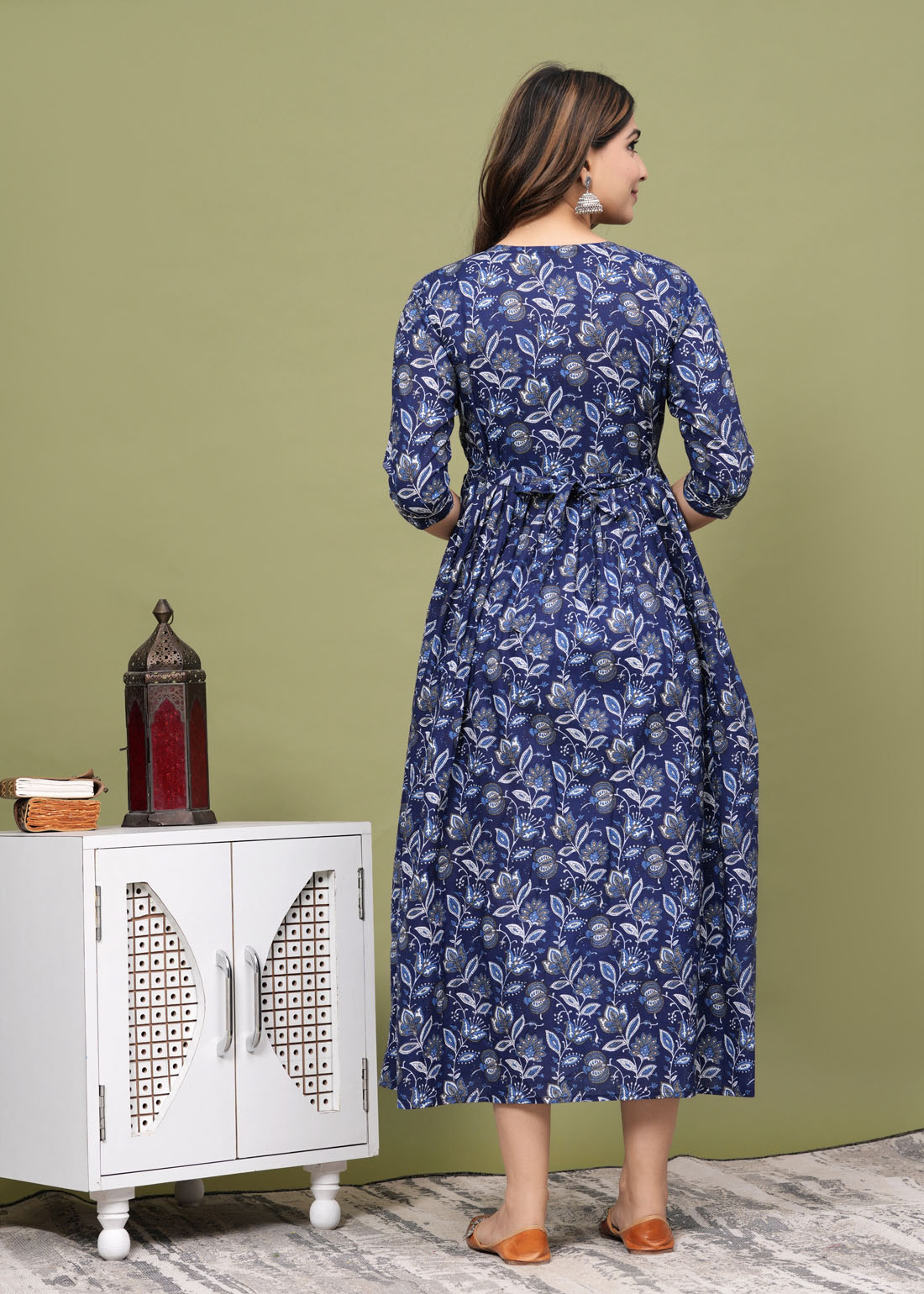 Blue Floral Print Soft Cotton Maternity Gown for Baby Feeding Anarkali Kurti with Hidden Feeding Zip