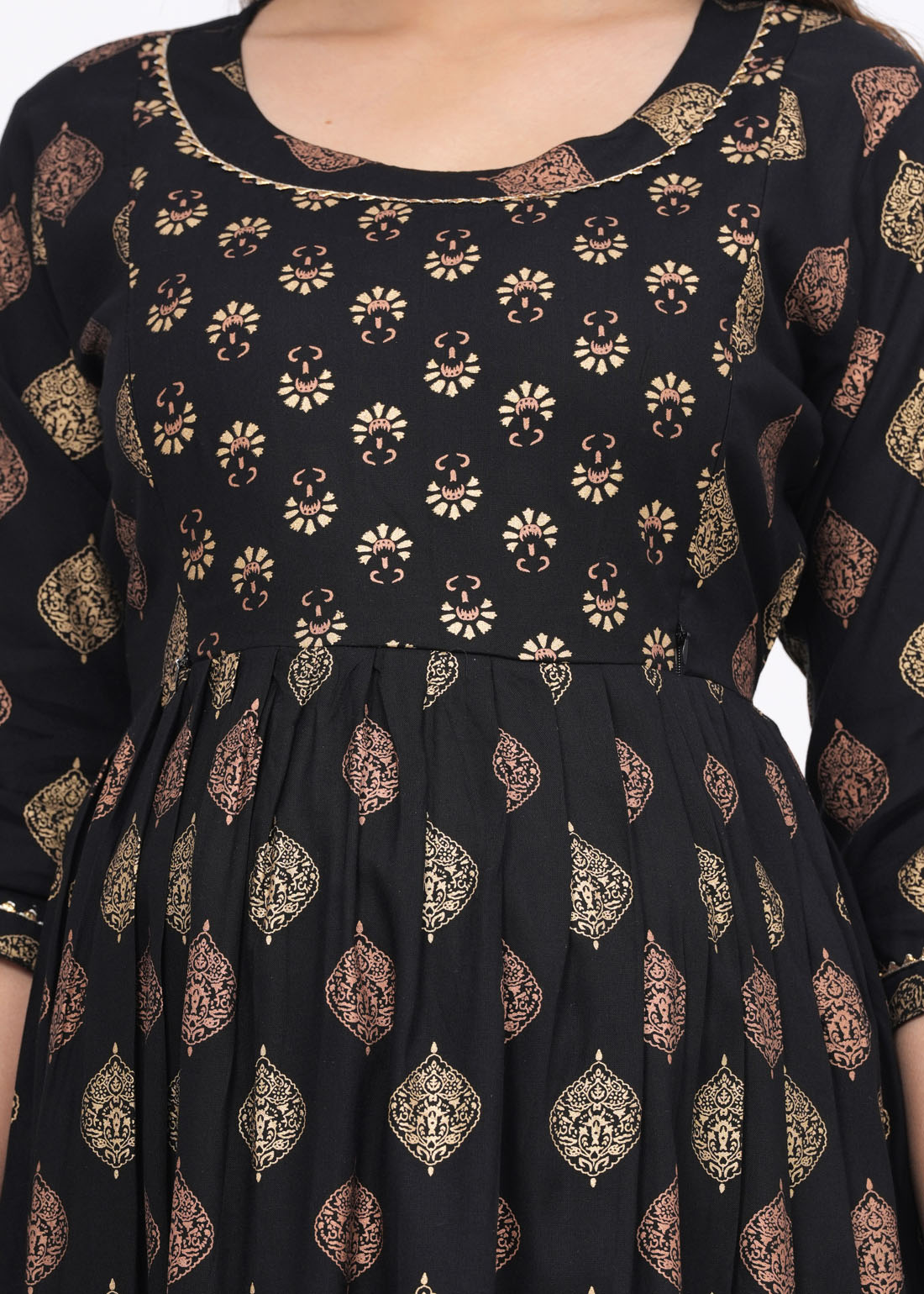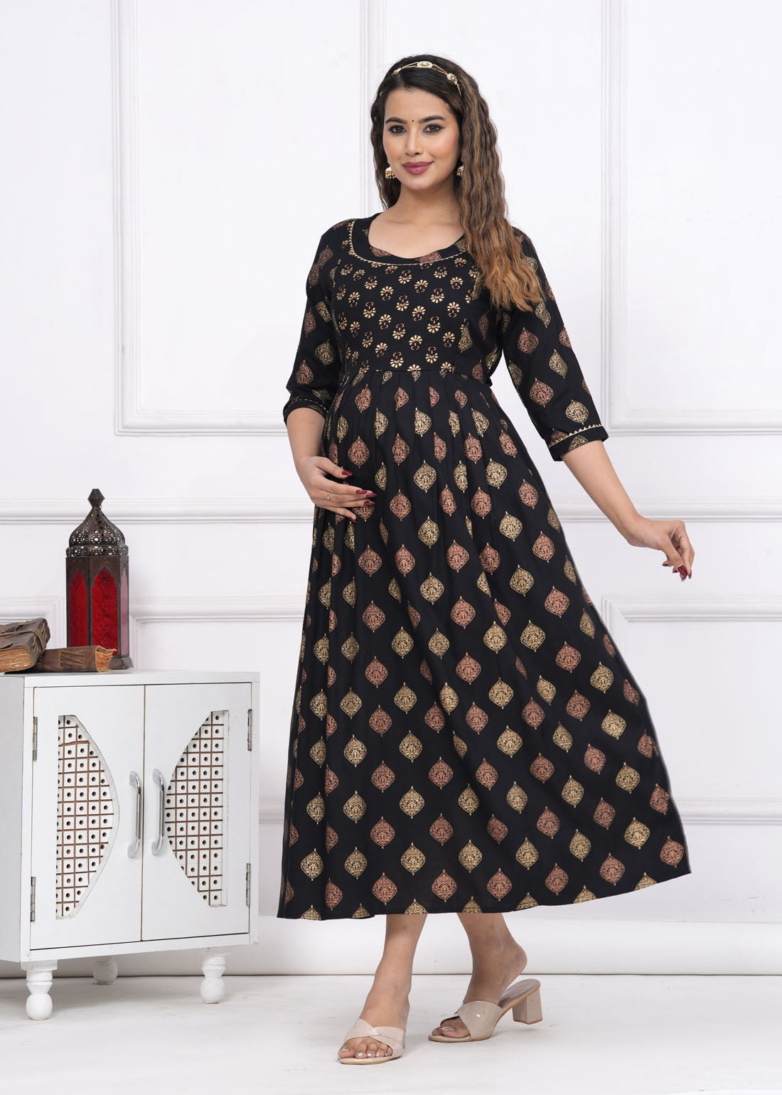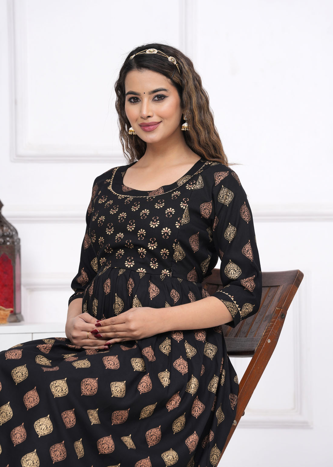 Black Floral Soft Cotton Maternity Baby Feeding Gown Anarkali Kurti with Hidden Feeding Zip