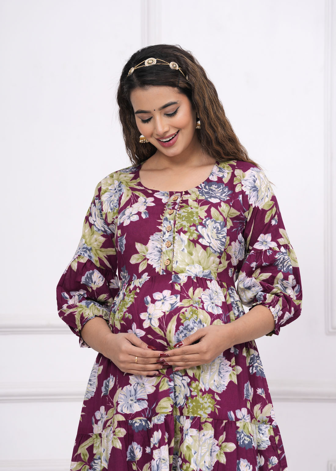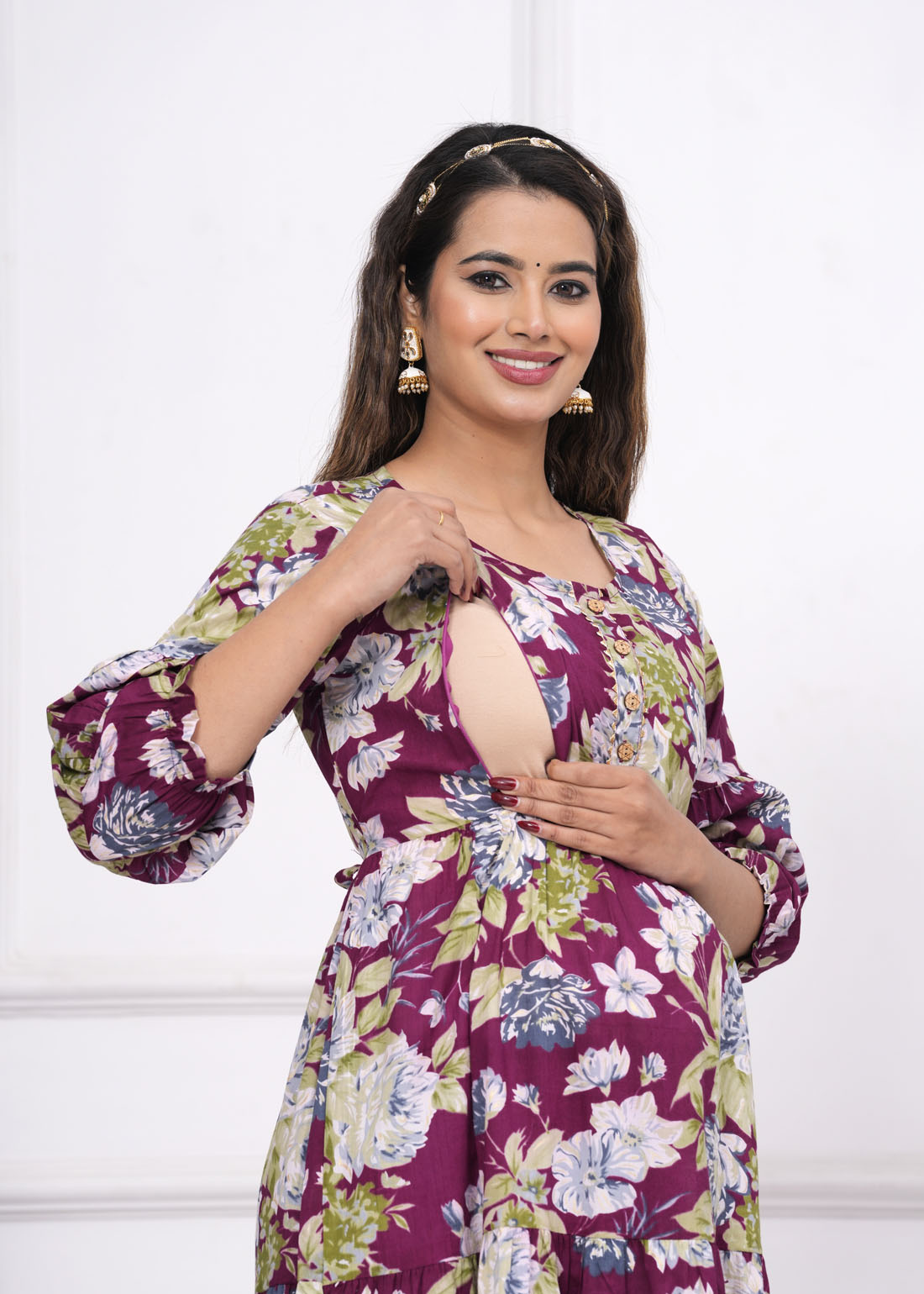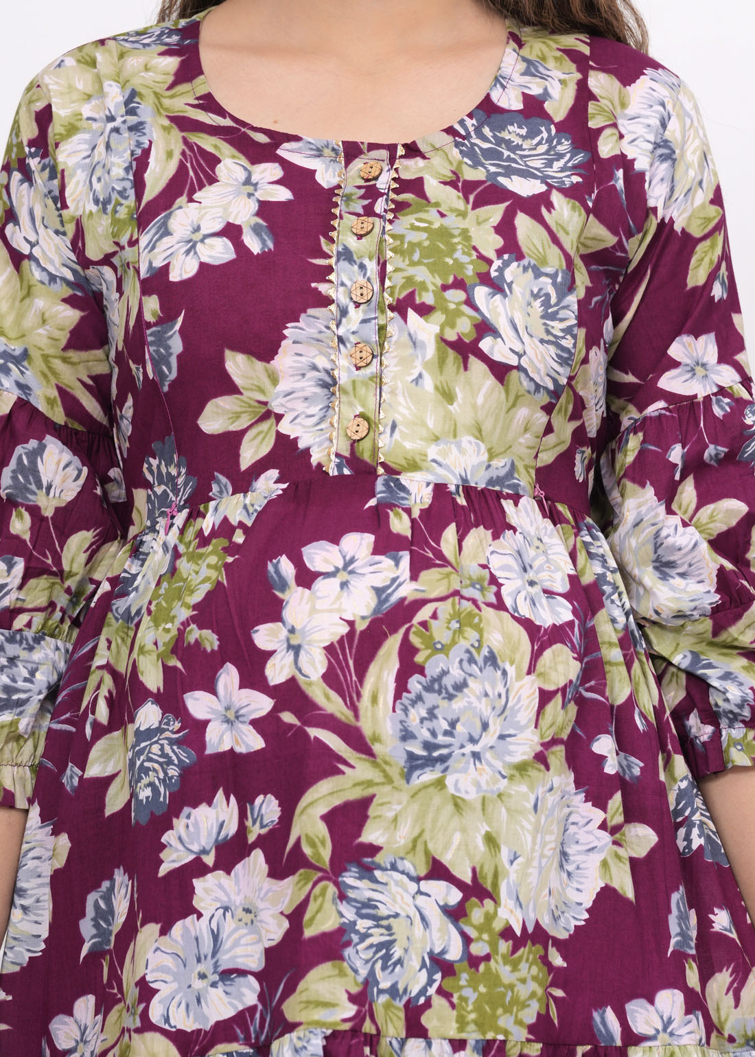 Floral Wine Color Soft Cotton Maternity Baby Feeding Gown Anarkali Kurti with Hidden Feeding Zip