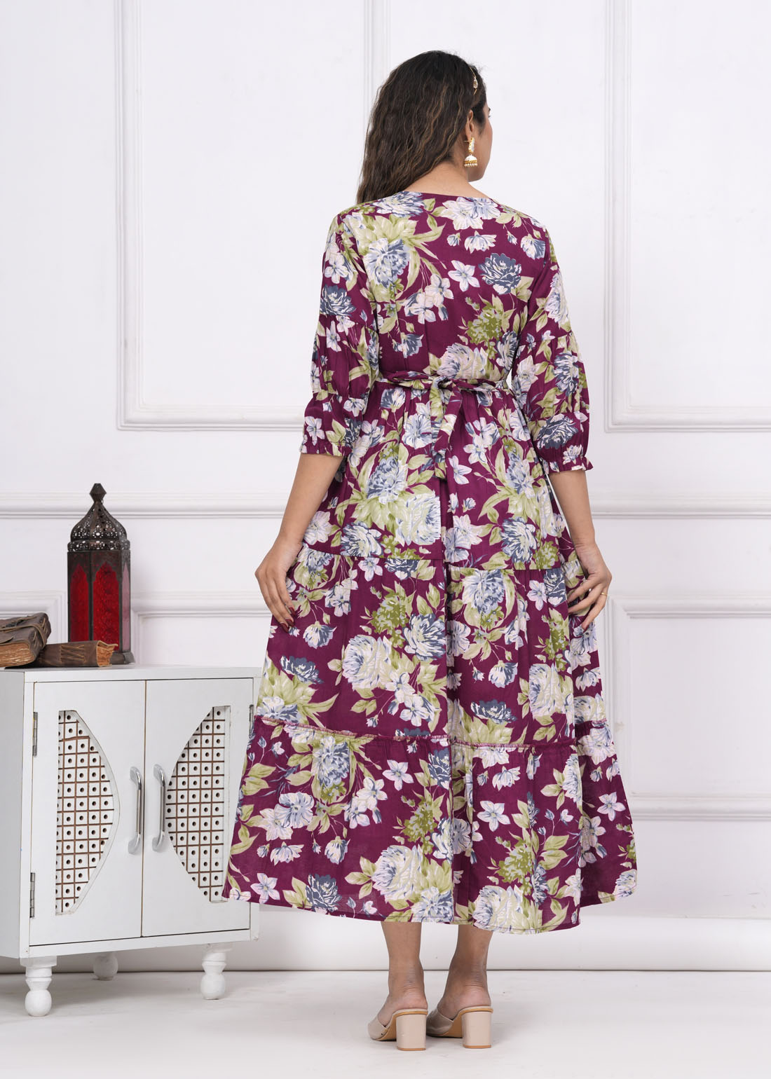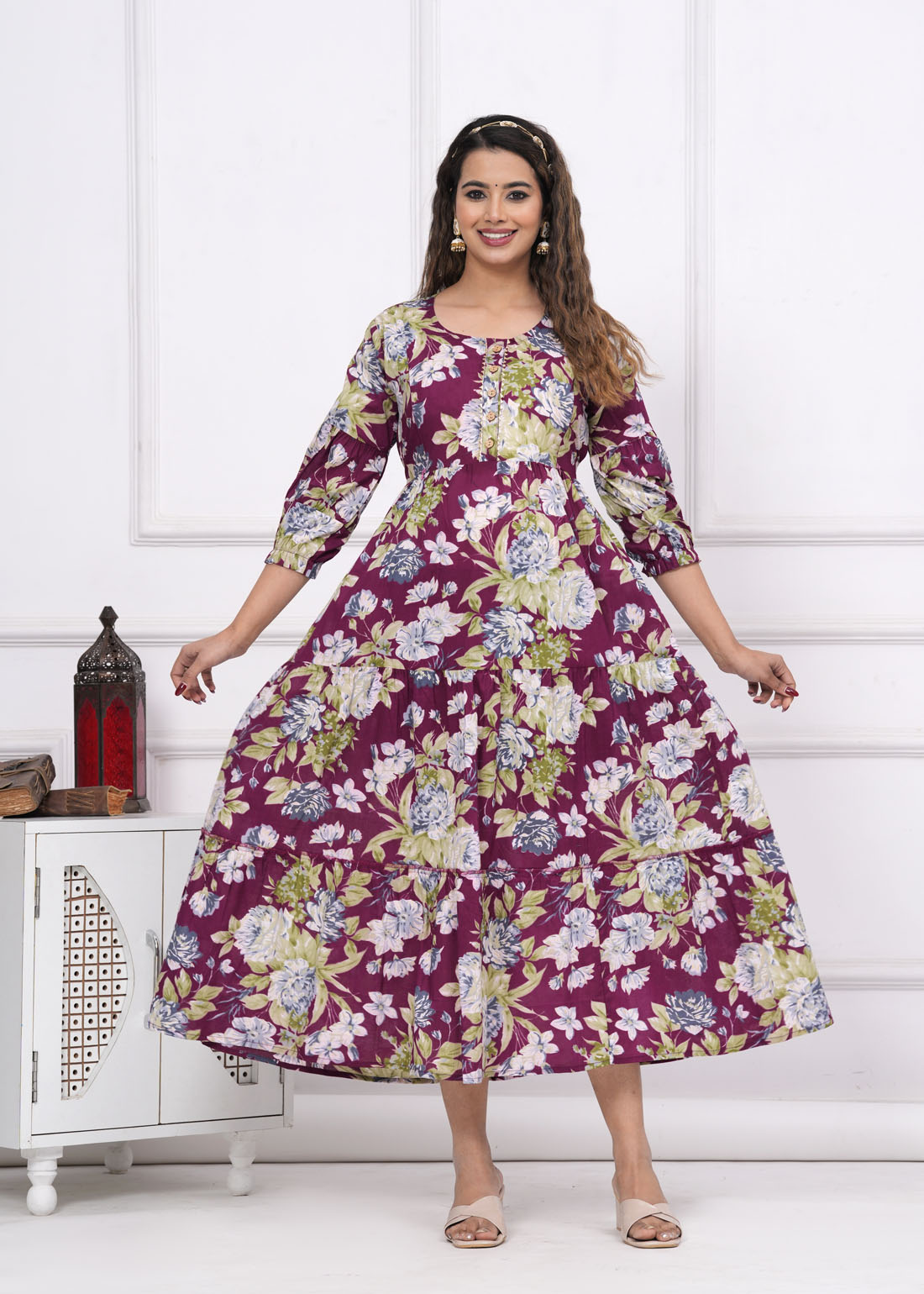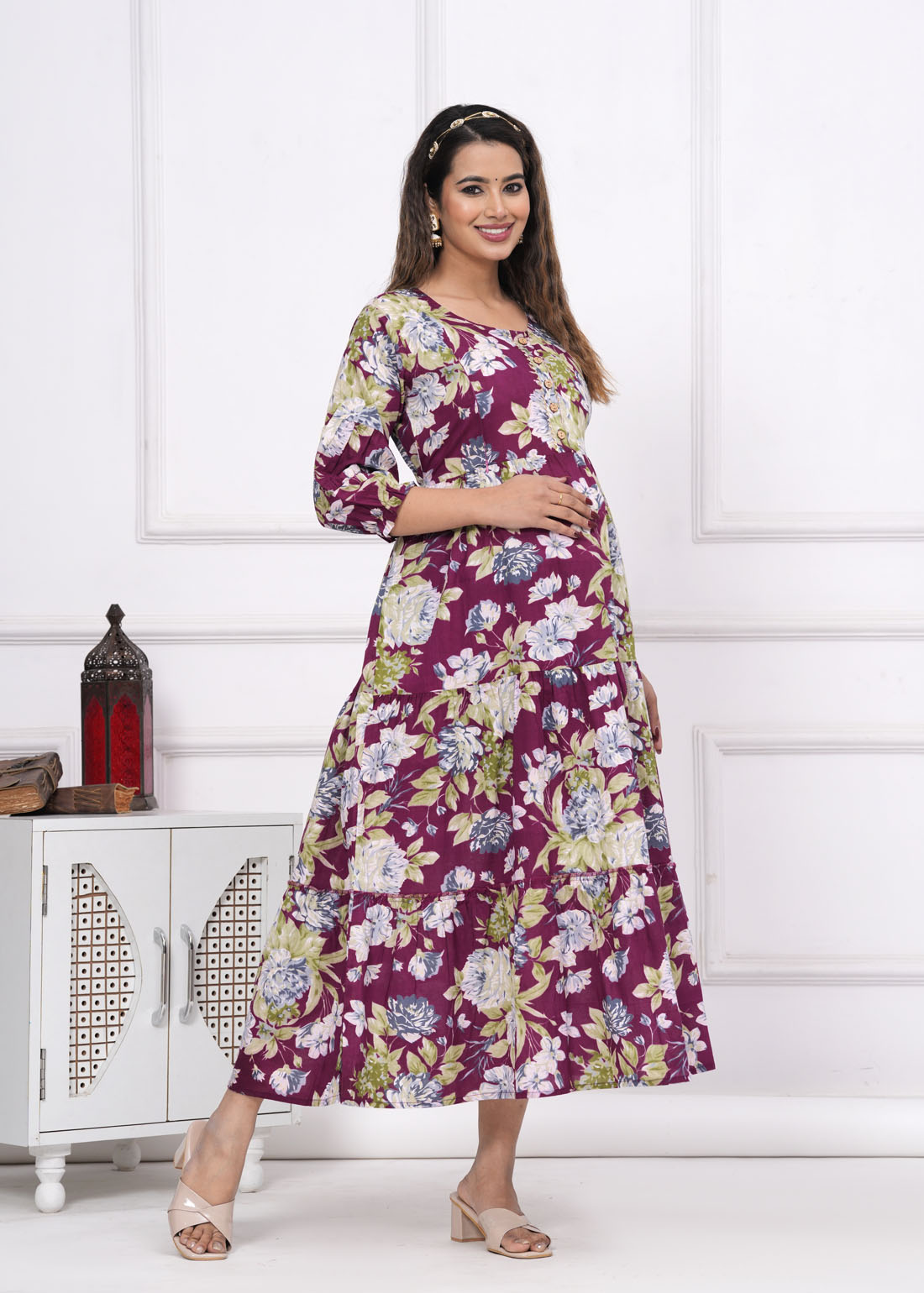 Floral Wine Color Soft Cotton Maternity Baby Feeding Gown Anarkali Kurti with Hidden Feeding Zip