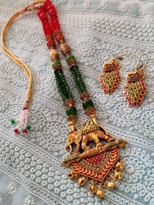 Elephant Indian Long Pendant Handmade Necklace Earrings Set Golden Oxidized Fashion Jewelry