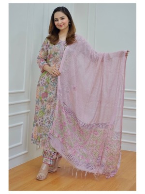 Floral Print Embroidered Straight Kurti Afghani Pant Dupatta Set Indian Salwar Kameez