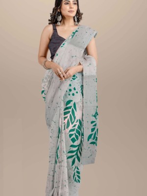 Light Grey Hand Block Printed Mulmul Cotton Saree with Blouse Piece for Women
