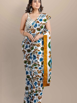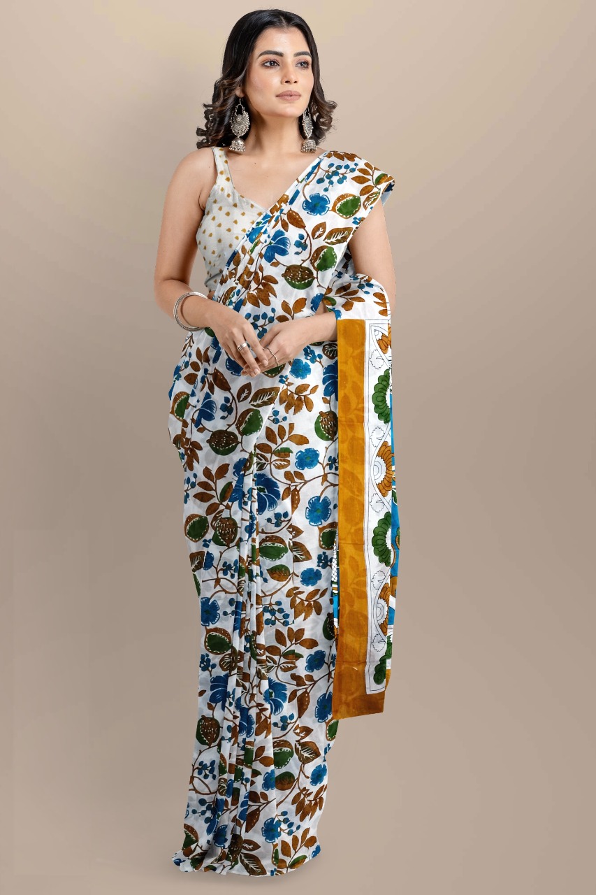 White Floral Mulmul Cotton Saree Hand Block Printed with Blouse Piece for Women