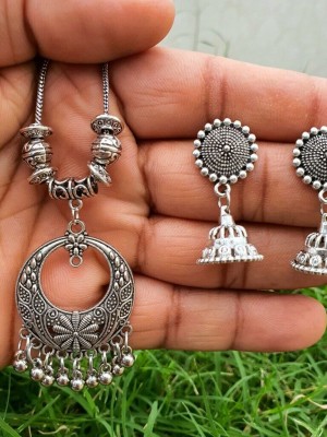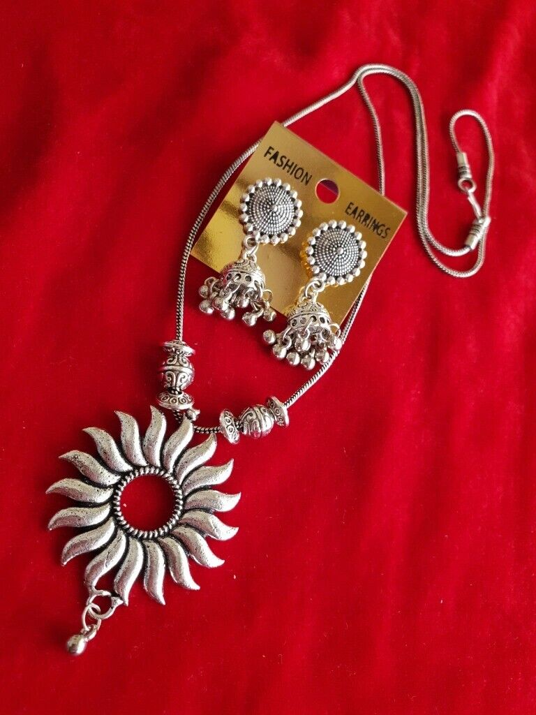 Sun Pendant Necklace Earring Set Women Silver Plated Oxidized Chain Alloy
