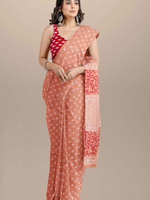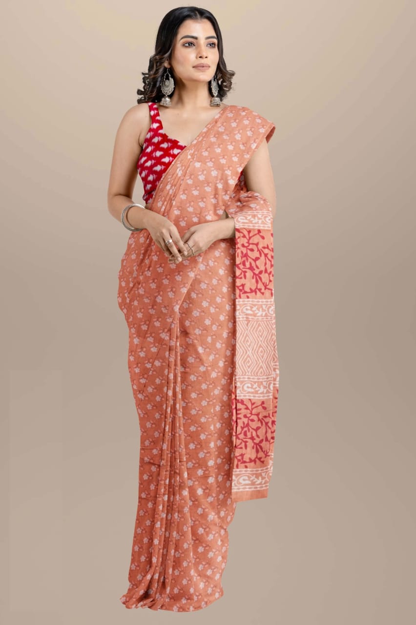 Peach Mulmul Cotton Saree Hand Block Printed with Blouse Piece for Women