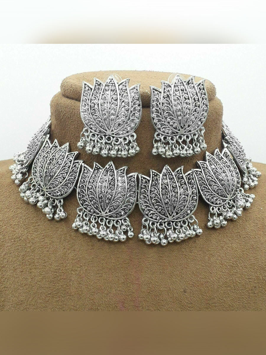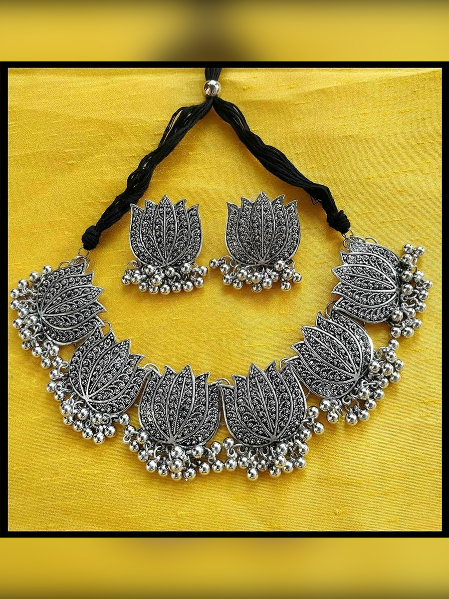 Lotus Bohemian Silver Oxidized Necklace Afghani Bollywood Jewelry Sets